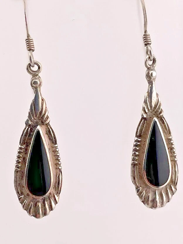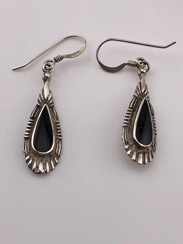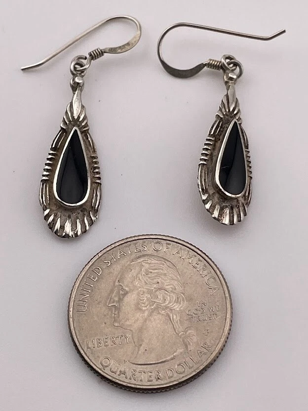 SU 925 STERLING SILVER BLACK ONYX TEARDROP DANGLE EARRINGS 1 3/4" SOUTHWEST 419 ****************************** Thank you for your interest in our jewelry. We?d like to introduce ourselves. We are just a retired couple who love matching our customers with great jewelry. We?re not professional jewelers. To have the best shopping experience we like to recommend the following: Please measure your hand, wrist, finger or neck to ensure the best fit. We can use your measurements to help with sizing. Please ask all the questions you want. We know some stuff and, if we don?t, we?ll do the research. We like to learn too. More Stuff: If an item is described as ?gold over 925 sterling silver? this means it is gold vermeil. Vermeil is the process by which a layer of gold (usually 14k or 18k) is bonded to sterling silver. We only clean with gentle soap and warm water to avoid damage. The items we sell may be new or pre-owned and may have normal wear, slight damage, and/or tarnish. We make every effort to ensure the items we sell are as described. This includes testing to confirm metal purity if the item isn?t marked, and testing for gemstone identity. We try to put measurements in the jewelry description and include a photo of each piece with a U.S. quarter (25mm).