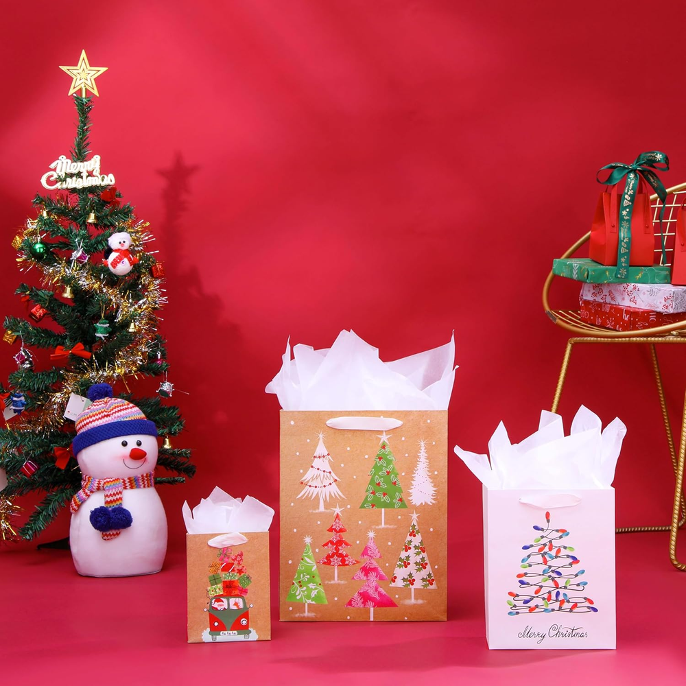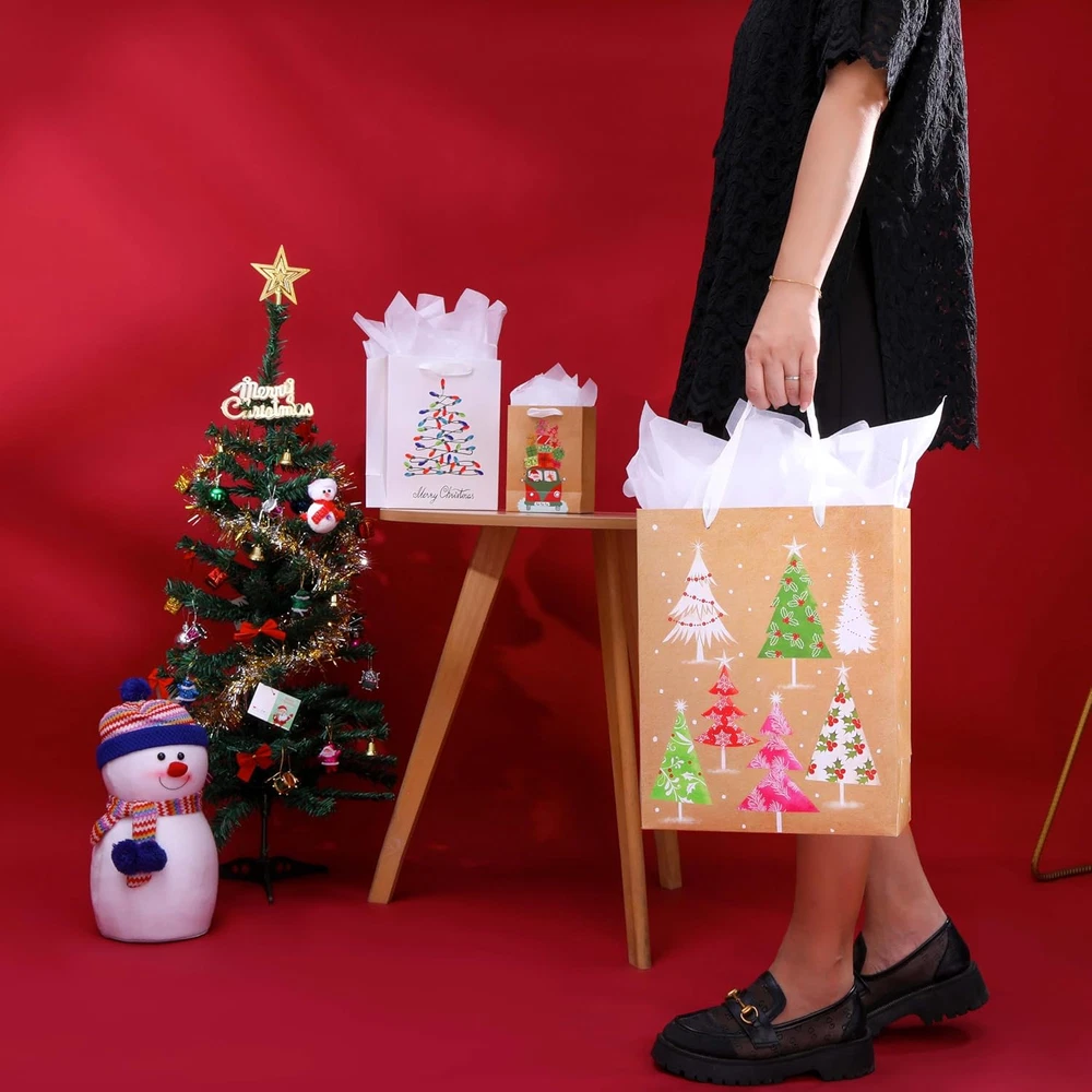 Assorted Sizes-- Large bags:13" * 10.2" * 5.5", Medium bags: 9" * 7" * 4", Small bags:6.3" * 4.7" * 2.4". 3 bags for each design, 9 bags in total. 18 sheets of white tissue paper in total. These assorted Sizes of Christmas holiday theme gift bags are perfect for birthday treat bags, goodie bags, party bags, gift bags, party favor bags, holiday gift bags, Xmas Gift Bags, retail bags, and more. Product Description Christmas Gift Wrappings - Wrap the Holidays in Vibrant Cheer! Add to Cart Add to Cart Add to Cart Add to Cart Add to Cart Customer Reviews 4.8 out of 5 stars 60 4.8 out of 5 stars 98 4.7 out of 5 stars 86 4.8 out of 5 stars 100 4.7 out of 5 stars 386 Price $9.99 $ 9 . 99 $13.99 $ 13 . 99 $9.59 $ 9 . 59 $12.99 $ 12 . 99 $18.99 $ 18 . 99 Size 13" 13", 9" 13", 9", 6" 13", 9", 6" 13", 11", 9" Count 3 6 9 9 24 Dessign 3 6 3 3 6 Tissue Paper 9 red tissue paper 12 white tissue paper 18 white tissue paper 18 white tissue paper 24 white tissue paper Material cardstock cardstock cardstock cardstock kraft paper SUNCOLOR Charming Christmas Gift Bags for Joyful Giving Wrap your gifts in festive style with our gift bags, Impress and make every present memorable. SUNCOLOR Luxurious Christmas Boxes for Perfect Presents Impress with our elegant Christmas gift boxes, enhances your holiday gifting. SUNCOLOR Festive Christmas Tissue Paper for Every Gift Add the final touch with our Christmas tissue paper. Make each gift extra special this season. 1 Gift Bags 2 Gift Boxes 3 Tissue Paper The video showcases the product in use. The video guides you through product setup. The video compares multiple products. The video shows the product being unpacked.