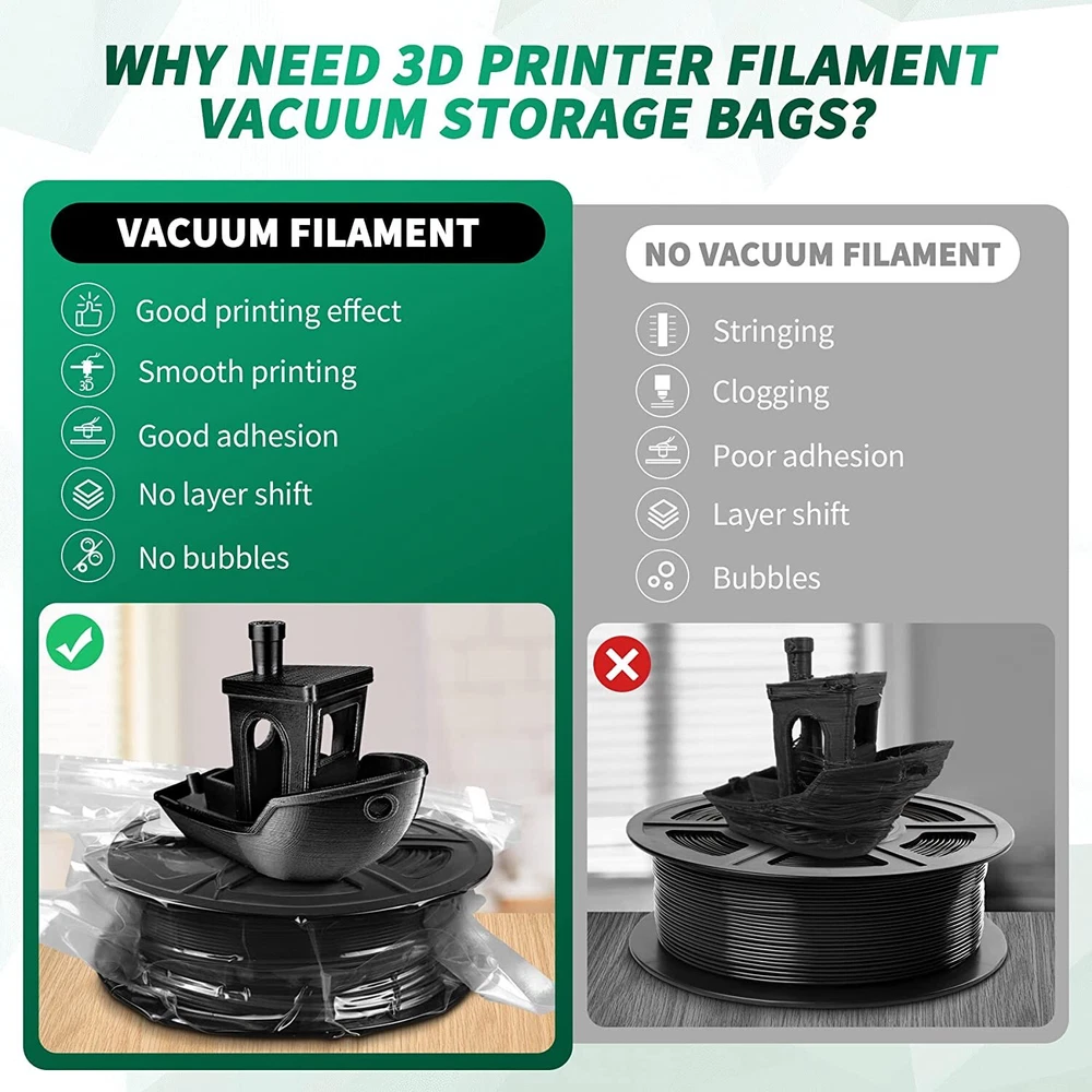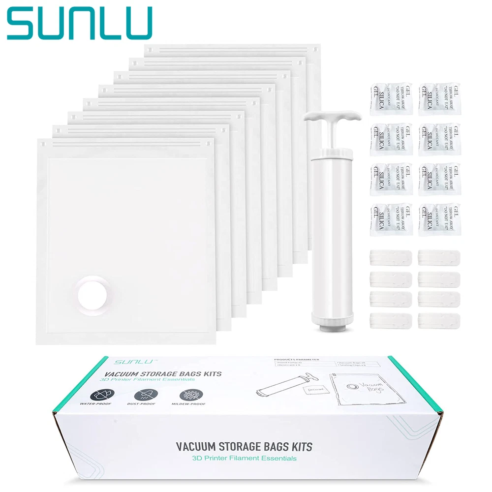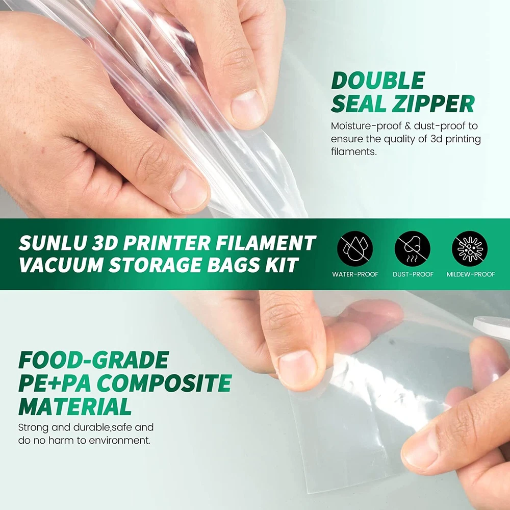 Packing List - SUNLU 3D printer filament vacuum storage kits including: 8*vacuum bags, 1*hand pump, 8*sealing clips, 8*desiccants. SUNLU filament vacuum bags size: 32*34CM(12.59*13.38inch). It can accommodate 0.5KG/0.75KG/1KG 3D printing filaments and 1.75mm/2.85mm/3mm 3D printer filaments. Good Moisture Sealing Effect - Durable SUNLU 3D printer filament vacuum bags can quickly expel air in 30 seconds to protect 3D printer filament from moisture, effectively waterproof, moisture-proof and dustproof.The filament vacuum storage bags has eavy-duty valve and double sealing zipper provide airtight protection. Quality Materials - SUNLU 3D printer filament vacuum storage bags food grade material PA+PE material, thickened design, tough and durable to prevent breakage and air leakage, reusable. Transparent vacuum bags is easy to find and observe the status of filaments. Easy to Use - ①Place 3D printer filaments and desiccant in the vacuum bag. ②Seal the vacuum bag with the sealing clip. ③Use hand pump to remove excess air. ④Cover with sealed air leak prevention holes. High Compatibility - SUNLU 3D printer filament storage bags is specially designed for 3D printing filament, compatible with all 0.5KG/0.75KG/1KG/1.1KG 3D printer filaments and other 1.75mm/2.85mm/3mm 3D printing filaments. Double Seal Zipper Moisture-proof & dust-proof to ensure the quality of 3d printing filaments. PE+PA Composite Material Strong and durable,safe and do no harm to environment. Sealed Air Valve Design Prevent air leakage and avoid moisture in 3d printer filament. Lightweight Hand Pump Easy to pump, can fastly darin the air within 30s. Save time and effort when pumping. AirWolf BigBox CraftUnique Dremel Kossel Markforged PowerSpec Robo 3D Aleph Objects CEL CubePro e-NABLE Lulzbot New Matter Printrbot SeeMeCNC Anycubic colorFabb Cubicon E3D MakerBot Ooznest Prusa Simplify3D BCN3D CraftBot Doob FlashForge Makergear OrdBot Prusa Research SUNLU Beeverycreative Ultimaker XYZprinting Zortrax Zenith Compatible with 99% of FDM 3D Printers