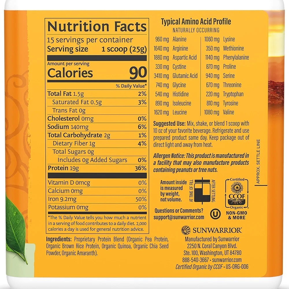 SUNWARRIOR Organic Classic Plus Natural, 13.2 oz Vegan Protein Powder Supplement. Packed with 5 powerful superfood sources. A blend of five potent, superfood organic proteins: Yellow Pea Brown Rice, Chia Seed, Quinoa, Amaranth. Gentle on Digestion with Nutrient Dense Protein. Classic Plus includes potent BCAAs and complete essential amino acids, natural fiber, vitamins, and minerals. Plant Based Equivalent of Whey Protein. With 17 to 20 Grams of protein per serving (varies by flavor), Fit and Lean formula with 100 calories and 4g carbs or less per serving, Sprouted and fermented ingredients. Clean Ingredients. USDA Certified Organic, Low Carb, High Protein, Non GMO, Vegan and Plant Based; Soy Free, Dairy Free, No Added Sugar & Gluten Free. Paleo, Kosher & Keto Friendly. Give your body an extra edge with Sunwarrior. Mix this superfood powder into your vegan protein shake, yogurt, ice cream, energy drinks & smoothie. Best loved by chefs, athletes, fitness gurus, yogis, health enthusiasts, and active souls. Sunwarrior protein classic plus dietary supplement is made using branched chain amino acids, grain-like seed superfoods and a whey equivalent for a delicious and nutritious supplement that gives you protein while being completely plant-based. The powder in this 13.2 ounce container is sprouted, fermented and packed with fiber, yet is still gentle on your digestive system. Each single-scoop serving contains 48% of the recommended daily value of vitamin c.