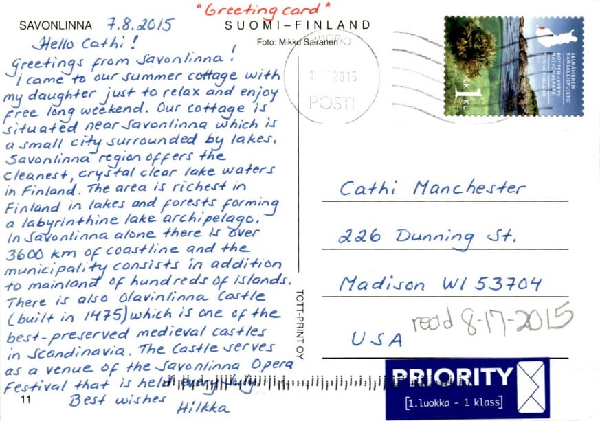 MAKE AN OFFER. THE MORE YOU BUY THE BETTER DEAL I WILL ACCEPT The postcard is from Hilkka in Savonlinna, Finland, to Cathi in Madison, Wisconsin. Hilkka describes their visit to their summer cottage near Savonlinna, a small city surrounded by lakes with crystal clear waters.