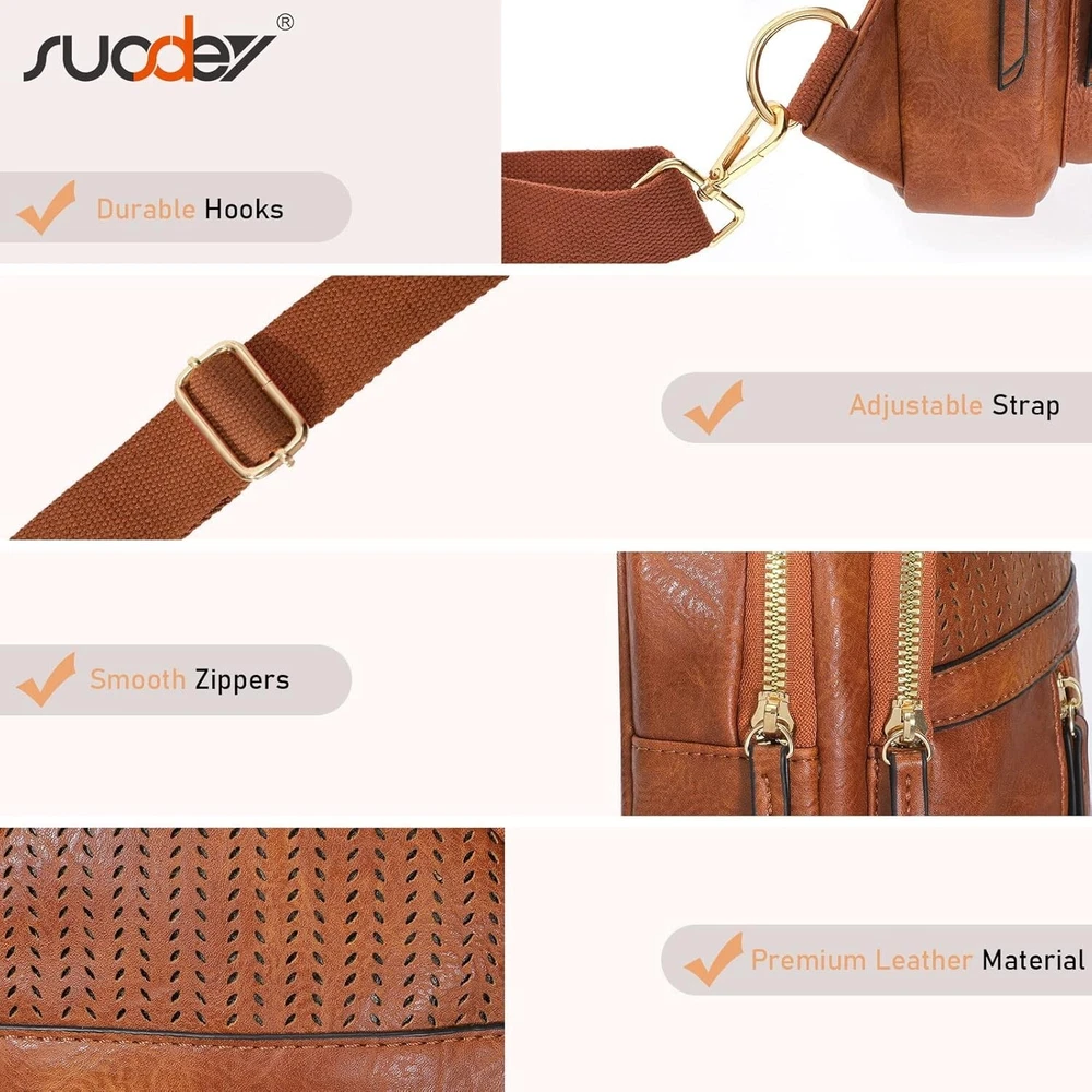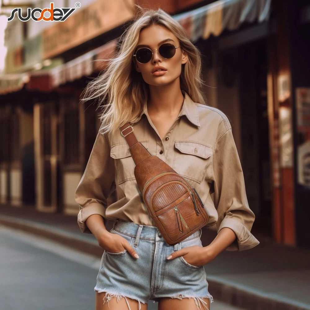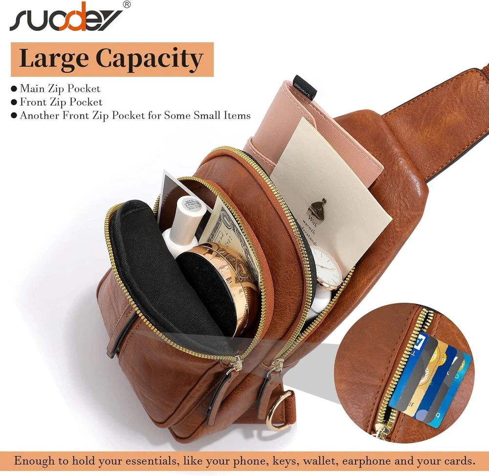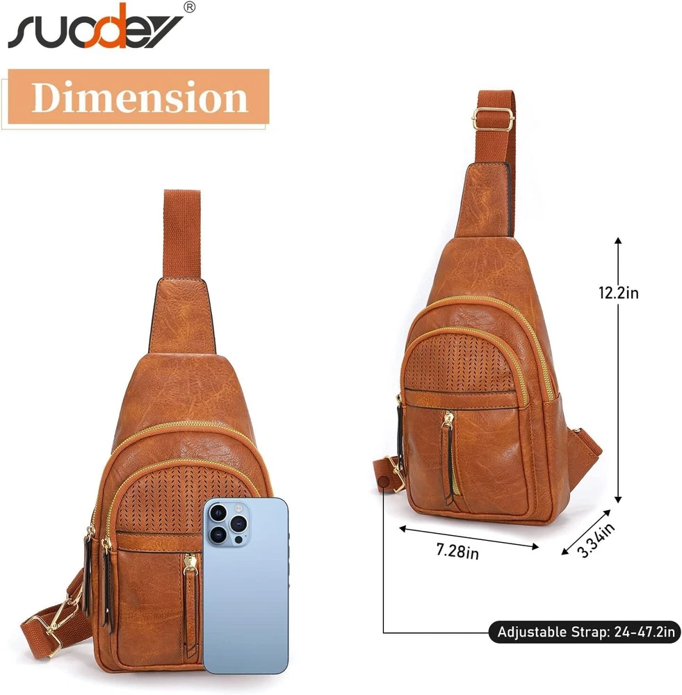 SUOSDEY 2024 Sling Bag for Women Leather Crossbody Bags for Women Trendy Chest Item Description: 【Large Capacity】-- Comes with 1 main zip pocket and 1 large front zip pocket and 1 small front zip pocket that fits some small items, this sling bag is big enough to hold your cellphone, wallet, keys, earphone, cards and other small valuables you may need while going out. Smooth zipper makes it easily accessible to find your what you need. 【Multi-way to Carry】-- Weighs 0.8lbs, measure: 12.25"(H) x 7.28"(L) x 3.34"(W) (Please refer to our video due to the angle), this fanny packs for women with perfect size fits all body types and can be worn over the shoulder across the chest or back by Right & Left D-rings. You can use it as a sling bag or chest bag even a shoulder bag. With adjustable straps from 24 to 47.2in, you can tighten or loosen them according to your needs. 【High Quality Material】-- This crossbody sling bags for women is made with premium faux leather, durable and stylish. Plus with nylon shoulder straps, it will not wear out due to frequent adjustments compared with leather straps. With unique hollow pattern design that is SUOSDEY’s designer exclusive design, not easy to hit in the market. This crossbody fanny packs for women is lightweight and easy to carry all your essentials while matching any outfit and keeping a chic look. 【Suitable for Various Occasion】-- This sling bag for women crossbody purse all at once keeping your hands free so you can enjoy more. Whether you're going on a run, commuting, dating, camping, hiking, dancing at a music festival, walking the dog, traveling or just want to keep your essentials close. This body bag for women is a perfect choice for keeping your essential belongings safe.