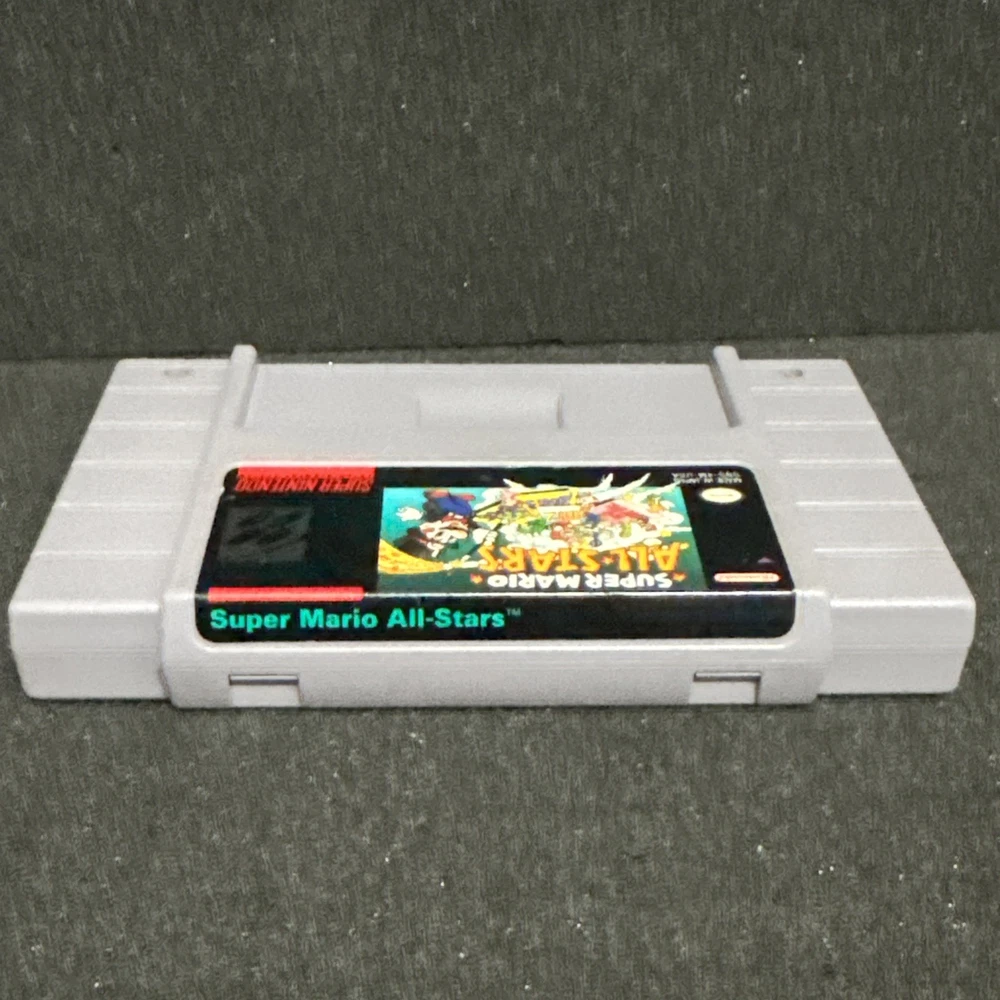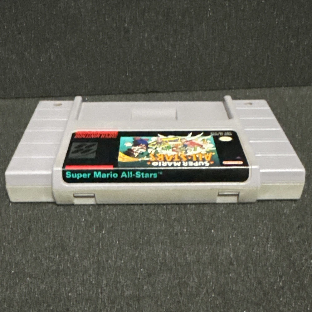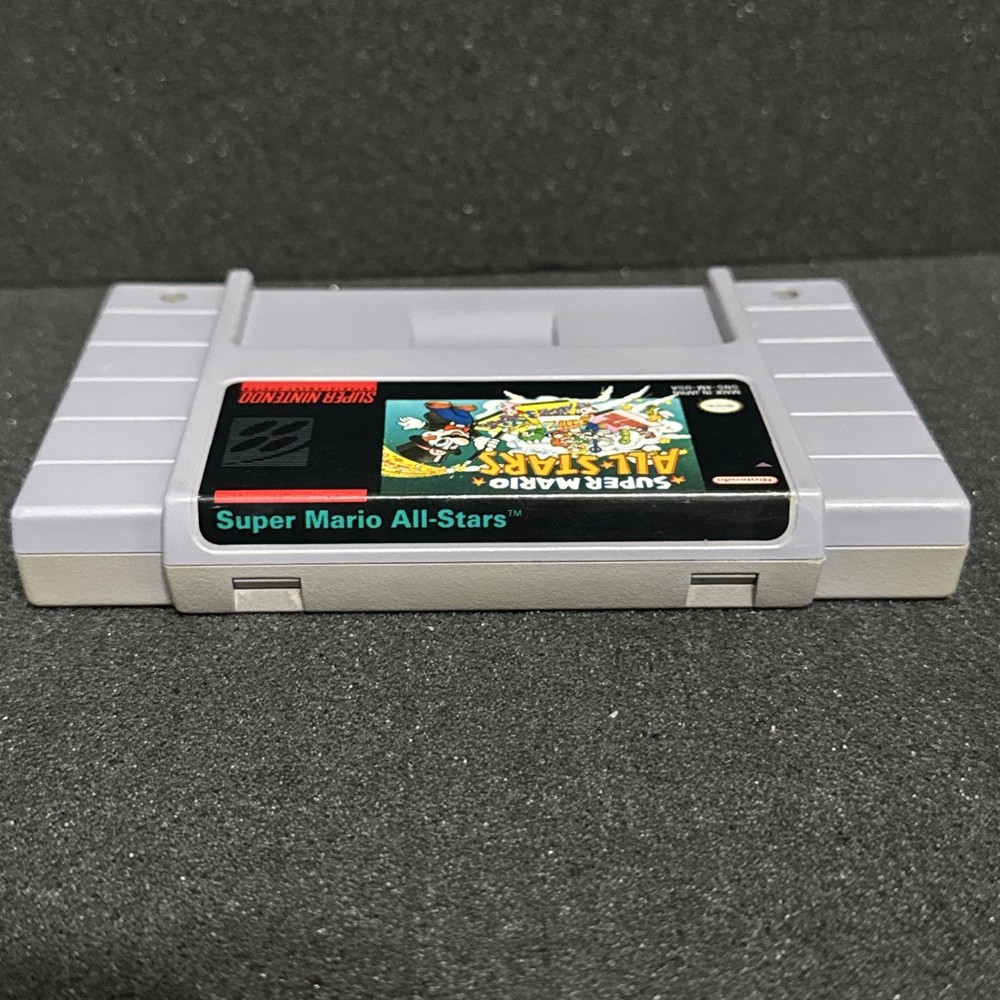 A little yellowing on back of cart and label on back is missing or ripped. Look at pictures before purchasing. The product is a Super Mario All-Stars cartridge for the Nintendo Super Nintendo SNES platform. Published by Nintendo, this game is part of the Super Mario video game series and has a rating of E for Everyone. The cartridge has been tested and is guaranteed to work on NTSC-U/C (US/Canada) SNES consoles. With multiplayer features, this classic game offers hours of entertainment for fans of the iconic plumber Mario.