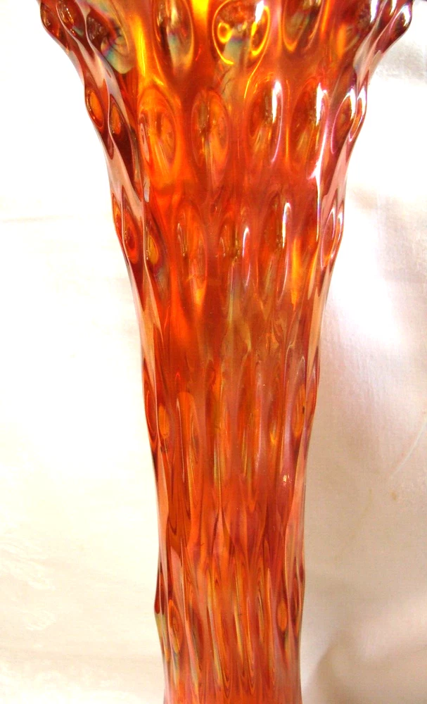 This is one of several pieces of really nice and beautiful glassware I am listing today. This all came from same estate sale of a woman that collected high end decorative glassware. Most of this is not marked and I am going by what I was told or by internet research on maker so please look at pictures and decide for yourself who made these beautiful pieces. All pieces unless noted are in great condition with no chips or cracks found. This piece is a super nice marigold rustic swung glass vase possibly by FENTON. It is 16 1/4" tall x 4 1/4" across at base. I will be glad to combine won auctions when size and weight permit so thanks and please check out my other auctions.