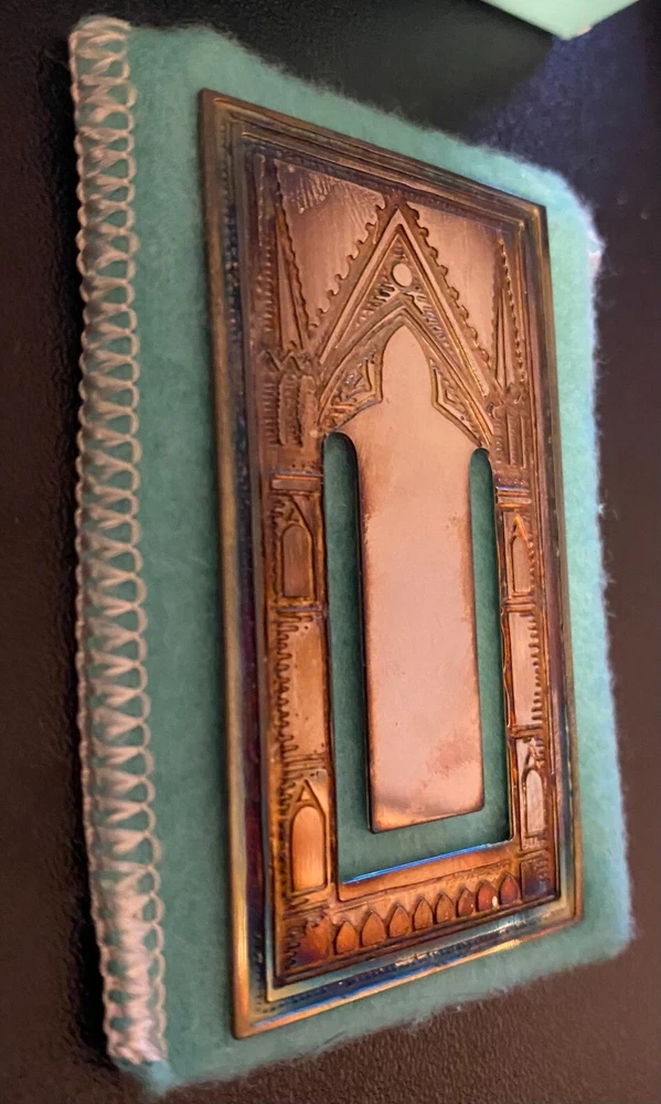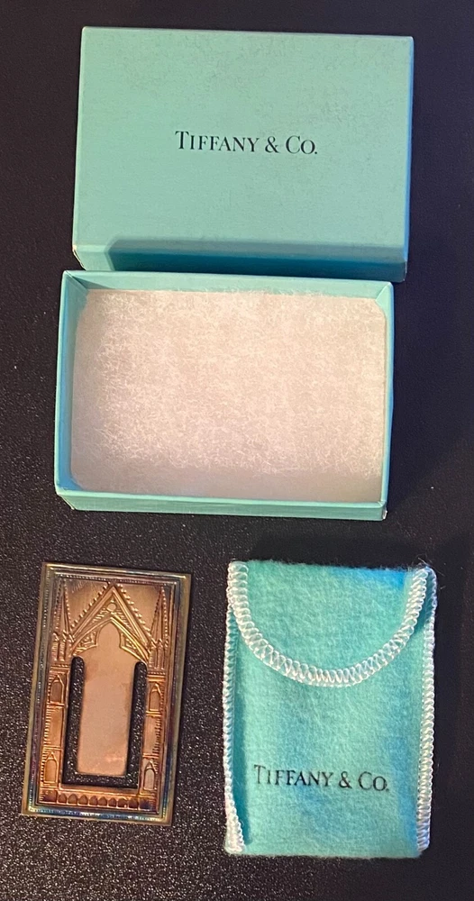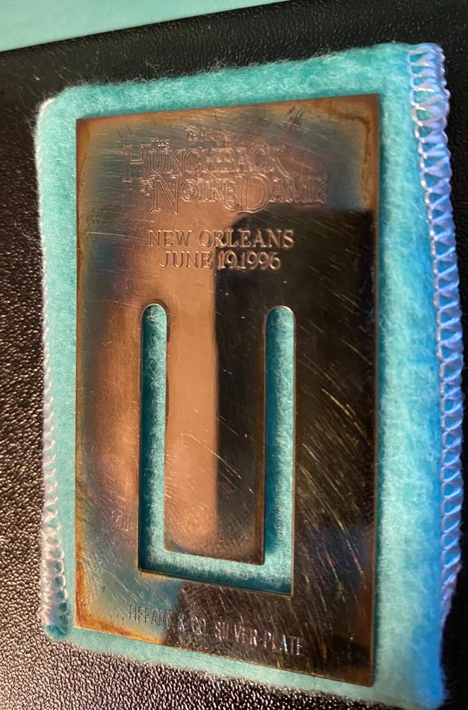 SUPER RARE Tiffany & Co. Disney's Hunchback of Notre Dame Silver Plate Bookmark. Item was from the World Premiere of Disney's Hunchback of Notre Dame at the Louisiana Superdome on June 19, 1996. The front of the bookmark displays the cathedral design, and the movie title and date are inscribed on the back of the bookmark. The silver plate currently has the patina shown in the photos but can be polished if desired. Item is sold as pictured and ships with USPS Ground Advantage or Priority Mail.