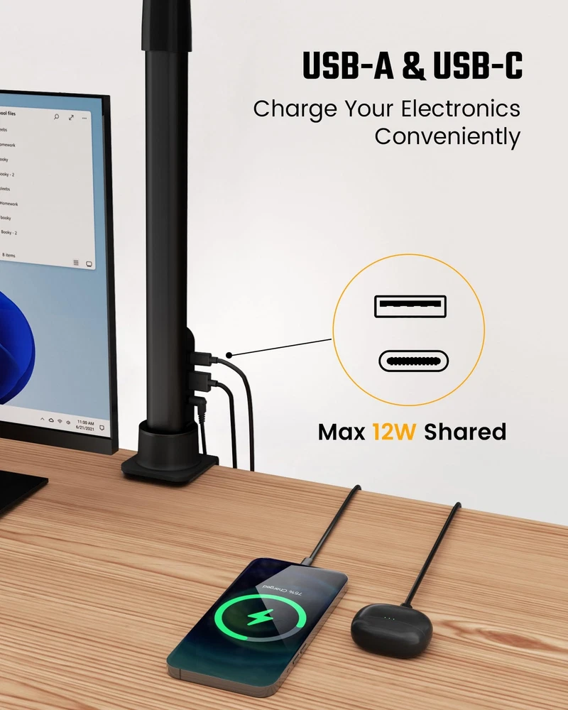 SUPERDANNY LED Desk Lamp for Home Office with USB Charing Ports Gooseneck Architect Clamp-on Desk Lamp with 5 Light Colors Smooth Dimming Touch and Hand-Wave Control for Reading, Crafting,Gaming