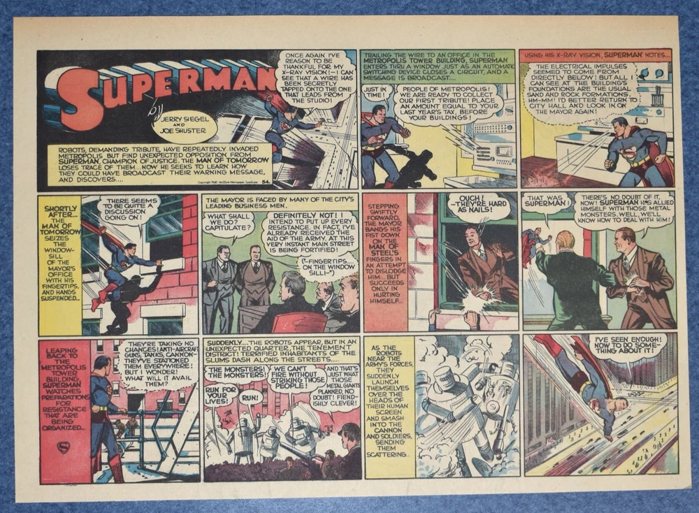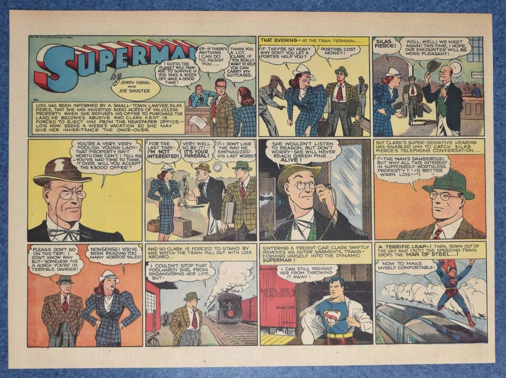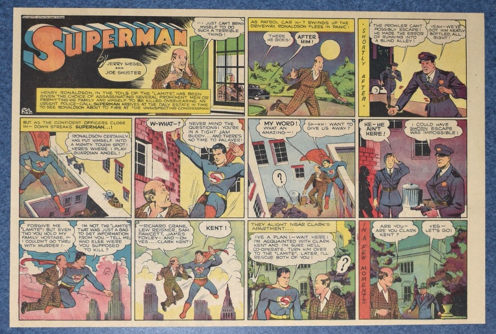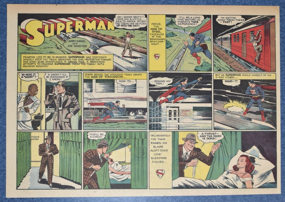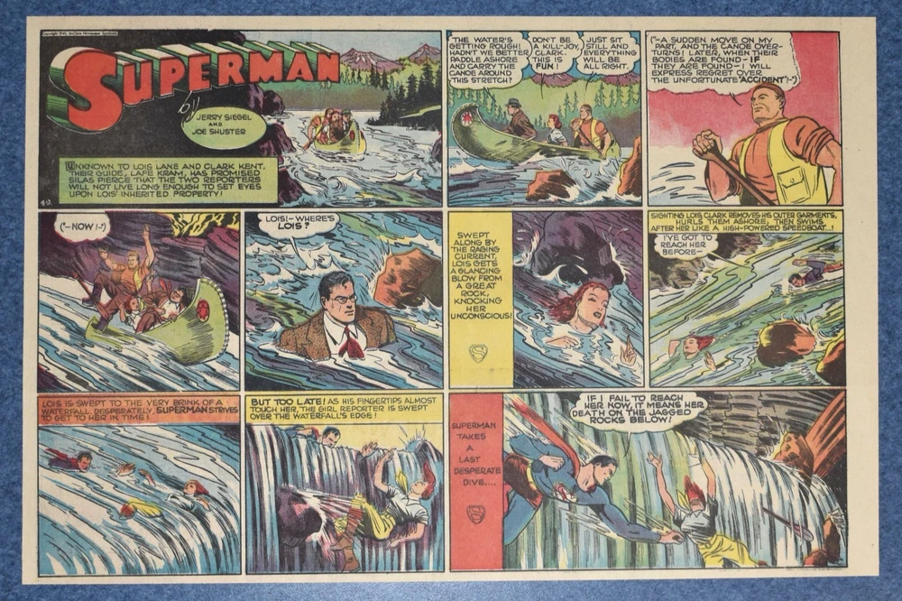SUPERMAN Jerry Siegel and Joe Shuster 1940 D escription Year: 1940 (#27 through 61...starting in May) Count: 35 Sunday Comics Newspaper: The Kansas City Star Size: Approximately 1/2 of a page in size. The exact size varies depending on the margin, but the cut sheets are approximately 36.5 x 24.9 cm including margins, or about 14.4 x 9.8 inches. In general, the height varies a fair bit (size provided is a smaller estimate). 1940 D ATES P RESENT Month Date Contents of Reverse Side and/or Notes May 5 Winnie Winkle (1/3 pg) 12 Bringing Up Father (1/2 pg) 19 Partial comics 26 Rosie's Beau (topper) Jun 2 Bringing Up Father (1/2 pg) 9 Gasoline Alley (1/2 pg) 16 Partial comic and partial ad 23 Partial comic and partial ad 30 Partial comics Jul 7 Partial comic and Herby (footer strip comic) 14 Sappo and Wimpy's Zoo's Who! (1/3 pg) 21 Gasoline Alley (1/2 pg) 28 Bringing Up Father (1/2 pg) Aug 4 Rosie's Beau (topper) 11 Bringing Up Father (1/2 pg) 18 Rosie's Beau (topper) 25 Bringing Up Father (1/2 pg) Sep 1 Moon Mullins (1/2 pg) 8 Moon Mullins (1/2 pg) 15 Dick Tracy (1/2 pg) 22 Rosie's Beau (topper) 29 Partial comic Oct 6 Partial comic and partial ad 13 Gasoline Alley (1/2 pg) 20 Partial comic 27 Smitty (1/3 pg) Nov 3 Aunt Min and Tillie the Toiler Fashion Parade Paper Dolls (1/3 pg) 10 Gasoline Alley (1/2 pg) 17 Popeye (1/2 pg) 24 Bringing Up Father (1/2 pg) Dec 1 Partial comic 8 Moon Mullins (1/2 pg) 15 Partial comic and partial ad 22 Partial comic 29 Smitty (1/3 pg) Dates Highlighted in Blue Present C ondition Here are some general condition notes for this set of comics: There are a few small tears around the edges in the margins (larger tears are mentioned below). These comics are old and tanned, but can be handled with ease. Some dates, and/or edges, might be more tanned than others. Condition notes are predominately focused on the comic on the front side (comic featured for the auction). The color register is sometimes off a bit, but the printing generally pretty really good with these comics (nice color). Examine the photos to see how the comics look. Some dates have some slight ink transfer, but this is normally pretty minor. We also observed light ink bleed-through...this was more common (did not note every case...many dates have at least a little of this condition) . The date in normally written in the margin of the reverse side (either front or back side). We also made some notes of some date specific issues (we tried to avoid making too many notes, and instead preferred to go the generalized condition notes above). This should serve as a guide to the condition of the set, it is possible that we have not caught everything: INDIVIDUAL DATE CONDITION NOTES 5-5 (#27) The color register is off a tiny bit. 5-12 (#28) Some light ink transfer and/or bleed-through. The color register is also off a little bit. 5-19 (#29) The color register is off a tiny bit. 6-16 (#33) Some light ink transfer and/or bleed-through. 6-23 (#34) The color register appears to be off a tiny bit. 6-30 (#35) Small interior tear at the centerfold line (perpendicular...about 0.9 cm). 7-14 (#37) Some light ink transfer and/or bleed-through and there is some really light ink transfer. 7-21 (#38) The color register is off some ( see photo ). There is also some light ink transfer. 7-28 (#39) Some light ink transfer and/or bleed-through. There is also a 1 cm tear, approximately, on the bottom (mostly the margin). 8-11 (#41) Some light ink transfer and/or bleed-through. 8-18 (#42) Some light ink transfer and/or bleed-through. One panel seems to have some text that was covered up and/or not printed ( see photo ). 9-1 (#44) Some light ink transfer and/or bleed-through. 9-8 (#45) The color register is off slightly. 9-15 (#46) Large taped repair on the top front side with old brown dried out tape ( see photo ). 9-29 (#48) The color register is off a tiny bit. 10-6 (#49) The color register is off a little bit. 10-13 (#50) The color register is off a tiny bit. 10-27 (#52) The color register is off a tiny bit. 11-3 (#53) The color register is off a tiny bit. 11-24 (#56) The color register is off a little ( see photo ). 12-1 (#57) Multiple small tears. Two go slightly into the comic (less than one inch each) and one goes right to the edge of the comic. 12-8 (#58) Some light ink transfer and/or bleed-through. 12-15 (#59) Some light ink transfer and/or bleed-through. There is also a little moderate ink transfer near the centerfold line. 12-22 (#60) There is some light ink transfer across the comic. 12-29 (#61) There is some light to somewhat moderate ink transfer ( see photo ). The color register is also off a tiny bit. S hipping Shipping cost is dependent on weight, and this comic weighs 13 ounces . If more then one item is purchased we will combine shipping and recalculate the shipping cost. Items typically ship within 3-4 days (often even faster). C ombined S hipping This item may typically be combined with other newspaper comic strips, but this will not happen automatically at checkout (combined shipping has to be estimated). This can also be handled after checkout. Shipping cost on combined orders will depend on the size and weight of the package. This item will be shipped from ARIZONA .