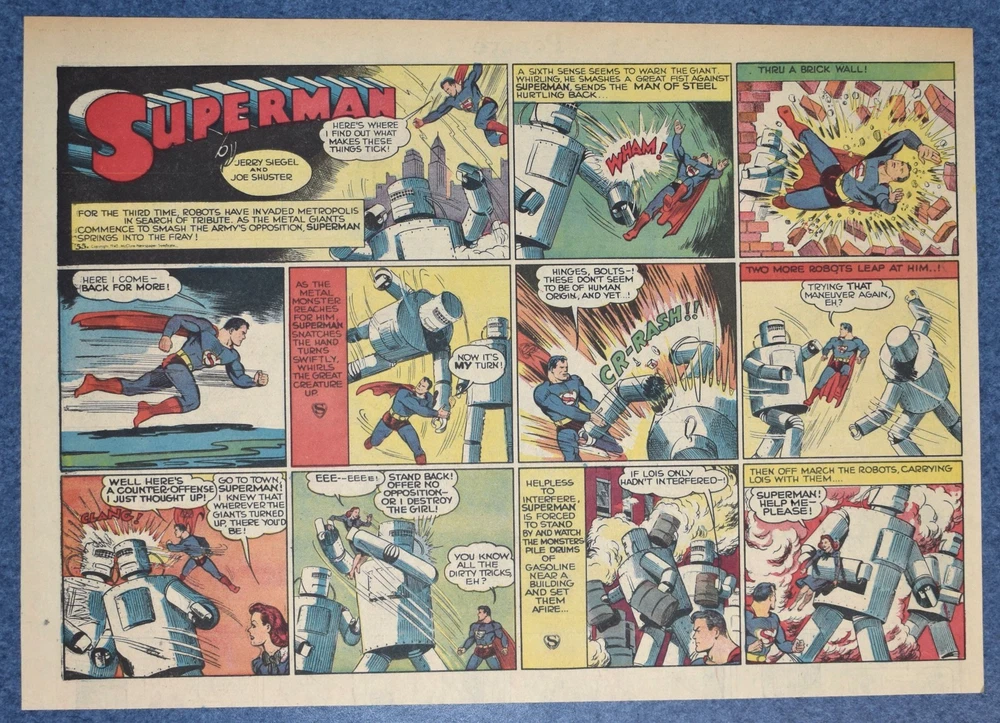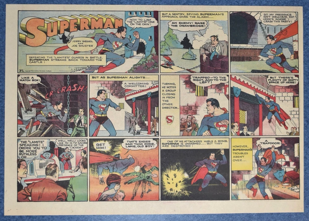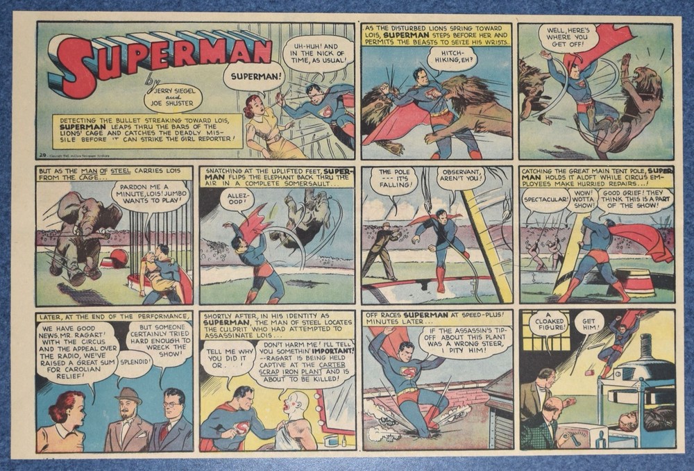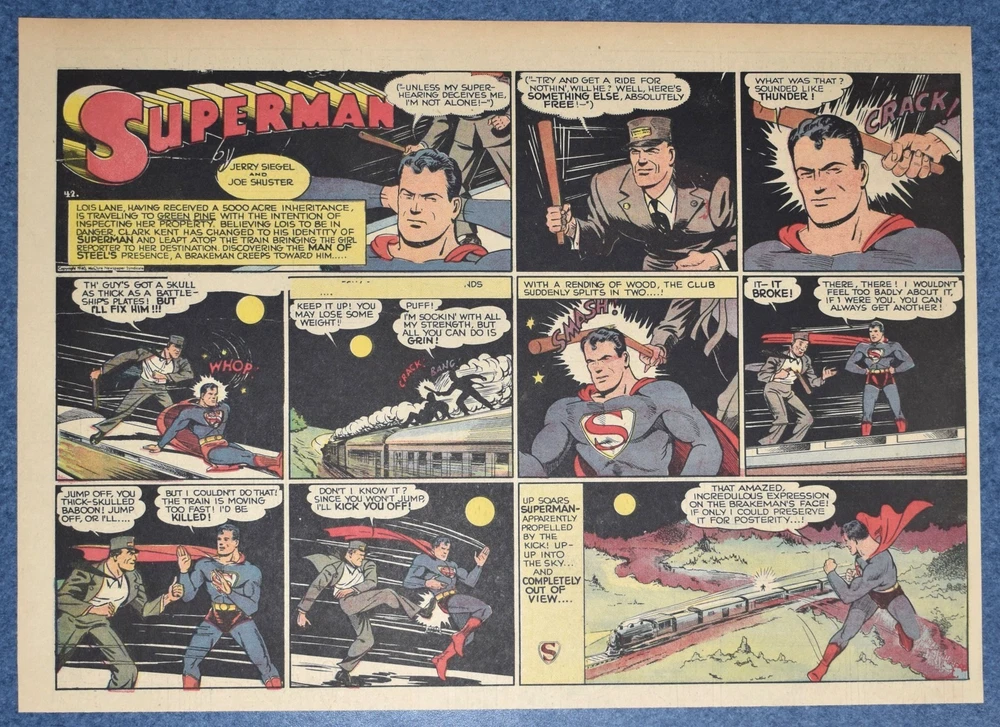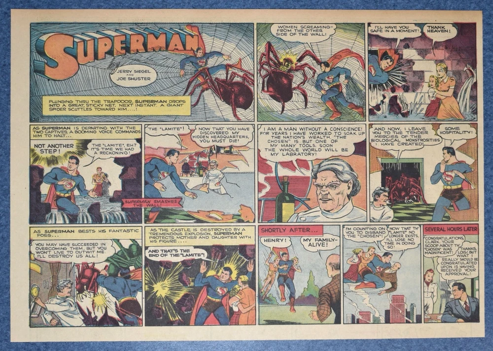 SUPERMAN Jerry Siegel and Joe Shuster 1940 D escription Year: 1940 (#27 through 61...starting in May) Count: 35 Sunday Comics Newspaper: The Kansas City Star Size: Approximately 1/2 of a page in size. The exact size varies depending on the margin, but the cut sheets are approximately 36.5 x 24.9 cm including margins, or about 14.4 x 9.8 inches. In general, the height varies a fair bit (size provided is a smaller estimate). 1940 D ATES P RESENT Month Date Contents of Reverse Side and/or Notes May 5 Winnie Winkle (1/3 pg) 12 Bringing Up Father (1/2 pg) 19 Partial comics 26 Rosie's Beau (topper) Jun 2 Bringing Up Father (1/2 pg) 9 Gasoline Alley (1/2 pg) 16 Partial comic and partial ad 23 Partial comic and partial ad 30 Partial comics Jul 7 Partial comic and Herby (footer strip comic) 14 Sappo and Wimpy's Zoo's Who! (1/3 pg) 21 Gasoline Alley (1/2 pg) 28 Bringing Up Father (1/2 pg) Aug 4 Rosie's Beau (topper) 11 Bringing Up Father (1/2 pg) 18 Rosie's Beau (topper) 25 Bringing Up Father (1/2 pg) Sep 1 Moon Mullins (1/2 pg) 8 Moon Mullins (1/2 pg) 15 Dick Tracy (1/2 pg) 22 Rosie's Beau (topper) 29 Partial comic Oct 6 Partial comic and partial ad 13 Gasoline Alley (1/2 pg) 20 Partial comic 27 Smitty (1/3 pg) Nov 3 Aunt Min and Tillie the Toiler Fashion Parade Paper Dolls (1/3 pg) 10 Gasoline Alley (1/2 pg) 17 Popeye (1/2 pg) 24 Bringing Up Father (1/2 pg) Dec 1 Partial comic 8 Moon Mullins (1/2 pg) 15 Partial comic and partial ad 22 Partial comic 29 Smitty (1/3 pg) Dates Highlighted in Blue Present C ondition Here are some general condition notes for this set of comics: There are a few small tears around the edges in the margins (larger tears are mentioned below). These comics are old and tanned, but can be handled with ease. Some dates, and/or edges, might be more tanned than others. Condition notes are predominately focused on the comic on the front side (comic featured for the auction). The color register is sometimes off a bit, but the printing generally pretty really good with these comics (nice color). Examine the photos to see how the comics look. Some dates have some slight ink transfer, but this is normally pretty minor. We also observed light ink bleed-through...this was more common (did not note every case...many dates have at least a little of this condition) . The date in normally written in the margin of the reverse side (either front or back side). We also made some notes of some date specific issues (we tried to avoid making too many notes, and instead preferred to go the generalized condition notes above). This should serve as a guide to the condition of the set, it is possible that we have not caught everything: INDIVIDUAL DATE CONDITION NOTES 5-5 (#27) The color register is off a tiny bit. 5-12 (#28) Some light ink transfer and/or bleed-through. The color register is also off a little bit. 5-19 (#29) The color register is off a tiny bit. 6-16 (#33) Some light ink transfer and/or bleed-through. 6-23 (#34) The color register appears to be off a tiny bit. 6-30 (#35) Small interior tear at the centerfold line (perpendicular...about 0.9 cm). 7-14 (#37) Some light ink transfer and/or bleed-through and there is some really light ink transfer. 7-21 (#38) The color register is off some ( see photo ). There is also some light ink transfer. 7-28 (#39) Some light ink transfer and/or bleed-through. There is also a 1 cm tear, approximately, on the bottom (mostly the margin). 8-11 (#41) Some light ink transfer and/or bleed-through. 8-18 (#42) Some light ink transfer and/or bleed-through. One panel seems to have some text that was covered up and/or not printed ( see photo ). 9-1 (#44) Some light ink transfer and/or bleed-through. 9-8 (#45) The color register is off slightly. 9-15 (#46) Large taped repair on the top front side with old brown dried out tape ( see photo ). 9-29 (#48) The color register is off a tiny bit. 10-6 (#49) The color register is off a little bit. 10-13 (#50) The color register is off a tiny bit. 10-27 (#52) The color register is off a tiny bit. 11-3 (#53) The color register is off a tiny bit. 11-24 (#56) The color register is off a little ( see photo ). 12-1 (#57) Multiple small tears. Two go slightly into the comic (less than one inch each) and one goes right to the edge of the comic. 12-8 (#58) Some light ink transfer and/or bleed-through. 12-15 (#59) Some light ink transfer and/or bleed-through. There is also a little moderate ink transfer near the centerfold line. 12-22 (#60) There is some light ink transfer across the comic. 12-29 (#61) There is some light to somewhat moderate ink transfer ( see photo ). The color register is also off a tiny bit. S hipping Shipping cost is dependent on weight, and this comic weighs 13 ounces . If more then one item is purchased we will combine shipping and recalculate the shipping cost. Items typically ship within 3-4 days (often even faster). C ombined S hipping This item may typically be combined with other newspaper comic strips, but this will not happen automatically at checkout (combined shipping has to be estimated). This can also be handled after checkout. Shipping cost on combined orders will depend on the size and weight of the package. This item will be shipped from ARIZONA .