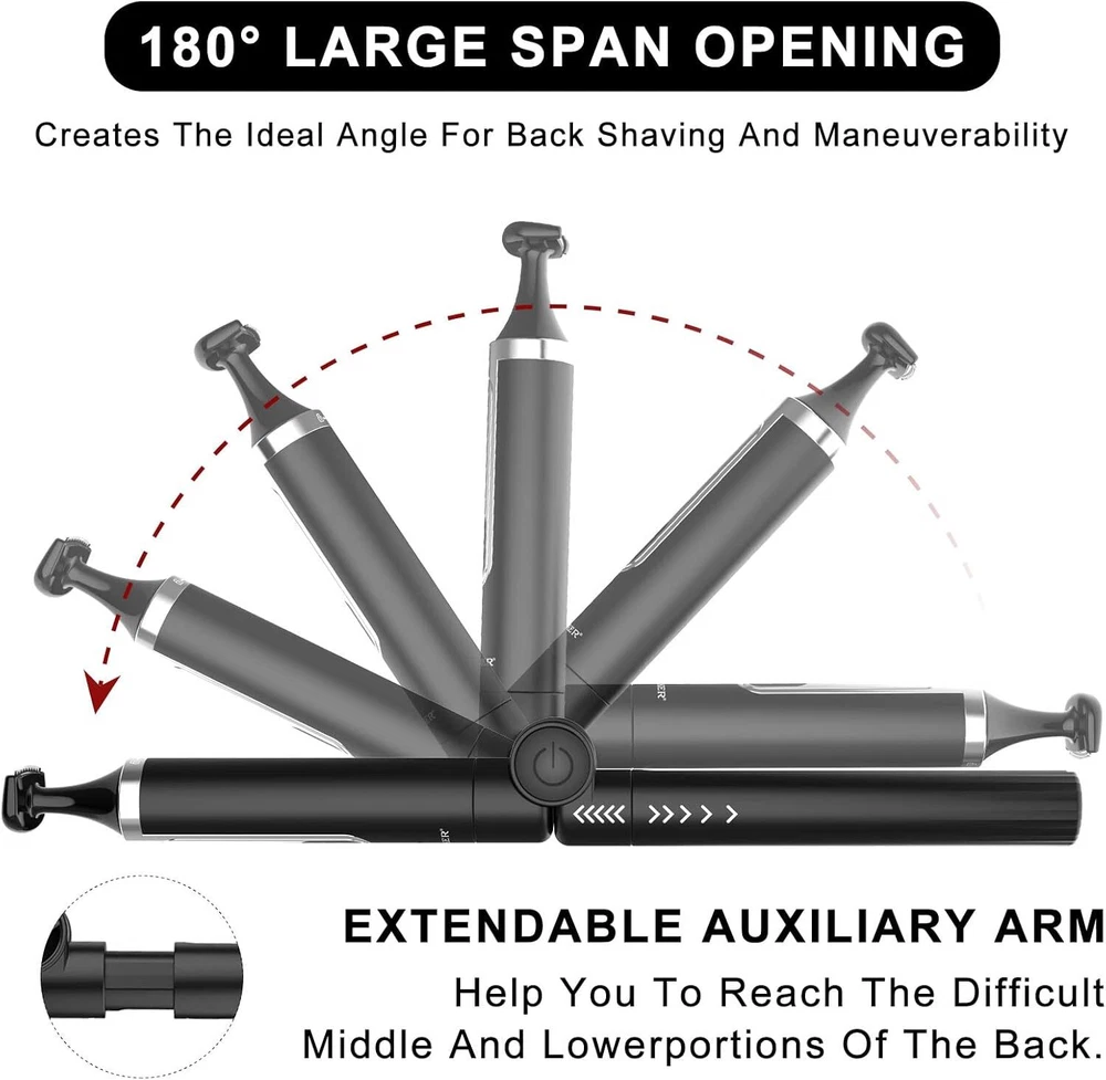 SURKER Body Trimmer Mens Electric Back Shaver Grooming kit Black Product Details Package Dimensions : 9.69 x 6.18 x 2.05 inches; 1.01 Pounds Item model number : RSCX9611 Batteries : 1 AAA batteries required. Manufacturer : SURKER Country of Origin : China Recommended Uses For Product: trimming, shaving Color: Black Hair Type: All Brand: SURKER Power Source: Battery Powered 【Versatile USE】This groomer/shaver kit includes 4 detachable heads:T-blade haircut trimmer head/nose trimmer head/body trimmer head/combination shaving head. Designed for not only for facial trimmings but also for below-the-waist grooming, like back shaving ,arms,legs,body hair.T-balde trimmer equipped 3 guide combs(1/2/3mm),dealing with the haircut,beard trimming,sideburns,precise trimming. 【Adjustable Extension Arm】Detachable extension assist arms with 180°Adjustable Angle design -Allowing you to reach even the most difficult middle and lower back areas when shaving back hair.Auxiliary arm function enables you to reach all areas of your back by yourself with ease and shave off all your back hair effortlessly. 【Two Speed Adjustable】Adjust the high and low speed according to the density of body hair.Powerful motor make every single pass remove hair with no snagging, providing an effective haircut for you. 【Battery Reminder &Travel Lock】Smart charging light indicates when the trimmer need to be charged / cleaned ; lights also shows lock/unlock state.Tracl- Lockg function(hold the on/off button for 2 seconds ) to avoid accidentally touching the switch, travel with convenient to carry.This machine should be charged through the base.Built-in rechargeable battery delivers up to 60-120 minutes of run time per charge by only about 1.5 hours charging. 【100% Waterproof&Cordless】Full body Waterproof Design & One-button ON/OFF Switch meet the waterproof function. You can rinse directly under the tap for easier cleaning.Cordless design combinated the ergonomic design gives a solid performance in both durability and comfort. 【Guidelines for use】Avoid prolonged discharging, the machine will automatically shut down every fifteen minutes of work, please wait for one minute before you can switch on the machine again.To maintain battery life, please charge and discharge the battery once every 1-2 months when the machine is not in use. For the beard trimmer blade:Please change the direction of the cutter head to match the use of the extension arm. Red Light Flash:In addition to the case where the machine is out of battery, the machine lock status will also flash red. Please press and hold the switch to unlock the machine.