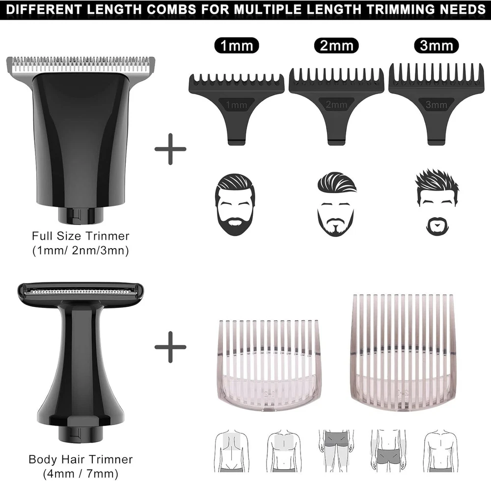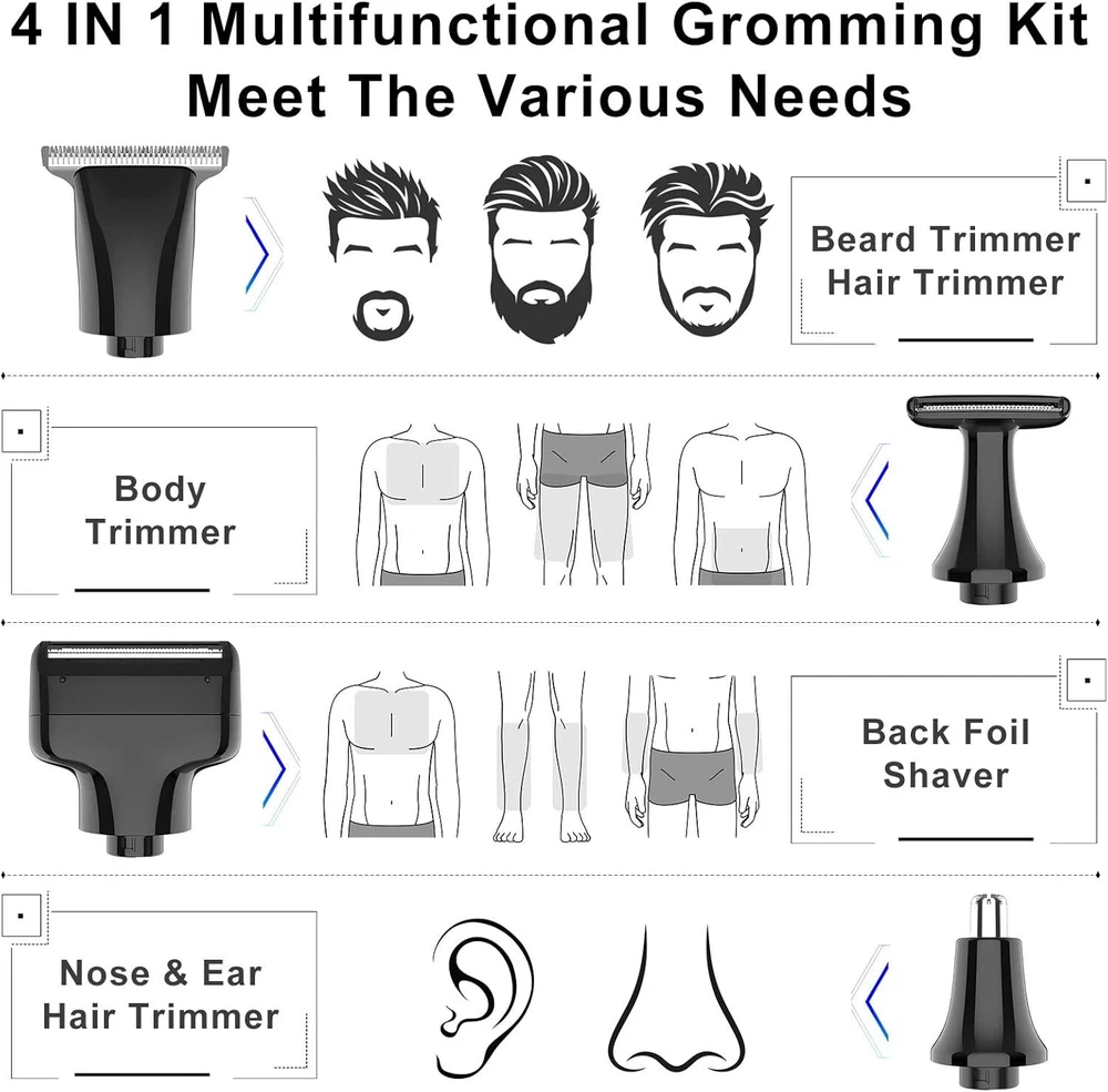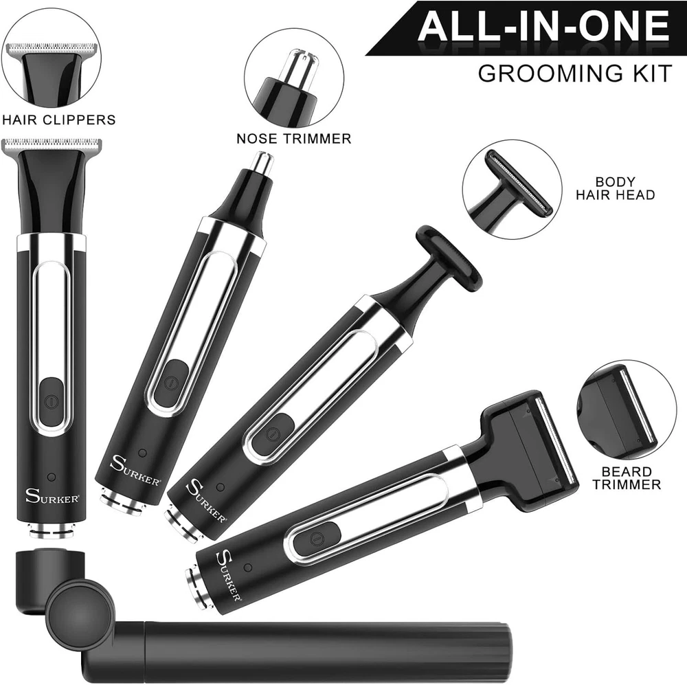 SURKER Body Trimmer Mens Electric Back Shaver Grooming kit Black Product Details Package Dimensions : 9.69 x 6.18 x 2.05 inches; 1.01 Pounds Item model number : RSCX9611 Batteries : 1 AAA batteries required. Manufacturer : SURKER Country of Origin : China Recommended Uses For Product: trimming, shaving Color: Black Hair Type: All Item Weight: 0.46 Kilograms Brand: SURKER 【Versatile USE】This groomer/shaver kit includes 4 detachable heads:T-blade haircut trimmer head/nose trimmer head/body trimmer head/combination shaving head. Designed for not only for facial trimmings but also for below-the-waist grooming, like back shaving ,arms,legs,body hair.T-balde trimmer equipped 3 guide combs(1/2/3mm),dealing with the haircut,beard trimming,sideburns,precise trimming. 【Adjustable Extension Arm】Detachable extension assist arms with 180°Adjustable Angle design -Allowing you to reach even the most difficult middle and lower back areas when shaving back hair.Auxiliary arm function enables you to reach all areas of your back by yourself with ease and shave off all your back hair effortlessly. 【Two Speed Adjustable】Adjust the high and low speed according to the density of body hair.Powerful motor make every single pass remove hair with no snagging, providing an effective haircut for you. 【Battery Reminder &Travel Lock】Smart charging light indicates when the trimmer need to be charged / cleaned ; lights also shows lock/unlock state.Tracl- Lockg function(hold the on/off button for 2 seconds ) to avoid accidentally touching the switch, travel with convenient to carry.This machine should be charged through the base.Built-in rechargeable battery delivers up to 60-120 minutes of run time per charge by only about 1.5 hours charging. 【100% Waterproof&Cordless】Full body Waterproof Design & One-button ON/OFF Switch meet the waterproof function. You can rinse directly under the tap for easier cleaning.Cordless design combinated the ergonomic design gives a solid performance in both durability and comfort. 【Guidelines for use】Avoid prolonged discharging, the machine will automatically shut down every fifteen minutes of work, please wait for one minute before you can switch on the machine again.To maintain battery life, please charge and discharge the battery once every 1-2 months when the machine is not in use. For the beard trimmer blade:Please change the direction of the cutter head to match the use of the extension arm. Red Light Flash:In addition to the case where the machine is out of battery, the machine lock status will also flash red. Please press and hold the switch to unlock the machine.