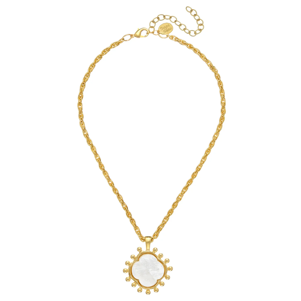 BRAND NEW WITH TAGS SOPHIE NECKLACE BY SUSAN SHAW - RETAIL $174 Featuring a glistening Mother of Pearl pendant hand-cut into a clover on a solid rope chain, the Sophie Clover Necklace is beautiful layered or on its own. Symbolizing prosperity and good fortune, the lucky clover shape will add charm to any look. Please note: our jewelry is crafted using genuine pearls and stones; as a result, slight variations in color, shape, and size may occur. These natural differences are part of their unique beauty and contribute to the one-of-a-kind nature of each piece. Lobster claw clasp 16 inches with 3 inch extender Triple-plated 24k Gold, Genuine Mother of Pearl Handmade in San Antonio, Texas