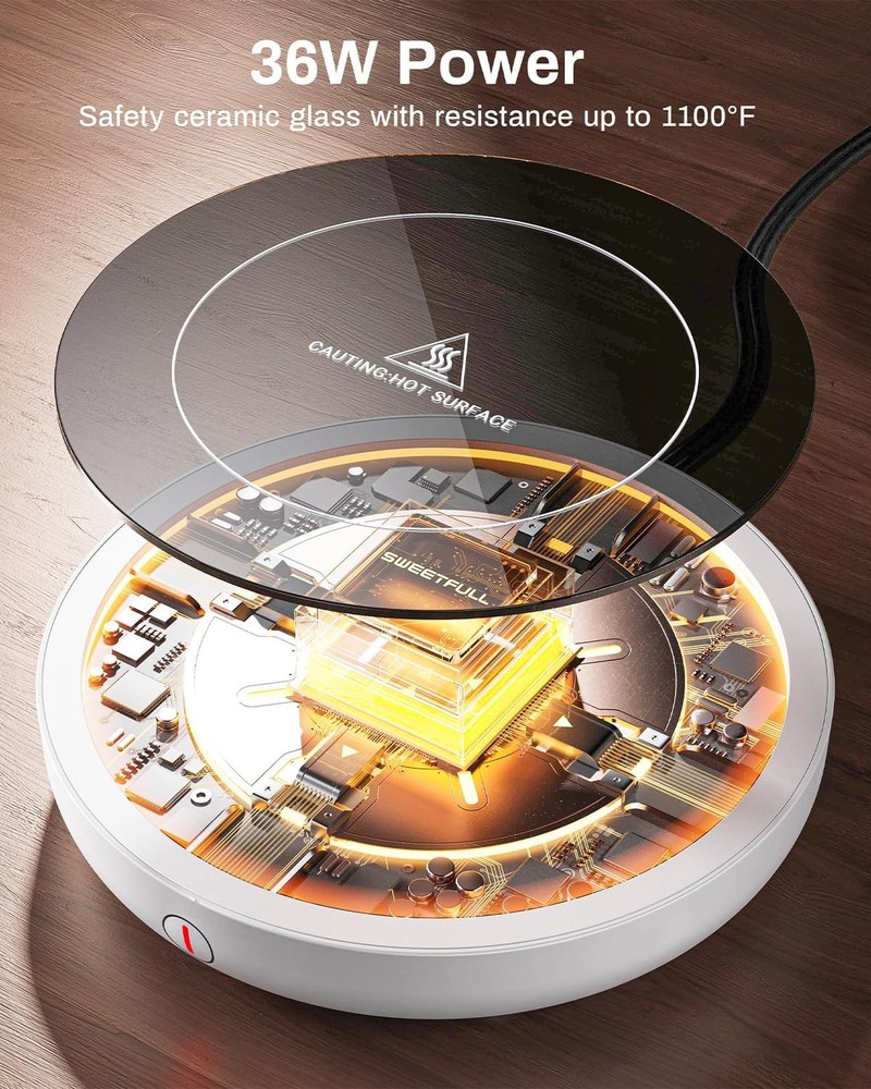 SWEETFULL Coffee Mug Warmer, 36W Electric Cup Warmer for Desk White LuxeFusion Product Description Features Updated 3 Temperature Settings: The SWEETFULL 36W coffee mug warmer is equipped with a built-in temperature control chipset module and offers a constant temperature function, making your beverage stays at a consistent temperature (105℉/130℉/180℉) Larger Heating Area Cup Warmer: The coffee warmer has a 5.2" super large heating panel , which can quickly heat coffee in cups of various sizes. Weighing 0.81LB and boasting a compact design, this cup heating is easy to carry and use 4H Automatic Shutdown: Simply touch the power button to turn off the electric warmer, or it will automatically shut off after 4 hours of use for added safety WATERPROOF DESIGN - This desk coffee cup warmer features a waterproof conductive glass surface, making it safe and easy to clean in case of spills. Its extra-large heating area ensures faster and more uniform heating, allowing you to enjoy aromatic coffee without waiting Best Gift: Keep Beverages Warm and Enjoy the Perfect Cup of Coffee. This coffee warmer is the ultimate gift for Thanksgiving, Christmas, New Year, Valentine's Day, birthdays, or any special occasion Suitable for Most Mugs: The effectiveness of the warming feature may vary depending on the cup's material. It works best with flat-bottomed stainless steel, ceramic, or glass mugs. Using a lid can help retain the heat Product Details Item Weight: 0.81 Pounds Number of Trays: 1 Voltage: 120 Volts Wattage: 36 watts Maximum Temperature: 180 Degrees Fahrenheit Upper Temperature Rating: 180 Degrees Fahrenheit Manufacturer: SWEETFULL Product Dimensions: 5.91 x 5.91 x 1.2 inches Item Weight: 13 ounces Item model number: DS1293 Color: White Material: Glass Brand: SWEETFULL Product Dimensions: 5.9"L x 5.9"W x 1.2"H Power Source: AC Free Shipping All orders ship free and fast to your doorstep. Easy Returns Satisfaction guaranteed. 30-day returns, no questions asked. 24/7 Support Contact us anytime; we’re here to help, day or night. Brought to you by LuxeFusion – Quality you can trust.