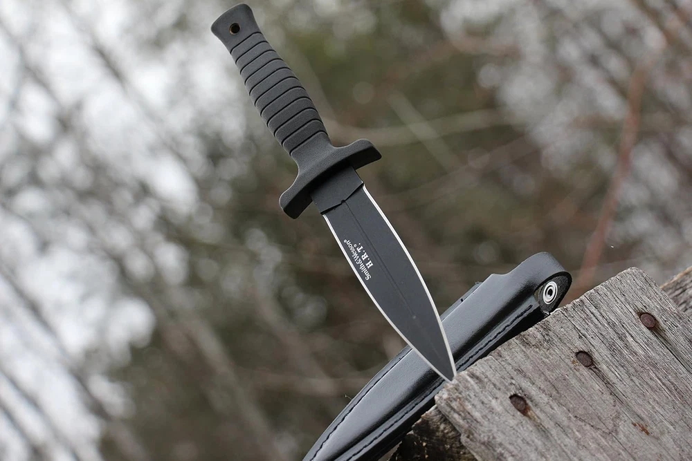 DIMENSIONS: 9 inch (22.9 centimeter) overall length with a blade length of 4.7 inches (12.1 centimeter) and a weight of 7.7 ounces DURABLE: Blade is made of reliable 7Cr17MoV high carbon stainless steel with a black rubber wrapped handle DEPENDABLE: Quick and easy access with the convenient belt or boot sheath making it ideal for everyday carry SECURE: Have confidence that the blade will not slip with the security of the hand guard BE PREPARED: Knife Features Lanyard Hole Makes For Ideal Neck Knife GUARANTEED: This product is covered by a Limited Lifetime Warranty. For questions or contact us on the Smith & Wesson website The Smith & Wesson® H.R.T. Full Tang Fixed Blade Knife is made out of a black high carbon stainless-steel dual-edged spear point blade with blood grooves. Its TPE rubber wrapped handle comes with lanyard hole and black leather belt/boot sheath.