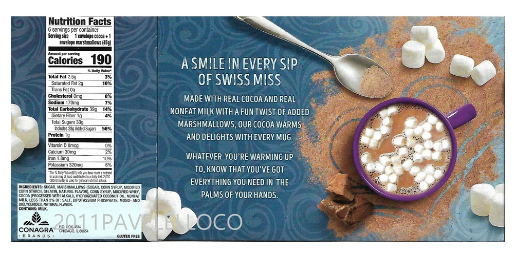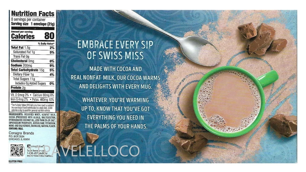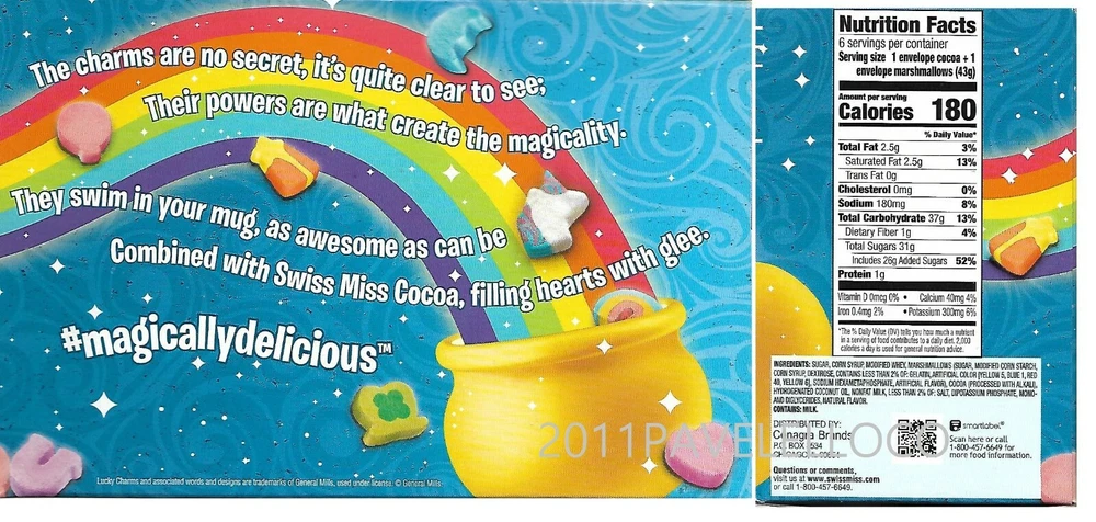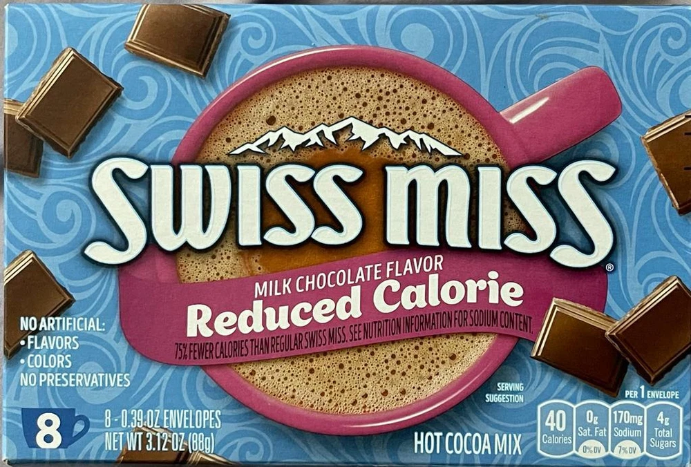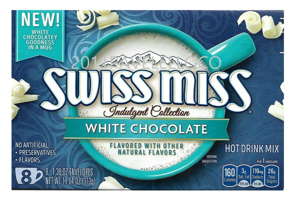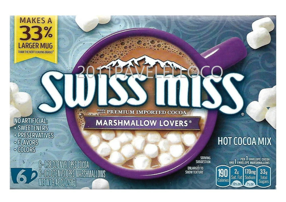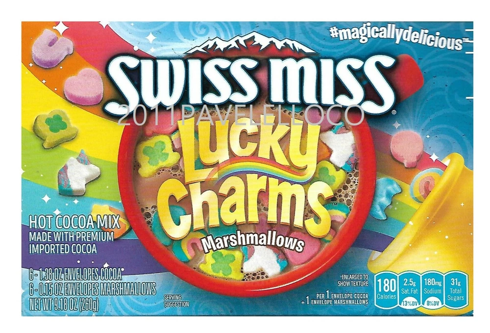 Calories per Serving: VARY Food Specifications: Gluten Free, No Artificial Flavoring, Sugar Free Expiration Date: 2025 Type: Chocolate Drink Brand: SWISS MISS Product: Hot Chocolate & Malted Drink Food Aisle: Pantry Number of Servings: VARY Volume: 1.38 OZ Custom Bundle: No MPN: DOES NOT APPLY Flavor: LUCKY CHARM, MARSHMALLOW LOVERS, Peppermint, Dark Chocolate, Milk Chocolate, White Chocolate Serving Size: VARY Allergens: NO