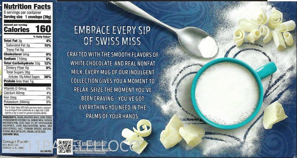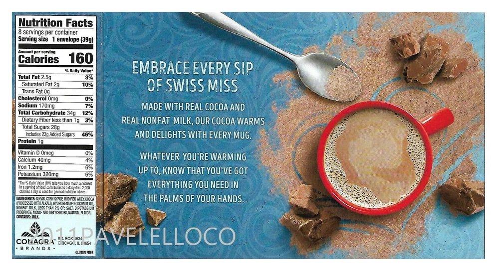Swiss Miss Chocolate Flavor Hot Cocoa Mix is the creamy and warm beverage that delights kids and adults alike. Whatever you're warming up to, know that you've got everything you need in the palms of your hand. With no artificial sweeteners, preservatives, flavors, or colors, this delicious drink will warm and delight with every mug.. For more than 50 years, Swiss Miss has been creating its signature blends in a real dairy in Menomonie, Wisconsin. Packaged here in the USA starting with farm-fresh milk, every cup of Swiss Miss has real, wholesome taste in every sip. Specifications Made with real cocoa and real nonfat milk, our comforting cocoa mix will give you the chocolatey taste you crave Swiss Miss Chocolate Flavor Hot Cocoa Mix is the creamy and warm beverage that delights kids and adults alike Swiss Miss Chocolate Flavor Hot Cocoa Mix es la bebida cremosa y cálida que deleita a niños y adultos por igual. Independientemente de lo que esté calentando, sepa que tiene todo lo que necesita en la palma de su mano. Sin edulcorantes, conservantes, sabores ni colores artificiales, esta deliciosa bebida calentará y deleitará con cada taza. Durante más de 50 años, Swiss Miss ha estado creando sus mezclas exclusivas en una verdadera lechería en Menomonie, Wisconsin. Empaquetado aquí en los EE. UU. Comenzando con leche fresca de la granja, cada taza de Swiss Miss tiene un sabor real y saludable en cada sorbo. Especificaciones Fabricada con cacao real y leche descremada real, nuestra reconfortante mezcla de cacao le dará el sabor a chocolate que anhela Swiss Miss Chocolate Flavor Hot Cocoa Mix es la bebida cremosa y cálida que deleita a niños y adultos por igual FREE AND FAST SHIPPING IN TOWN