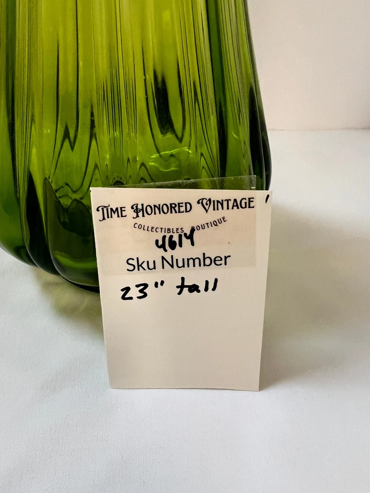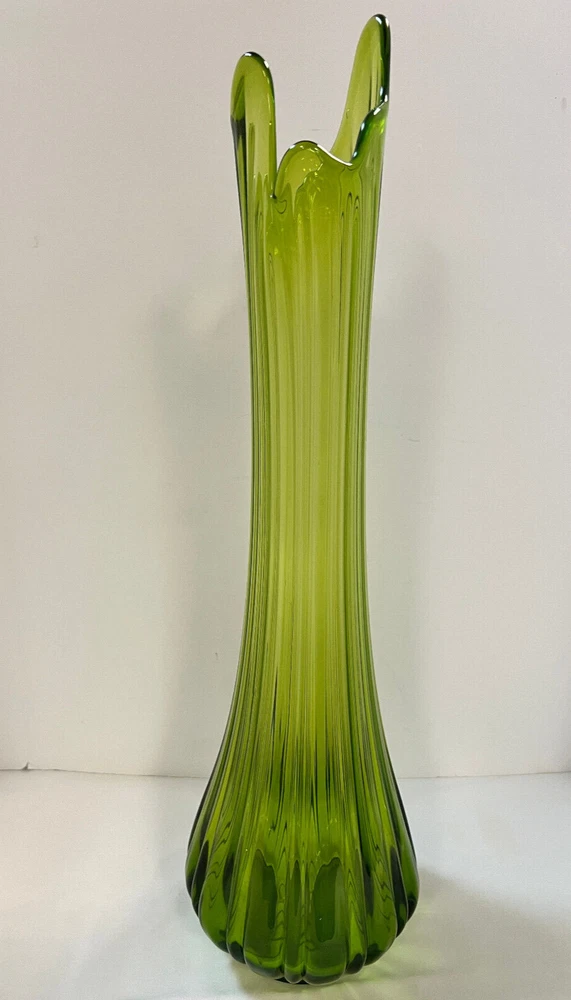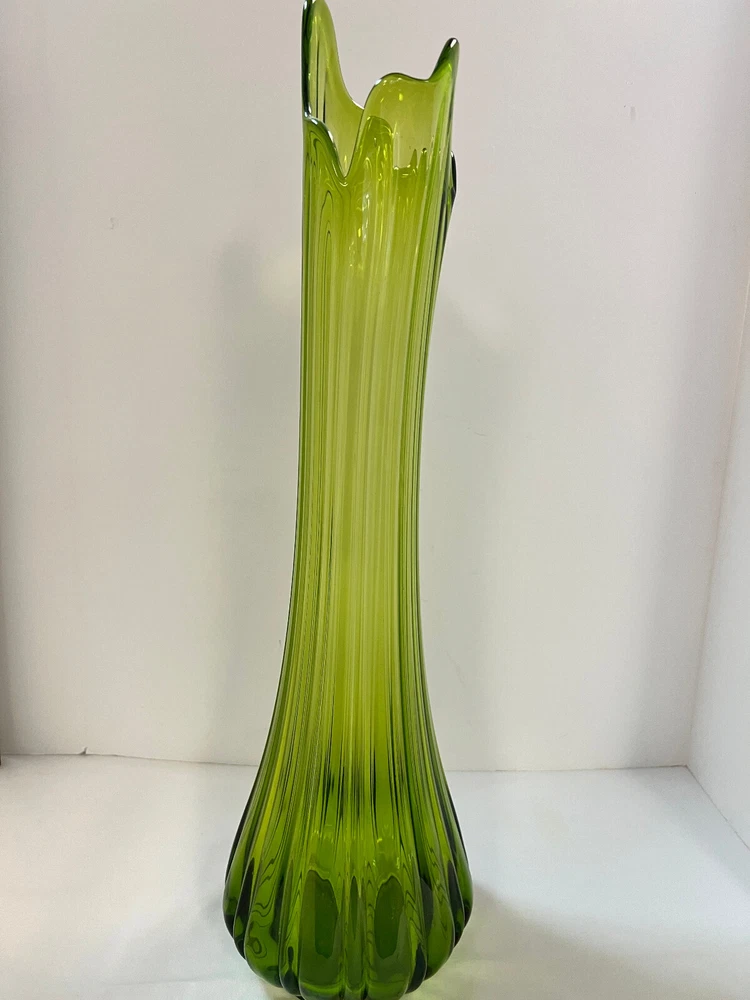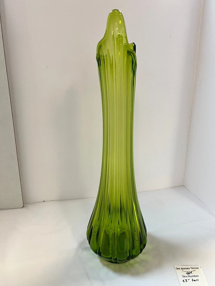 LE SMITH RIBBED SWUNG GREEN Glass STRETCH VASE 23” MCM BEAUTIFUL Mid Century Clean and clear in great condition This is one of the large ones and because of the size and weight , and the fact that it must be double boxed there is a high shipping charge.However it will get to you in great condition!. Double Boxed for safe shipping. Time Honored Vintage Terms of Service: International Postal customers, you may be taxed when the item gets to your country. If you have any problem or question, please email us through eBay, We will do our best to solve the problem and give you a satisfying answer . I take returns, within 30 days, contact me, then send the item back for a full refund of your purchase fee. Mounts, supports and displays used in photography of the item are NOT included in auction unless noted. Local Pick up is at the Time Honored Vintage Store in Santa Clara Ca. *Please note that vintage items, are at least 20 years old and have had a prior life and will have some normal wear and imperfections appropriate to the age. Any major, or notable flaws will be mentioned in the listing. *