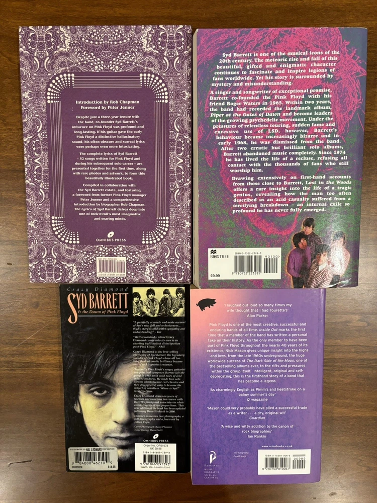 SYD BARRETT /PINK FLOYD Books Lot Lost In The Woods Syd Barrett and The Pink Floyd by Julian Palacios Crazy Diamond Syd Barrett and the Dawn of Pink Floyd by Mike Watkinson and Pete Anderson The Lyric of Syd Barrett by Omnibus Press Inside Out A Personal History of Pink Floyd by Nick Mason