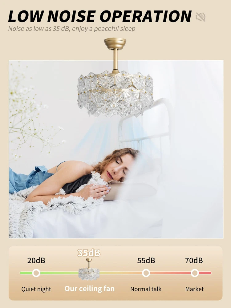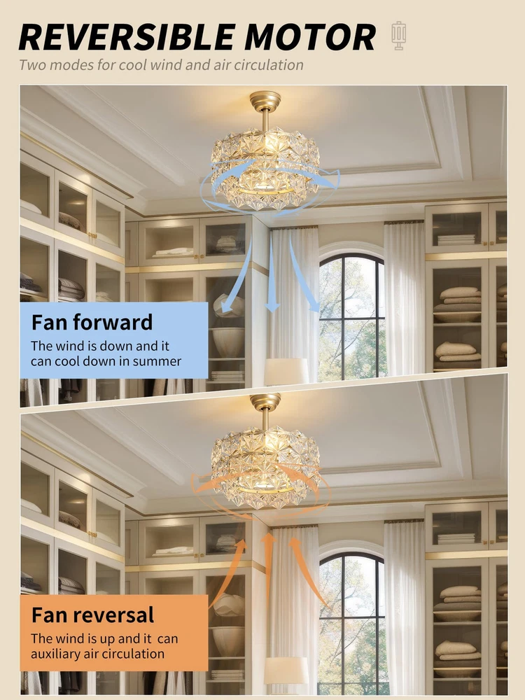 Installation Tips: If you encounter any broken glass components while installing your Gold Crystal Ceiling Fan with Lights. We will promptly send you the replacement parts! Patented Crystal Design: Say goodbye to those clunky, old-fashioned ceiling fans and welcome a whimsical upgrade with our enclosed gold crystal fandelier ceiling fan with light. This caged fancy Chandelier ceiling fan not only adds a touch of modern elegance and efficient air circulation, but it also gives your room a dose of dreamy relaxation. Perfect for all the free-spirited crystal enthusiasts out there, because who says air circulation can't be stylish and fun? Personalized Comfort: Our gold crystal fandelier ceiling fan with light is all about giving you the perfect ambiance. With separate fan speed and light adjustments, you can create a breeze that's just right for you. And guess what? It operates so quietly that you can even have a whispered conversation with your thoughts. Plus, with the included remote control, you can effortlessly control the fan and lighting settings without even leaving your cozy spot on the couch. Ambient Lighting: Let's set the stage for some magic! Our enclosed gold crystal Chandelier ceiling fan with lights allows you to create a play of light and shadow that's straight out of a fairy tale. With four light sources, you can adjust the brightness to fit your every mood and activity, whether it's reading, daydreaming, or hosting a crystal dance party. It's like having your own personal lighting designer, except without the hefty price tag. Tranquil Nights: Say goodbye to those noisy nightmares! Our caged gold crystal fandelier ceiling fan with light and remote control operates as silently as a sleeping cat, creating a peaceful atmosphere for you to drift away into dreamland. And if you're worried about forgetting to turn it off, don't be! The convenient timer function lets you schedule automatic shut-off, so you can snooze away without a care in the world. Effortless Installation, Flexible Placement: We know you're not a fan of complicated installations (pun intended), so we've made it super easy for you. Our gold fancy ceiling fan with light comes pre-assembled and can be installed on any type of ceiling, from low to high. It's like a DIY project without the stress. So go ahead, choose your favorite corner of the house and let our fan do its stylish magic. Crystal Customer Love: We're not just a fan company, we're a family. That's why we offer a 1-year worry-free warranty and round-the-clock customer support. We're here to make sure you have the most crystal-tastic experience ever, from the moment you Choose it to the day your fan starts spinning. So join the tribe and let our caged gold crystal fancy Chandelier ceiling fan with light bring modern bliss to your life.