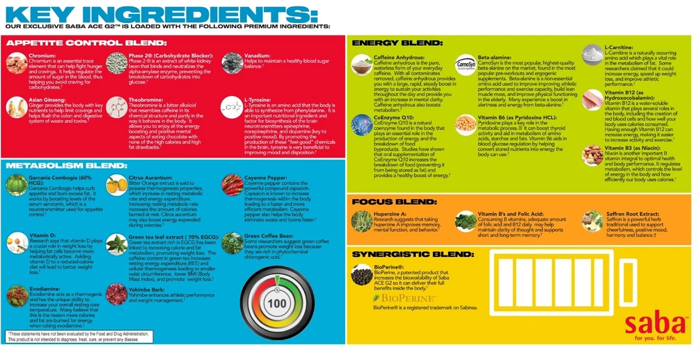WEIGHT LOSS & BURN BODY FAT: Saba ACE g2 is a cutting-edge thermogenic weight loss and fat burner for men and women. Each capsule contains an effective dose of the most powerful thermo weight loss and fat-burning ingredients available. Its synergistic formula helps to burn fat, increase energy, preserve lean muscle, suppress appetite, boost the metabolism, and improve mood. Maximize your body transformation and see results fast with this powerful weight-loss supplement. ENERGY BOOSTER & APPETITE SUPPRESSANT. Conquer your day and crush your workouts with jitter-free energy, enhanced focus, and an improved mood. If you?re looking for the best appetite suppressant that works, the search ends here. Keep food cravings in check and your diet on track with these innovative energy and weight management formula. SCIENTIFICALLY-FORMULATED ENERGY & WEIGHT MANAGEMENT. Saba ACE G2 was created using only the best weight loss ingredients in effective doses to help you lose weight. By targeting the fat burning process through multiple pathways in the body. cGMP USA MANUFACTURING. Saba is an FDA registered and NSF audited facility. All of Saba's are manufactured in a state-of-the-art cGMP facility. We guarantee that you are getting the purest, safest and highest quality products on the market. SATISFACTION GUARANTEED. We guarantee your satisfaction. If for any reason at all you aren't completely satisfied with your results from this best selling energy and weight loss supplement we will work to resolve your concern. Real Results: Stop settling for supplements that simply don't work. Saba ACE G2 is one of the best selling weight loss products on the market. It is engineered for perfection, our one-of-a-kind nutraceuticals help you hit the spots you need help me most. Feel a clean surge of energy, enhanced focus, and appetite control to help keep your diet in check. Saba ACE G2 is made with the best best ingredients, efficacious doses, total label transparency, and contains no artificial fillers, preservatives, or food dyes. How to Use Saba ACE G2: Directions: As a dietary supplement, adult take 1 capsule in the in the morning and 1 capsule earl afternoon 10 to 15 minutes after a small meal.