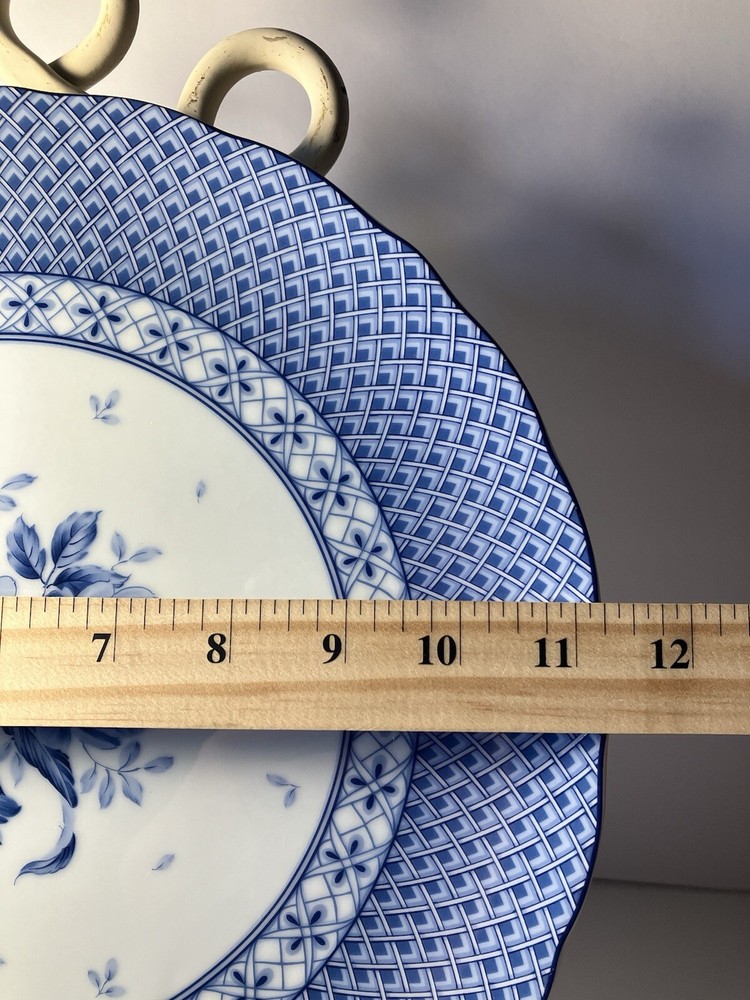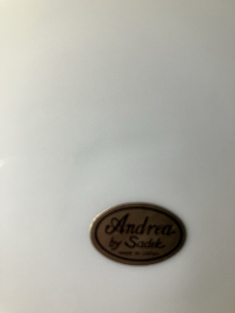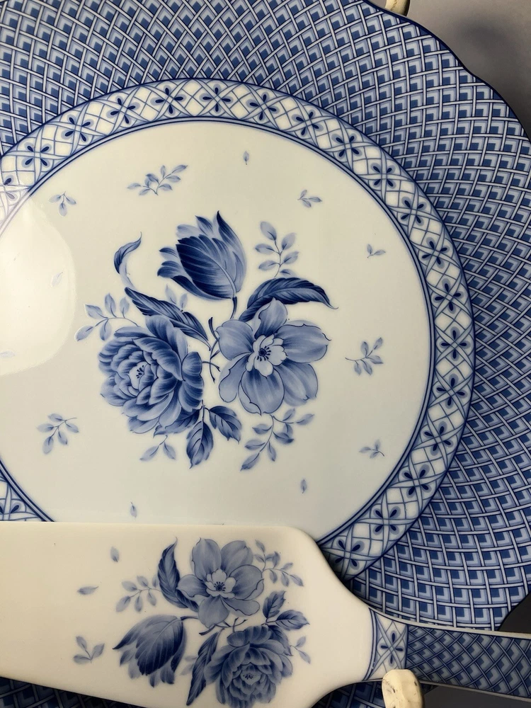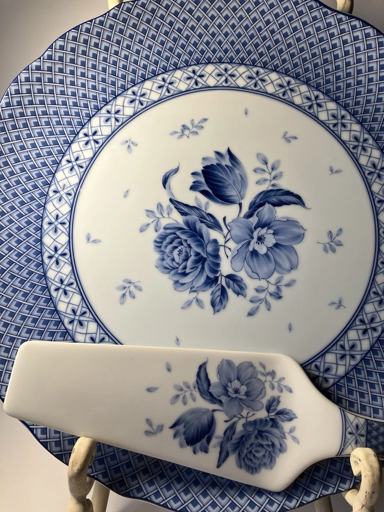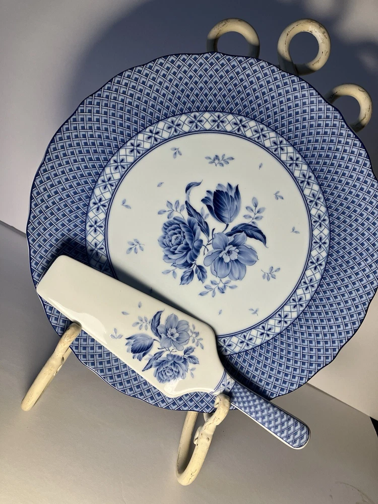 This beautiful cake plate and server set from Andrea by Sadek is a must-have for any occasion. The intricate blue rose porcelain finish adds a touch of elegance to any dessert table. Measuring 11 inches in width, this round serving piece is perfect for all occasions, whether it's a wedding or a casual get-together. Crafted in Japan in 1999, this vintage set is part of the Andrea by Sadek product line and features a floral theme of roses. The backstamp is printed and the production technique is unknown. This set includes two items and is perfect for adults. Add a touch of sophistication to your dessert presentation with this stunning cake plate and server set.