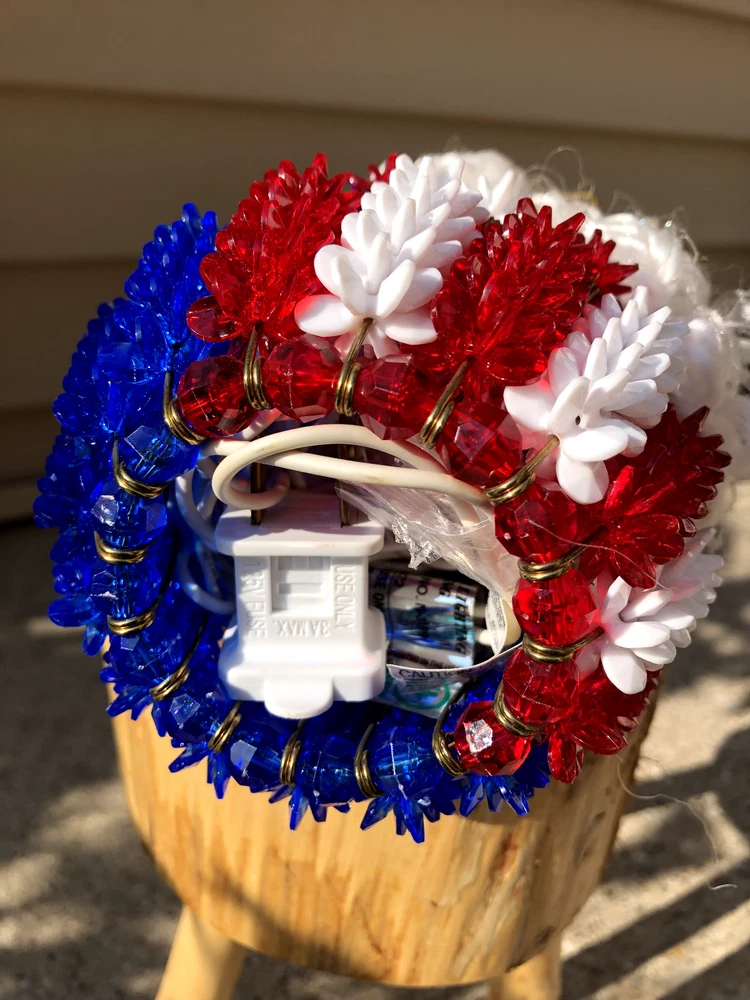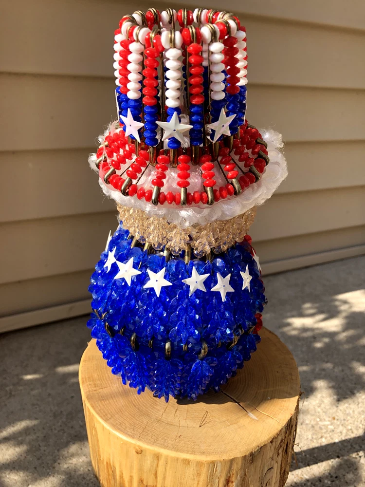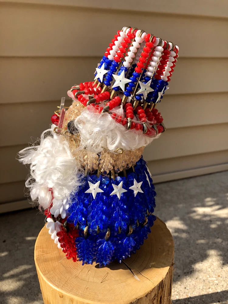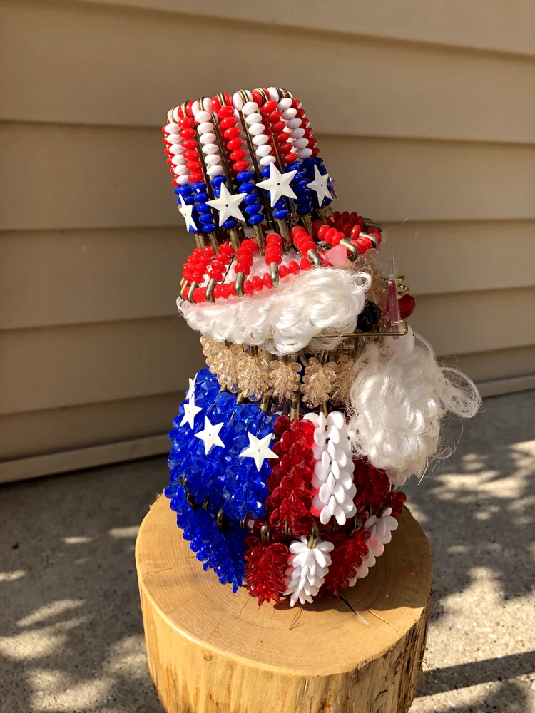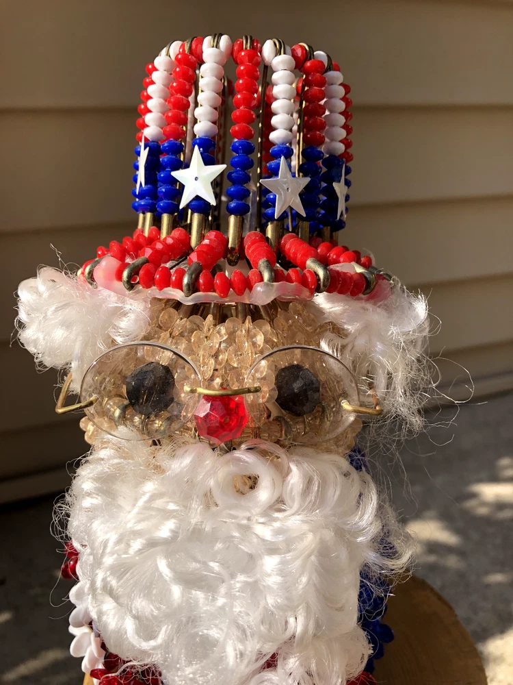 This is a nice piece of safety pin art, The theme is either Uncle Sam or Santa red, white, and blue. Measures 8 inches tall and 4 inches wide at the base. There is a plug with mini lights in the base. It can be plugged into an outlet for a glowing effect in the evening. Please see my rabbit safety pin art, as I can combine shipping. From a smoke free home. Thank you for looking and bidding!