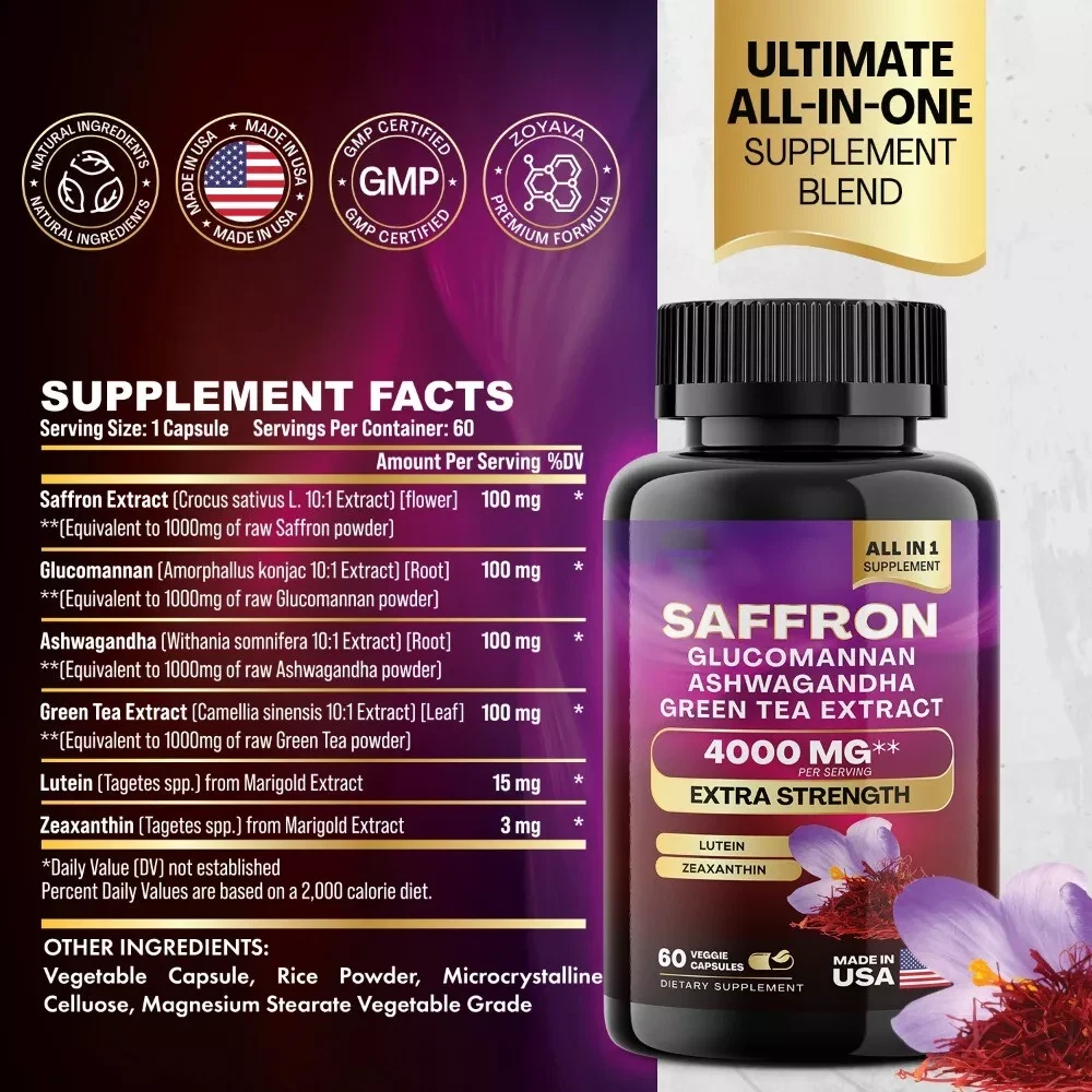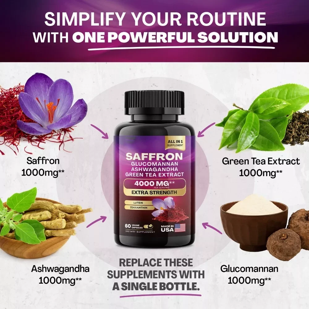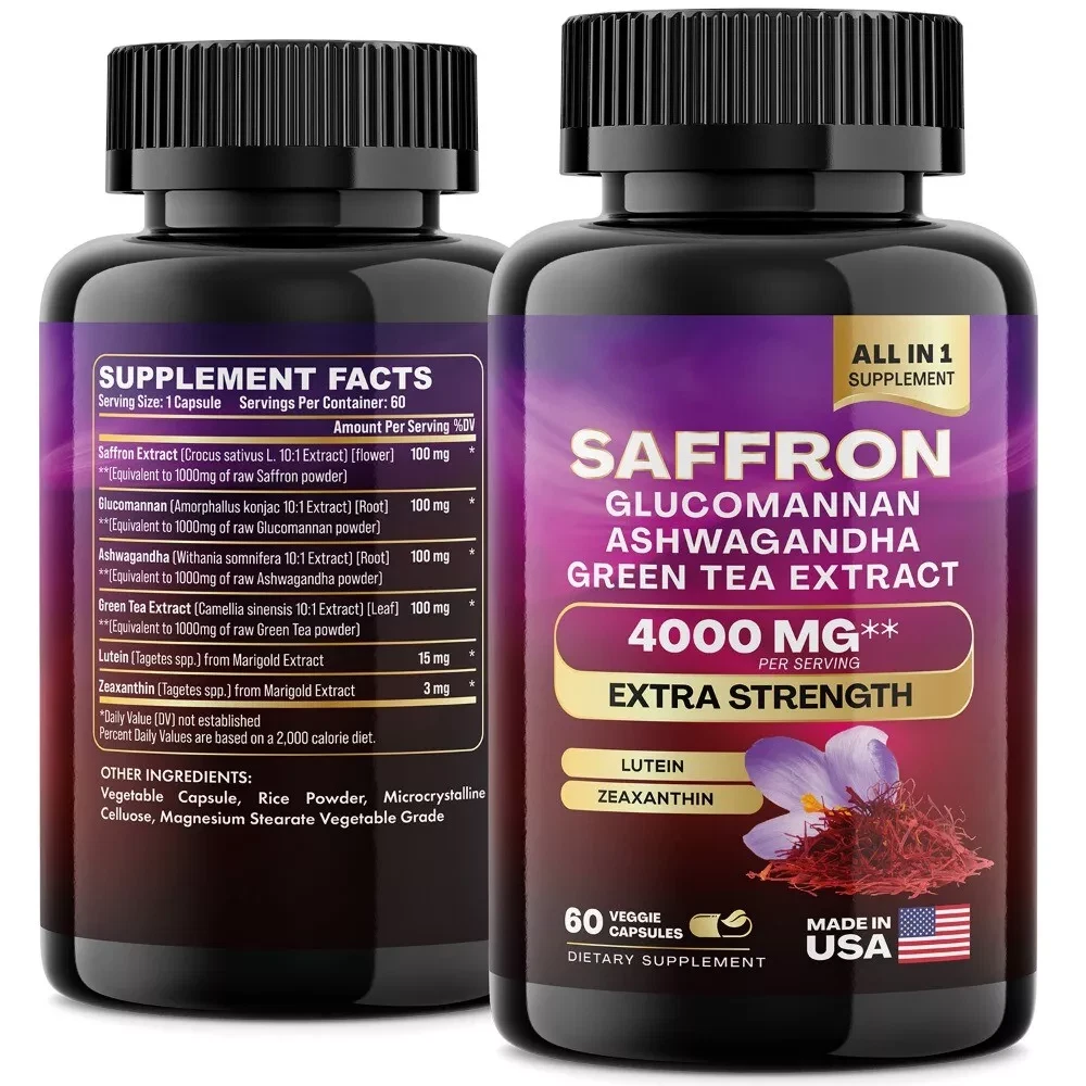 Introducing our revolutionary Multi-Mineral Formula, a comprehensive combination of Saffron Pills, Glucomannan Pills, Ashwagandha, and Green Tea Extract, enriched with over 5 potent ingredients. Experience the power of Lutein, Saffron, Glucomannan, Ashwagandha and many more in one convenient formula. This saffron extract supplement capsules provide a great alternative to saffron gummies, glucomannan gummies, and ashwagandha gummies. Our advanced formula of Saffron Extract Capsules are designed for both women and men. Our Saffron Pills contain a remarkable blend of 6 beneficial ingredients. We presents the world's most comprehensive 6-in-1 formula, featuring saffron, glucomannan, ashwagandha extract, green tea capsules. Discover the ultimate solution you've been searching for. We presents the perfect combination of Saffron Extract and Ashwagandha Capsules. Our blend offers 6 beneficial ingredients in a single dosage. Finally, the convenience you've been waiting for— Saffron Extract wildcrafted, glucomannan, ashwagandha powder,—all in one easy-to-take solution. Tip: Due to product packaging upgrades, there are mixed shipments, so don't worry if you receive items with different packaging. This is not a fake.