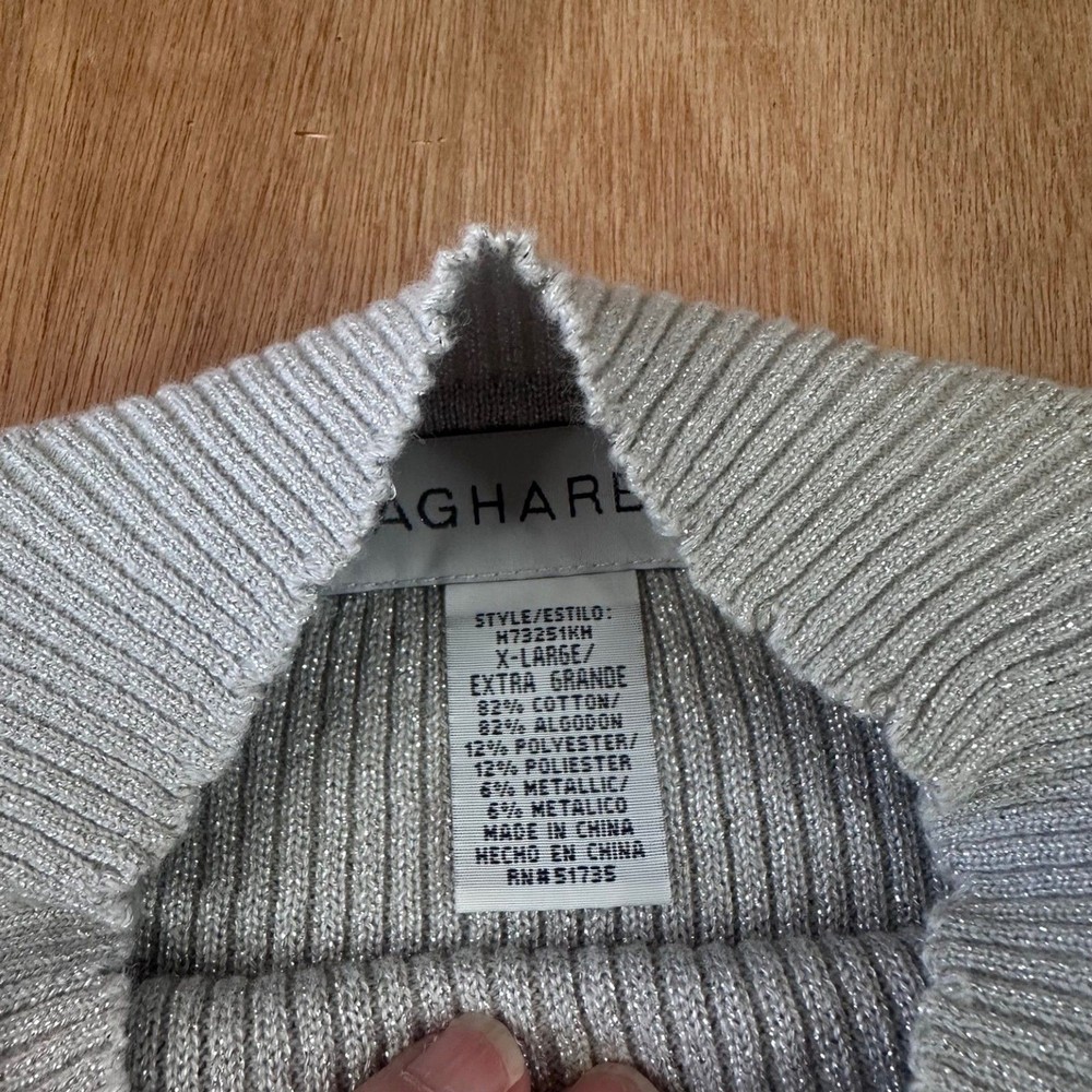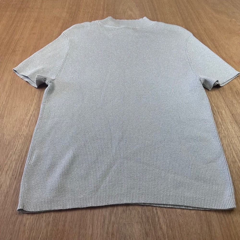 Sag Harbor ribbed knit top in a soft silver tone with subtle metallic shimmer throughout. Short sleeve style with a clean, polished silhouette. Structured ribbed texture with stretch for comfort. Easy piece to dress up with trousers or wear casually with denim. Pre-owned in very good condition. No stains or holes noted. Features Women’s Size XL Silver metallic tone Ribbed knit texture Short sleeves Cotton blend with metallic thread Stretch fabric #SagHarbor #WomensXL #MetallicTop #RibbedKnit 1521
