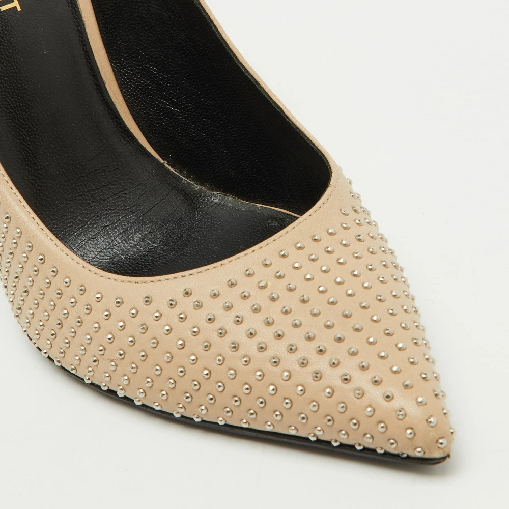 A blend of edgy and elegant, these Saint Laurent pumps are crafted from smooth beige leather with striking studded details on the heels. The pointed toe and sharp silhouette add a modern, sophisticated touch.Certified by The Luxury Closet - This item has gone through a detailed authentication process overseen by our experts. We offer a lifetime guarantee of authenticity on all our items. Import duties, taxes and charges are not included in the item price. These charges are the buyers responsibility. Please check with your country’s customs office to determine what these additional cost will be prior to buying. Our eBay Store About Us Contact Us Add to Favorite Sellers Saint Laurent Beige Leather Studded Pointed Toe Pumps Size 38.5 $283.8 A blend of edgy and elegant, these Saint Laurent pumps are crafted from smooth beige leather with striking studded details on the heels. The pointed toe and sharp silhouette add a modern, sophisticated touch. Product Details Brand Color Beige Dimensions Material Leather Size 38.5 Outsole Width 8 cm Outsole Length 25 cm Heel Height 11 cm Includes The Luxury Closet Packaging Certified by The Luxury Closet This item has gone through a detailed authentication process overseen by our experts. We offer a lifetime guarantee of authenticity on all our items. How We Check The in-house team of experts at The Luxury Closet is highly trained to verify the authenticity and the condition of the luxury products. They ensure that only 100% authentic items are put on sale.The evaluation process is unique with its own mix of assessment criteria and differs according to the category. Each item is evaluated based on the following combination of hallmarks, hardware, stitching, symmetry, material, craftsmanship, stamping, codes, hologram stickers, and packaging. Our authenticators also check if the items have been modified or amended (e.g., aftermarket diamonds, replaced batteries, repaired bags, etc.) International Buyers Import duties, taxes and charges are not included in the item price. These charges are the buyers responsibility. Please check with your country’s customs office to determine what these additional cost will be prior to buying.
