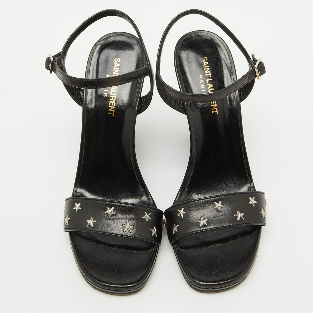 The sandals to invest in this season are these. Meticulously crafted, these exquisite heels combine luxury and comfort, creating a statement pair thats both fashionable and fabulous for every occasion.Certified by The Luxury Closet - This item has gone through a detailed authentication process overseen by our experts. We offer a lifetime guarantee of authenticity on all our items. Import duties, taxes and charges are not included in the item price. These charges are the buyers responsibility. Please check with your country’s customs office to determine what these additional cost will be prior to buying. Our eBay Store About Us Contact Us Add to Favorite Sellers Saint Laurent Black Stars Leather Ankle Strap Wedge Sandals Size 39.5 $220 The sandals to invest in this season are these. Meticulously crafted, these exquisite heels combine luxury and comfort, creating a statement pair thats both fashionable and fabulous for every occasion. Product Details Brand Color Black Dimensions Material Leather Size 39.5 Outsole Width 7.5 cm Outsole Length 20.5 cm Heel Height 11 cm Includes Original Dustbag, Original Box Certified by The Luxury Closet This item has gone through a detailed authentication process overseen by our experts. We offer a lifetime guarantee of authenticity on all our items. How We Check The in-house team of experts at The Luxury Closet is highly trained to verify the authenticity and the condition of the luxury products. They ensure that only 100% authentic items are put on sale.The evaluation process is unique with its own mix of assessment criteria and differs according to the category. Each item is evaluated based on the following combination of hallmarks, hardware, stitching, symmetry, material, craftsmanship, stamping, codes, hologram stickers, and packaging. Our authenticators also check if the items have been modified or amended (e.g., aftermarket diamonds, replaced batteries, repaired bags, etc.) International Buyers Import duties, taxes and charges are not included in the item price. These charges are the buyers responsibility. Please check with your country’s customs office to determine what these additional cost will be prior to buying.