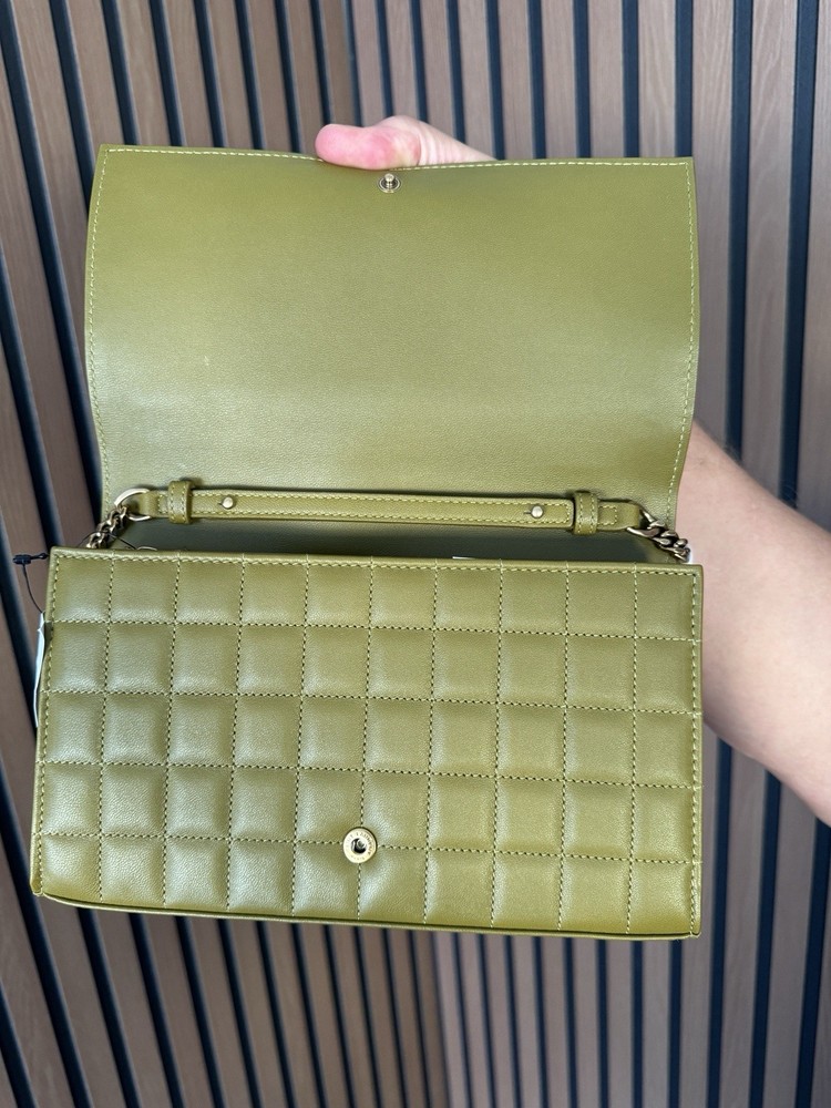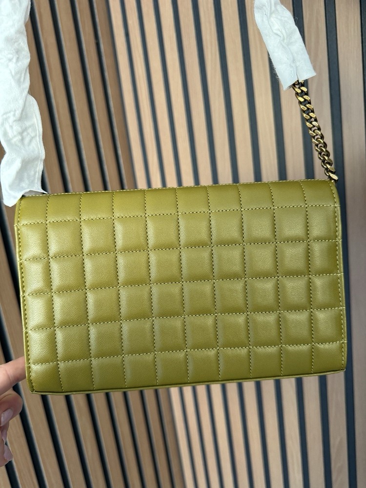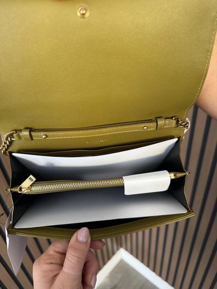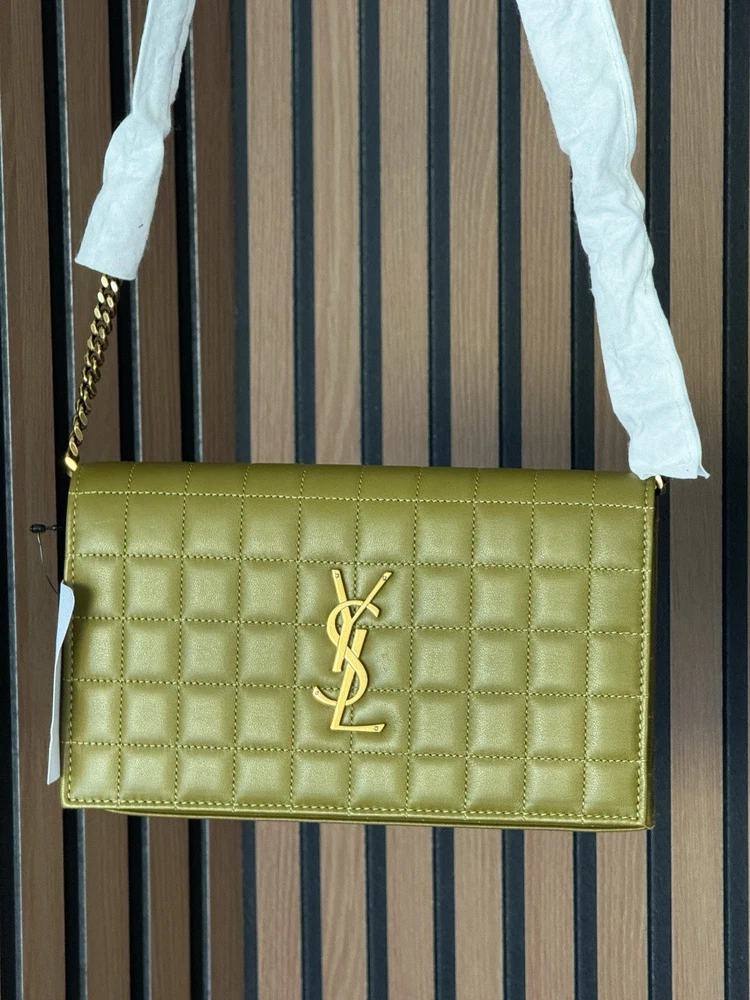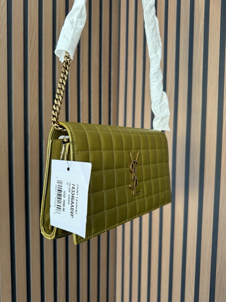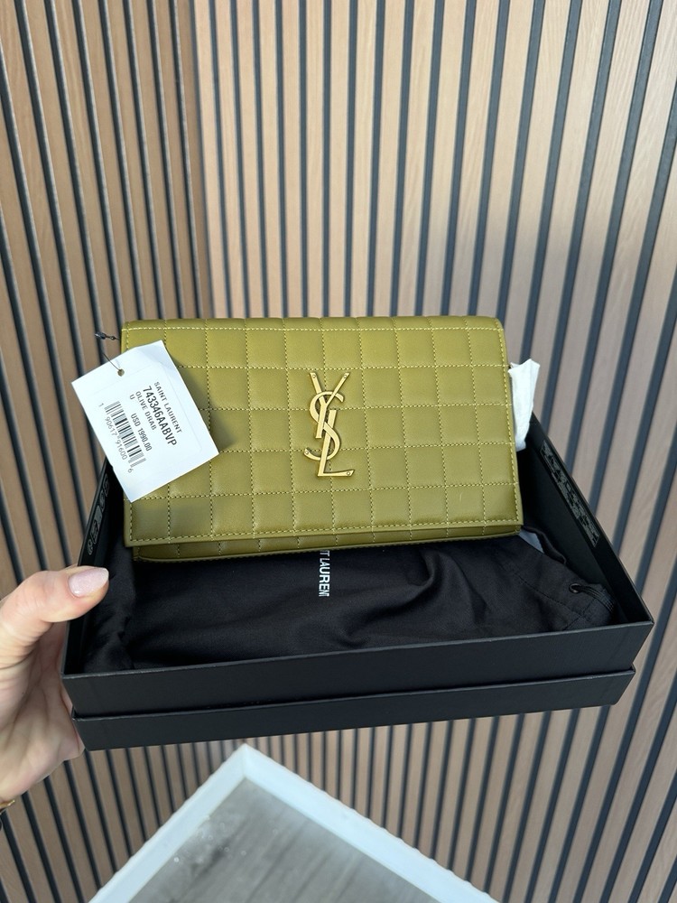 The Saint Laurent Cassandre Quilted Leather Shoulder Bag is a luxurious women's accessory made in Italy. This green WOC (Wallet On Chain) features a solid pattern with a stylish quilted leather material. With dimensions of 9 inches in length and 5 inches in width, this designer bag exudes elegance and sophistication, making it a perfect addition to any woman's wardrobe. Condition new , comes with the box , and dust bag .tag attached