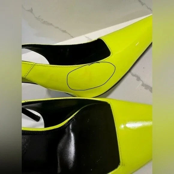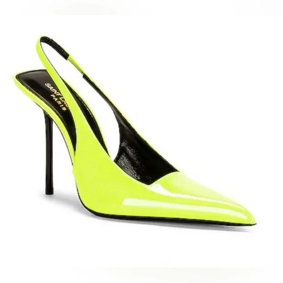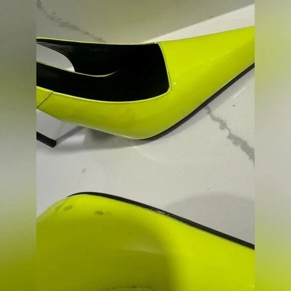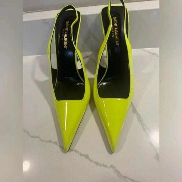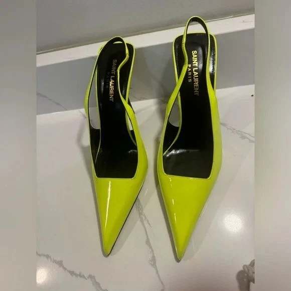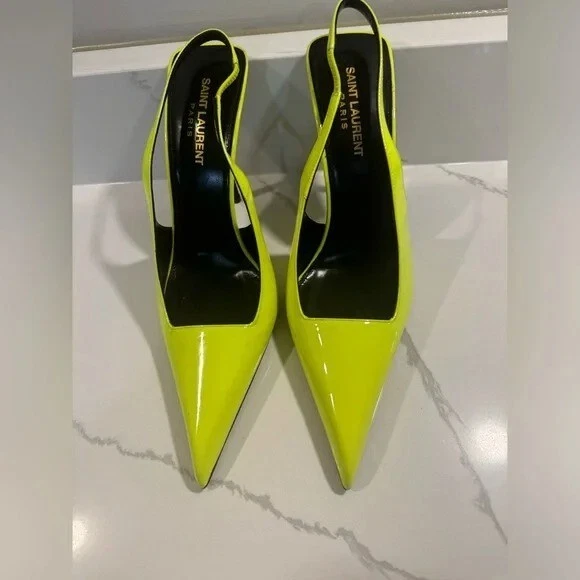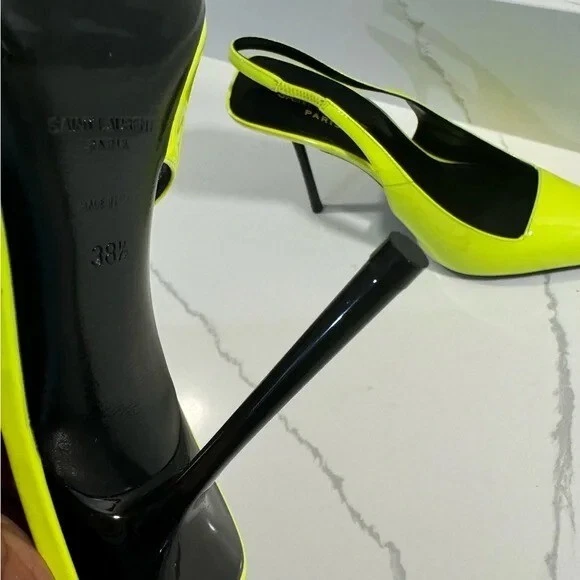 Saint Laurent Kiss 105 Leather Slingback Highlighter Yellow Pumps SZ 8.5 New Saint Laurent Kiss 105 Leather Slingback Pumps new with some slight defect - see last pictures. Defects are inward facing so not noticeable Patent leather upper with leather sole Slingback styling Leather lining Pointed toe with pin heel Please note shade is a neon hue Approx 105mm/ 4 inch heel Color; highlighter yellow Size; 38.5/8.5 Store Display shoes, no box no pouch