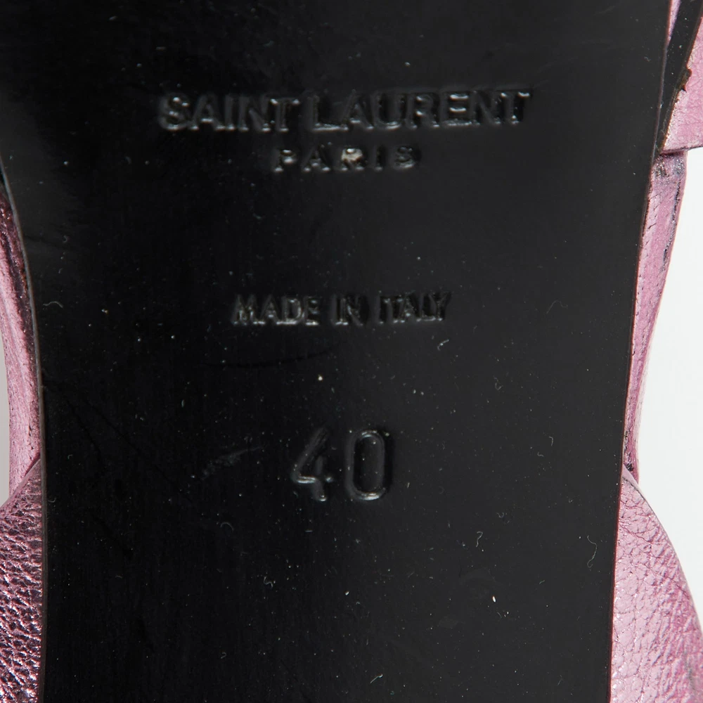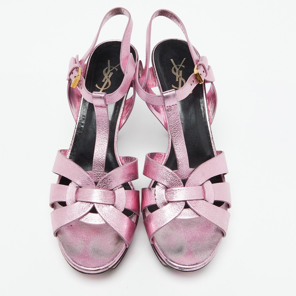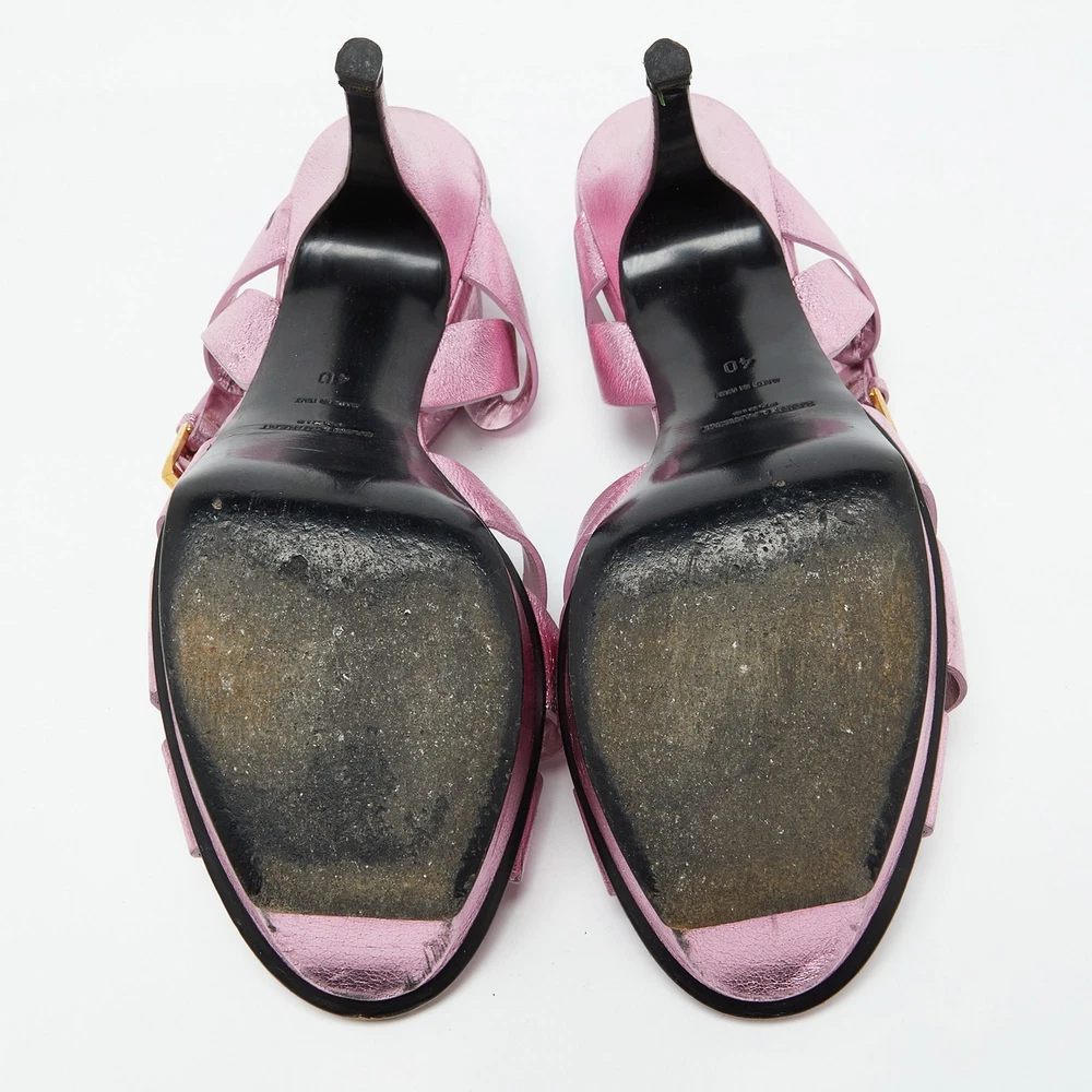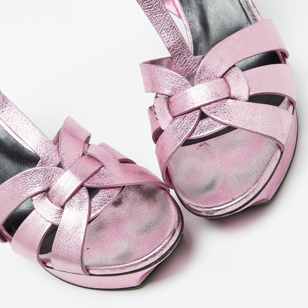 The fashionista in you will instantly fall in love with these Saint Laurent Tribute sandals They are made from metallic pink leather with intertwined straps on the vamps and ankle buckle closure. The gold tone hardware, 11cm heels, and platforms give it a fine finishing.Certified by The Luxury Closet - This item has gone through a detailed authentication process overseen by our experts. We offer a lifetime guarantee of authenticity on all our items. Import duties, taxes and charges are not included in the item price. These charges are the buyers responsibility. Please check with your country’s customs office to determine what these additional cost will be prior to buying. Our eBay Store About Us Contact Us Add to Favorite Sellers Saint Laurent Metallic Pink Leather Tribute Platform Sandals Size 40 $203.5 The fashionista in you will instantly fall in love with these Saint Laurent Tribute sandals They are made from metallic pink leather with intertwined straps on the vamps and ankle buckle closure. The gold tone hardware, 11cm heels, and platforms give it a fine finishing. Product Details Brand Color Pink Dimensions Material Leather Size 40 Outsole Width 7 cm Outsole Length 26 cm Heel Height 11 cm Includes Original Dustbag, Extra Heel Tips Certified by The Luxury Closet This item has gone through a detailed authentication process overseen by our experts. We offer a lifetime guarantee of authenticity on all our items. How We Check The in-house team of experts at The Luxury Closet is highly trained to verify the authenticity and the condition of the luxury products. They ensure that only 100% authentic items are put on sale.The evaluation process is unique with its own mix of assessment criteria and differs according to the category. Each item is evaluated based on the following combination of hallmarks, hardware, stitching, symmetry, material, craftsmanship, stamping, codes, hologram stickers, and packaging. Our authenticators also check if the items have been modified or amended (e.g., aftermarket diamonds, replaced batteries, repaired bags, etc.) International Buyers Import duties, taxes and charges are not included in the item price. These charges are the buyers responsibility. Please check with your country’s customs office to determine what these additional cost will be prior to buying.