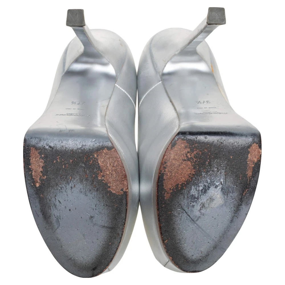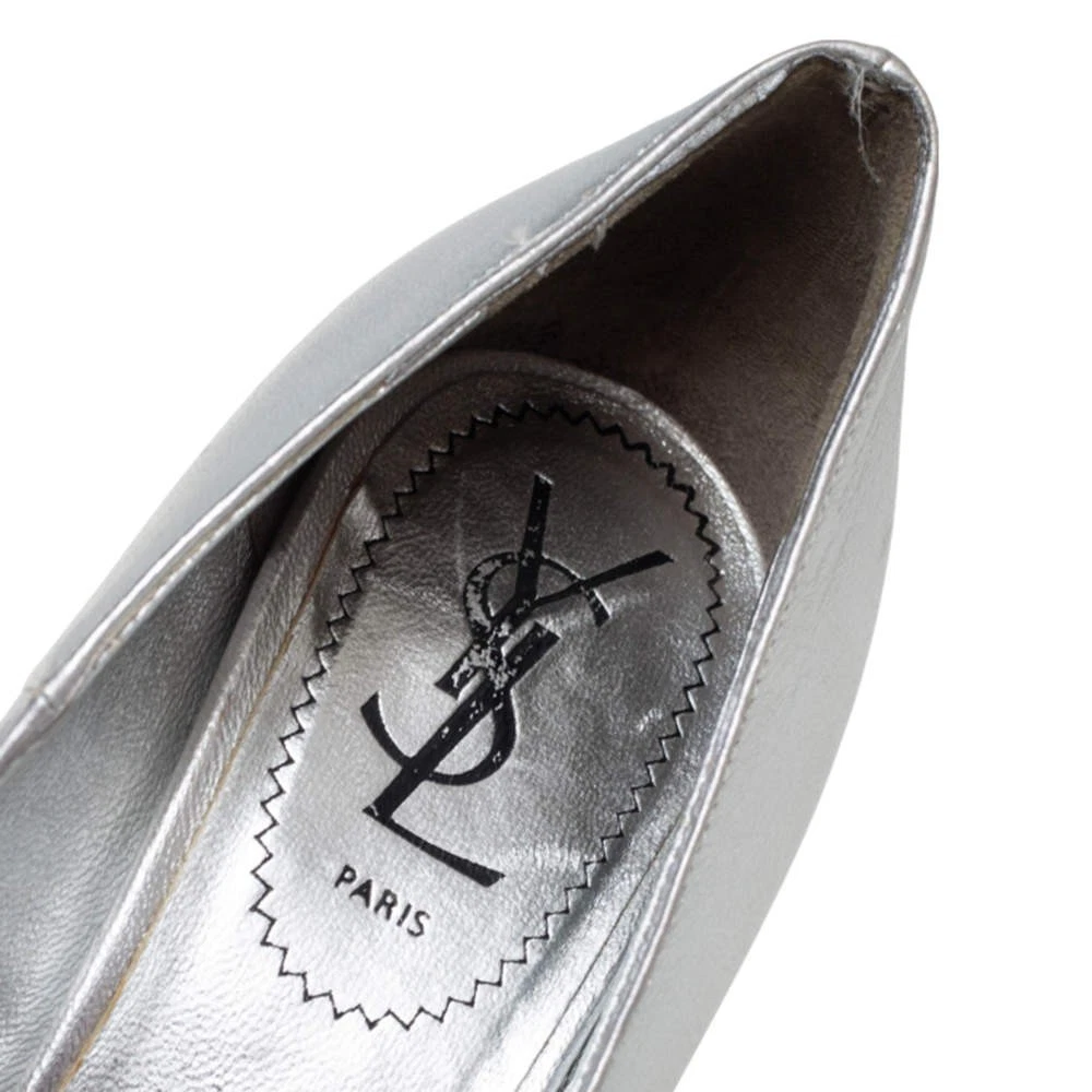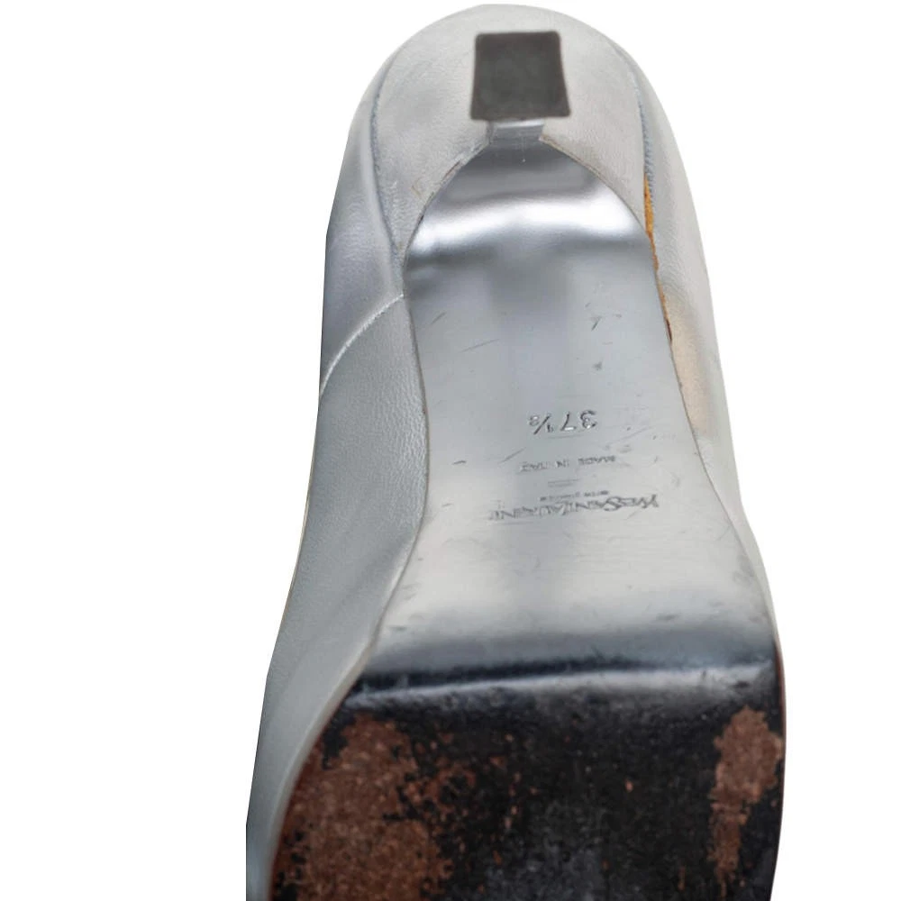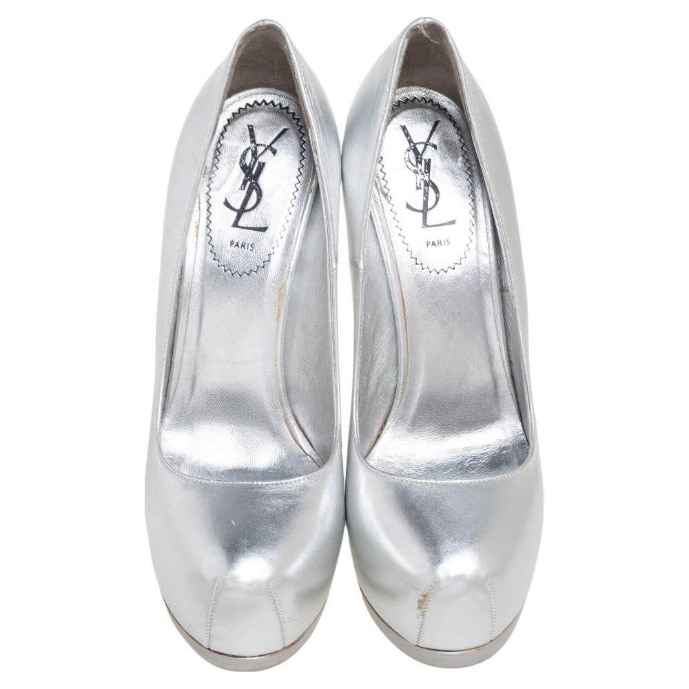 Our eBay Store About Us Contact Us Add to Favorite Sellers Saint Laurent Silver Leather Tribtoo Platform Pumps Size 375 These exquisite Tribtoo pumps from the House of Saint Laurent are perfect for flaunting a glamorous style statement. They are crafted skillfully using silver leather on the exterior and are adorned with rounded toes, platforms, and stunning heels. Pair them with your outfit and appear uber-stylish. Product Details Brand Saint Laurent Paris Color Silver Includes Original Dustbag Outsole Length 21 cm Outsole Width 7.5 cm Size 37.5 Certified by The Luxury Closet This item has gone through a detailed authentication process overseen by our experts. We offer a lifetime guarantee of authenticity on all our items. How We Check The in-house team of experts at The Luxury Closet is highly trained to verify the authenticity and the condition of the luxury products. They ensure that only 100% authentic items are put on sale.The evaluation process is unique with its own mix of assessment criteria and differs according to the category. Each item is evaluated based on the following combination of hallmarks, hardware, stitching, symmetry, material, craftsmanship, stamping, codes, hologram stickers, and packaging. Our authenticators also check if the items have been modified or amended (e.g., aftermarket diamonds, replaced batteries, repaired bags, etc.) International Buyers Import duties, taxes and charges are not included in the item price. These charges are the buyers responsibility. Please check with your country’s customs office to determine what these additional cost will be prior to buying.