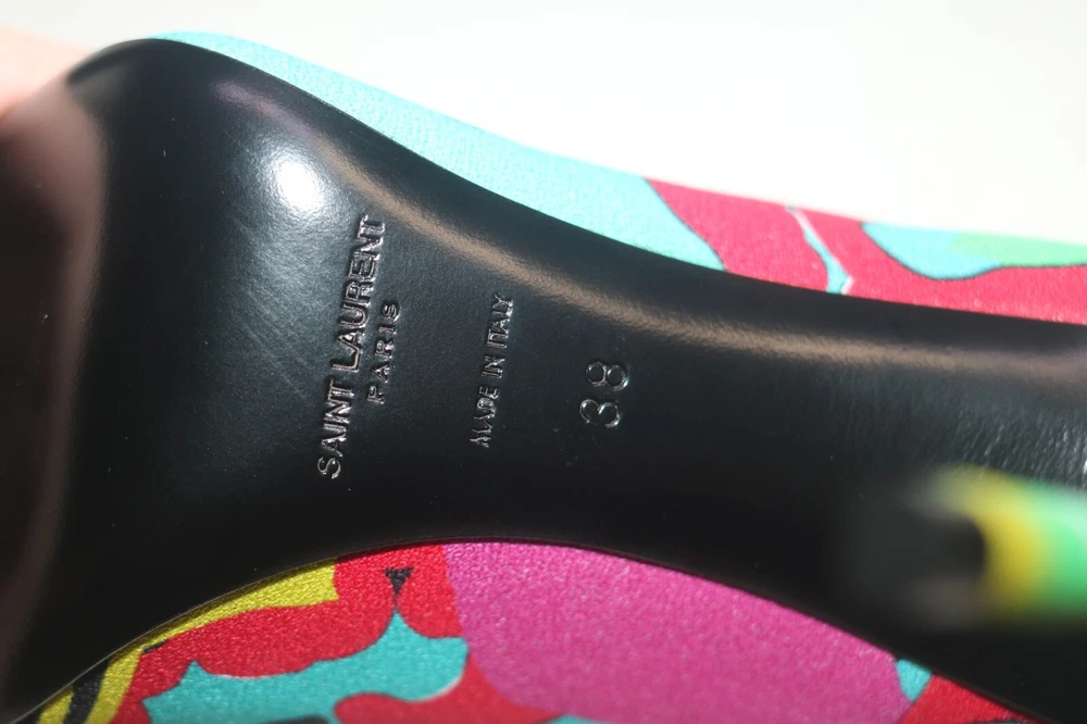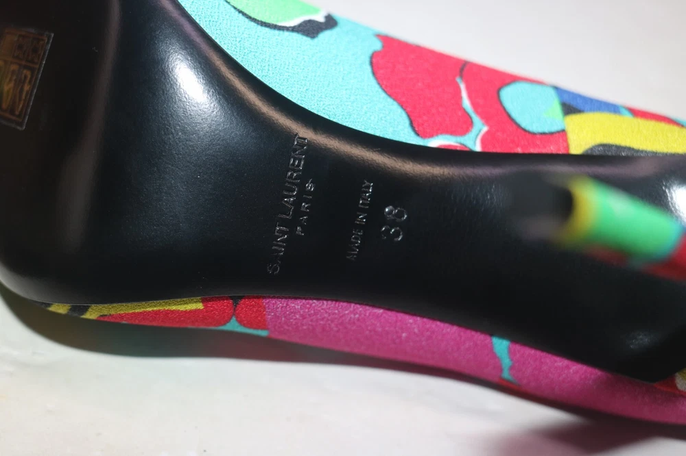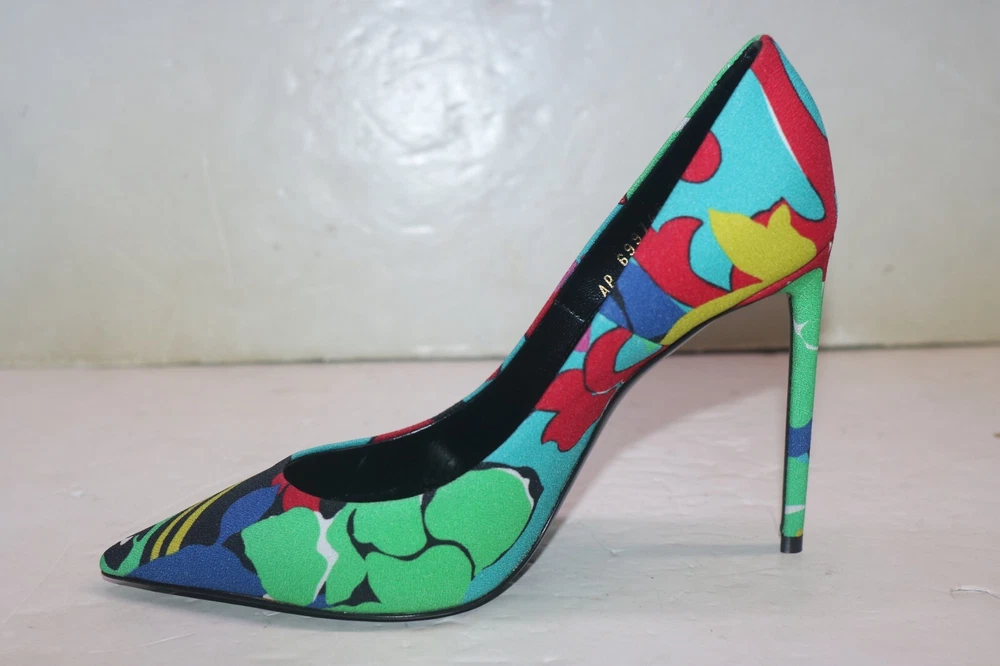 Saint Laurent 105mm Zoe Floral Print Pumps Size 38 THE DETAILS Saint Laurent 105mm Zoe floral-print pumps A signature shoe from Saint Laurent, the Zoe pumps are defined by their timeless pointed-toe silhouette. For SS22, the label updates the style with a vibrant floral print. Made in Italy Highlights Multicolour Leather All-over floral print Pointed toe Branded insole High heel Slip-on style C-3