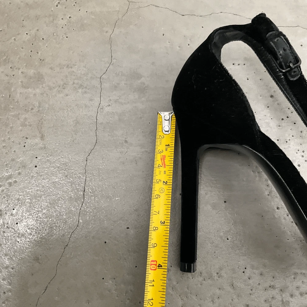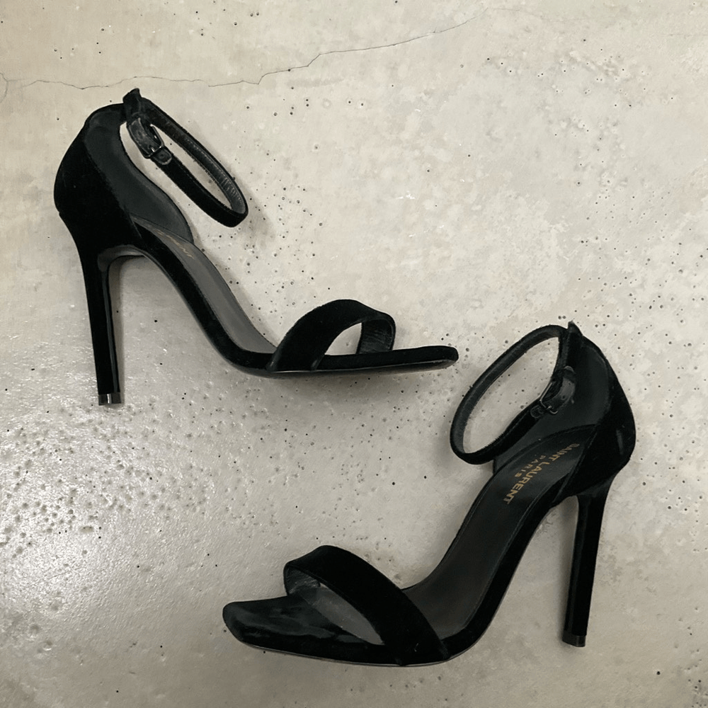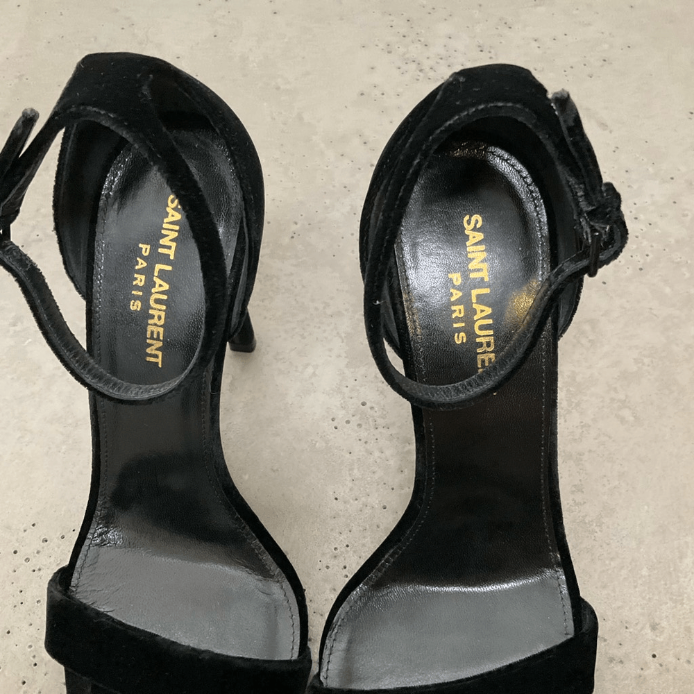 Saint Laurent Velvet Open Toe Heels Strap around toes Strap around ankle with buckle Worn few times See photo for heel height Comes in box with dust bags Color: Black Size: 37 = US 6.5 Excellent Condition