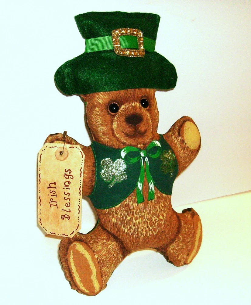St. Patrick's Day Fabric Bear Doll Decor Handmade by seller-- smoke-free home. NOT A TOY * Bear Doll, 13" x 8"--sewn from printed cotton fabric panel. Stuffed with poly-fill. Solid brown fabric back. * I have embellished him with a handmade green felt hat, button eyes, and glittered shamrocks on his vest. * He is holding a paper tag reading "Irish blessings" attached with a rusty pin and signed on the back by maker. ** I will replace tag with one reading "Happy St. Patrick's Day" if buyer would prefer. *** Happy to combine orders to save $$ on shipping . Any questions, just ask. ~~~~~~~~~~~~~~~~~~~~~~~~~~~~~~ US Postal- - shipped within 1-2 business days of payment. Thanks for looking !