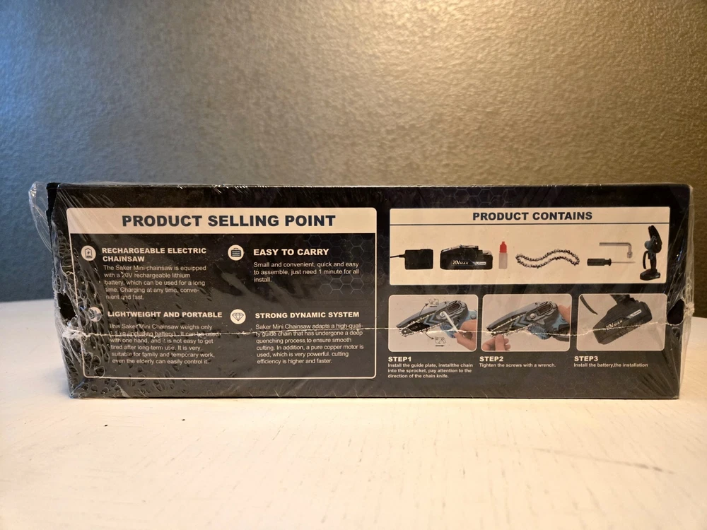 Up for sale is a brand new, unopened Saker Mini Electric Chainsaw. This powerful and convenient mini chainsaw is perfect for light to medium tasks around your yard, garden, or workshop. It's equipped with a rechargeable 20V lithium battery for long-lasting performance, making it portable and hassle-free without the need for cords. Condition: Item: Brand new, unused, in perfect working condition. Box: Original packaging with slight signs of wear and distress on the exterior, but the contents are untouched and factory-sealed. Features: Rechargeable Electric Chainsaw: Comes with a powerful 20V rechargeable lithium battery, ensuring extended use and fast charging capabilities. Lightweight and Portable: Weighs only a few pounds, making it easy to handle with one hand for effortless operation. Perfect for all users, including beginners. Easy to Carry: Quick and easy assembly – requires just one minute to set up, making it ideal for on-the-go use. Strong Dynamic System: Designed with a high-quality guide bar and durable chain for smooth cuts, increased efficiency, and faster cutting speed. What’s Included: 20V lithium battery pack Chain and chain bar (4”/10cm) Charging adapter Chain oil bottle Installation tools Instruction manual Specifications: Brand: Saker Model: Mini Electric Chainsaw Chain Length: 4 inches (10 cm) Power: 20V Lithium Battery Portable, lightweight, and compact design Why You Need It: This Saker Mini Electric Chainsaw is ideal for trimming, cutting small branches, woodworking projects, and much more. Whether you're a DIY enthusiast, gardener, or homeowner, this tool is designed to make your tasks easier and more efficient. Buy it now and don’t miss out on this must-have tool for your toolkit!