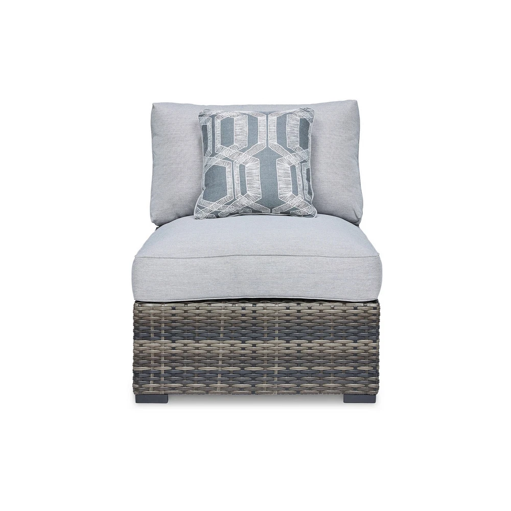 Elevate your patio seating arrangement with this set of two outdoor armless chairs. Crafted with sturdy metal frames, they feature hand woven wicker in a sophisticated gray finish with soft cushions upholstered in stain resistant, fade resistant, and easy to clean fabric for comfort and durability. The set also comes with two throw pillows. Check out our Saki collection for more.FeaturesSet of two outdoor armless chairs Rust free, powder coated aluminum frames Handwoven all-weather resin wicker for enhnaced durabilityGray finishStain, fade and UV resistant, high performance Nuvella polyester upholsteryStainless steel hardwareBlack finished block legsCheck our Saki collection for more matching set pieces29L x 34.5W x 34H, Seat width: 29, Seat depth: 21.5, Seat height: 19.25, in inches Free Shipping Over $49.99* Details Saki 35 Inch Outdoor Armless Chair Set of 2 with 2 Pillows, Wicker, Gray Product Description: Elevate your patio seating arrangement with this set of two outdoor armless chairs. Crafted with sturdy metal frames, they feature hand woven wicker in a sophisticated gray finish with soft cushions upholstered in stain resistant, fade resistant, and easy to clean fabric for comfort and durability. The set also comes with two throw pillows. Check out our Saki collection for more. Features Set of two outdoor armless chairs Rust free, powder coated aluminum frames Handwoven all-weather resin wicker for enhnaced durability Gray finish Stain, fade and UV resistant, high performance Nuvella polyester upholstery Stainless steel hardware Black finished block legs Check our Saki collection for more matching set pieces 29L x 34.5W x 34H, Seat width29, Seat depth21.5, Seat height19.25, in inches