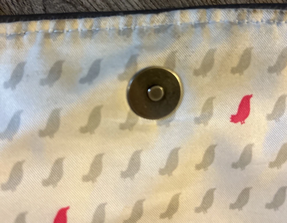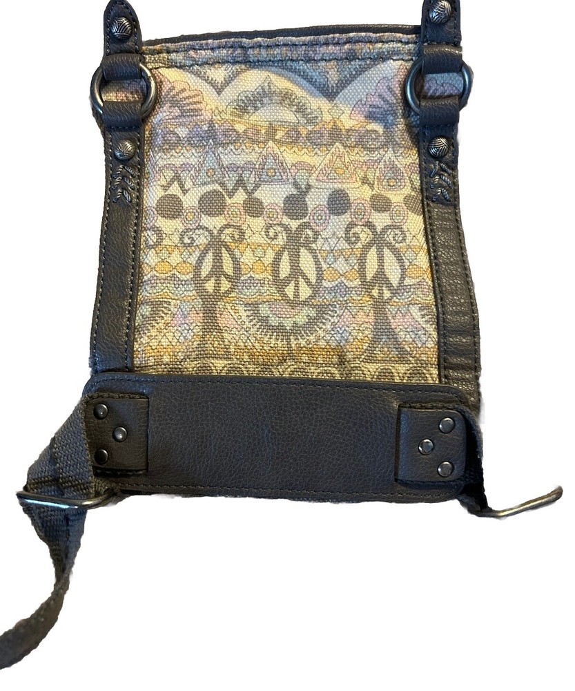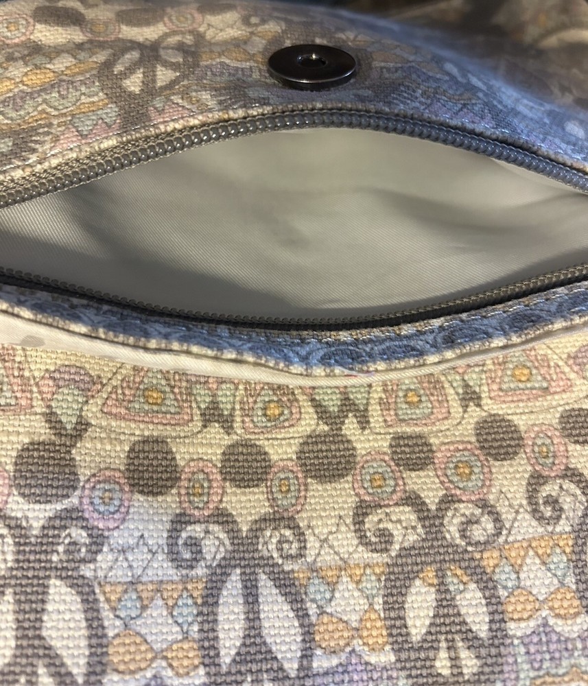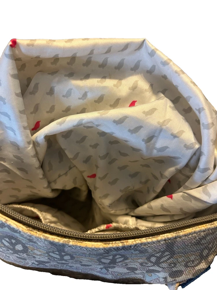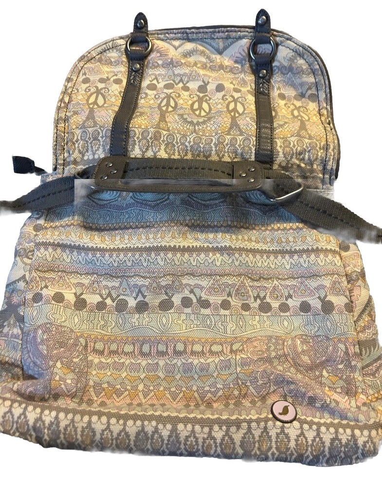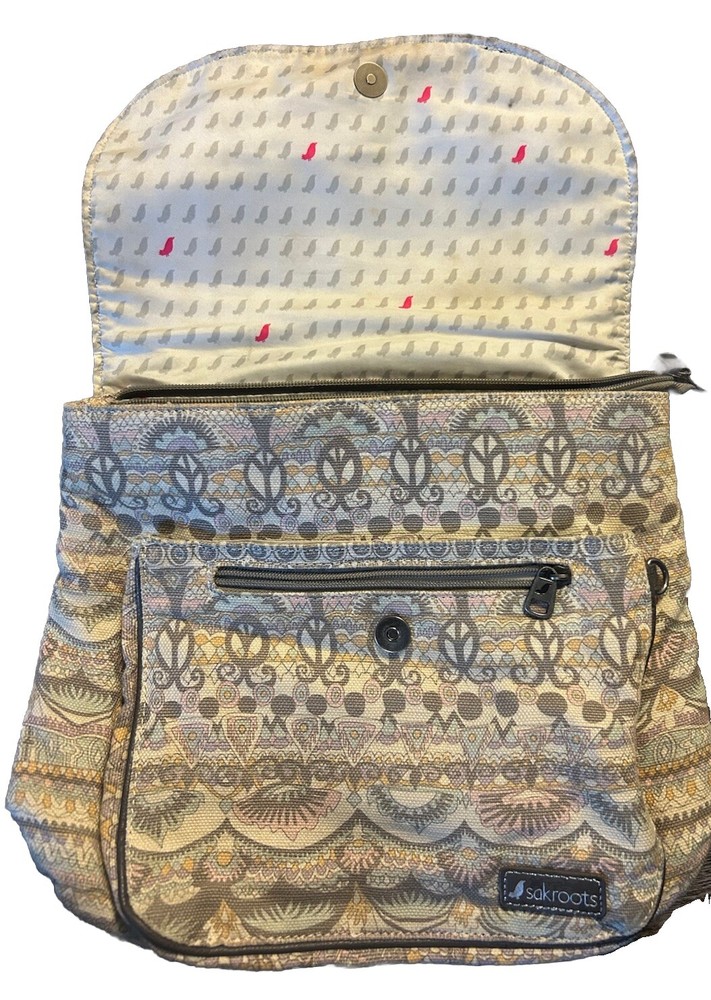 The backpack has zippers and pockets to keep your things organized. There is an ink stain inside. But don't worry, it doesn't affect the overall look of the backpack. See the photos to get a better idea of the item. This Sakroots backpack purse is a stylish and practical choice for any woman on-the-go.