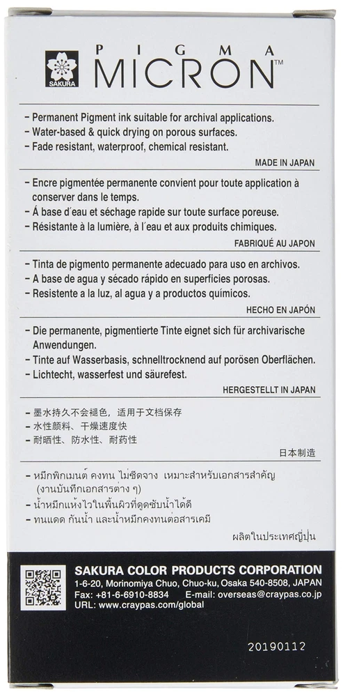 The Pigma Micron pen is and has been the popular choice of artists and illustrators for drawing, sketching and fine line detail. However, it is also a popular choice for journaling, on planner pages, on scrapbook pages, and doing Zentangle(R) designs. Due to it's archival permanent ink, this pen is a perfect choice for using on legal documents & checks, maps, as well as laboratory notebooks, journals and log books. Micron pens are for use on papers, and will not bleed through most papers including thin papers such as bible pages. The ink is also water, fade and chemical resistant, and will not smear or feather when dry. The pen can be used on fabrics & quilt patches, as long as the material will not be washed. Non-toxic and safe to use as intended. Fineliner Porous-Point Pen Tip Size 01 is 0.25mm Black ink is archival permanent quality ink is water, fade, and chemical resistant Box of 12 pens