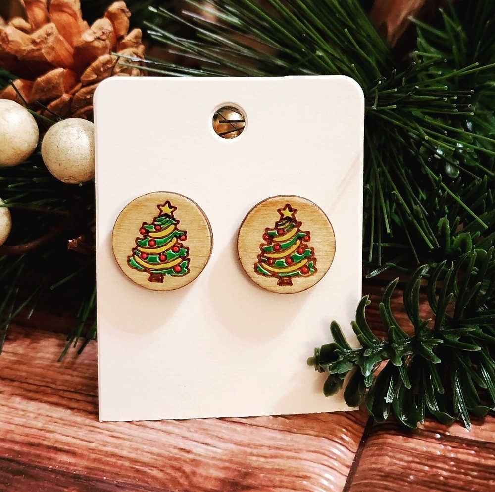 Christmas Tree stud earrings Laser cut, engraved and handpainted Earrings measure 1/2" Nickel Free backing Light weight for daily wear Please do not submerge earrings in water. Gently wipe with damp rag °°°°°°°°°°°°°°°°°°°°°°°°°°°°°°°°°