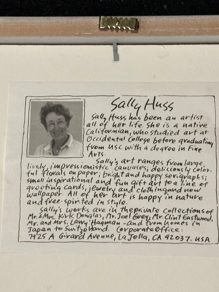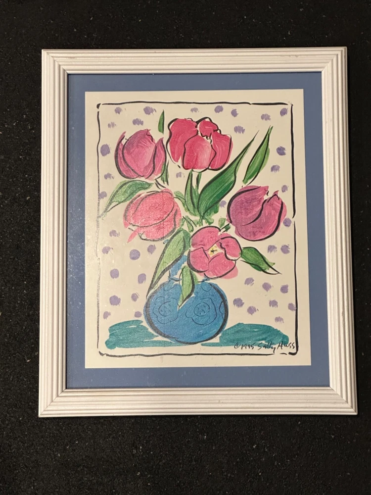 This beautiful framed artwork by Sally Huss is a stunning addition to any art collection. The piece features a vibrant arrangement of flowers in a blue vase, produced in 1995. The artist's signature is prominently displayed, and the piece is framed to perfection. This print is a true gem for those who appreciate fine art, and would make a wonderful gift for a loved one or a collector.