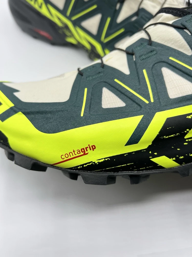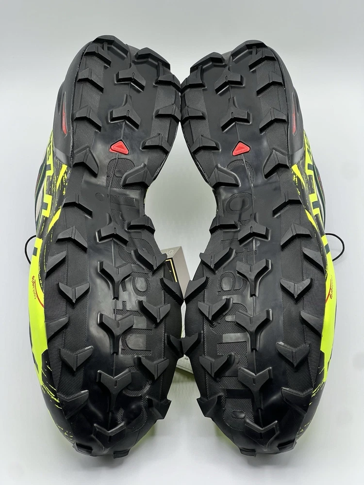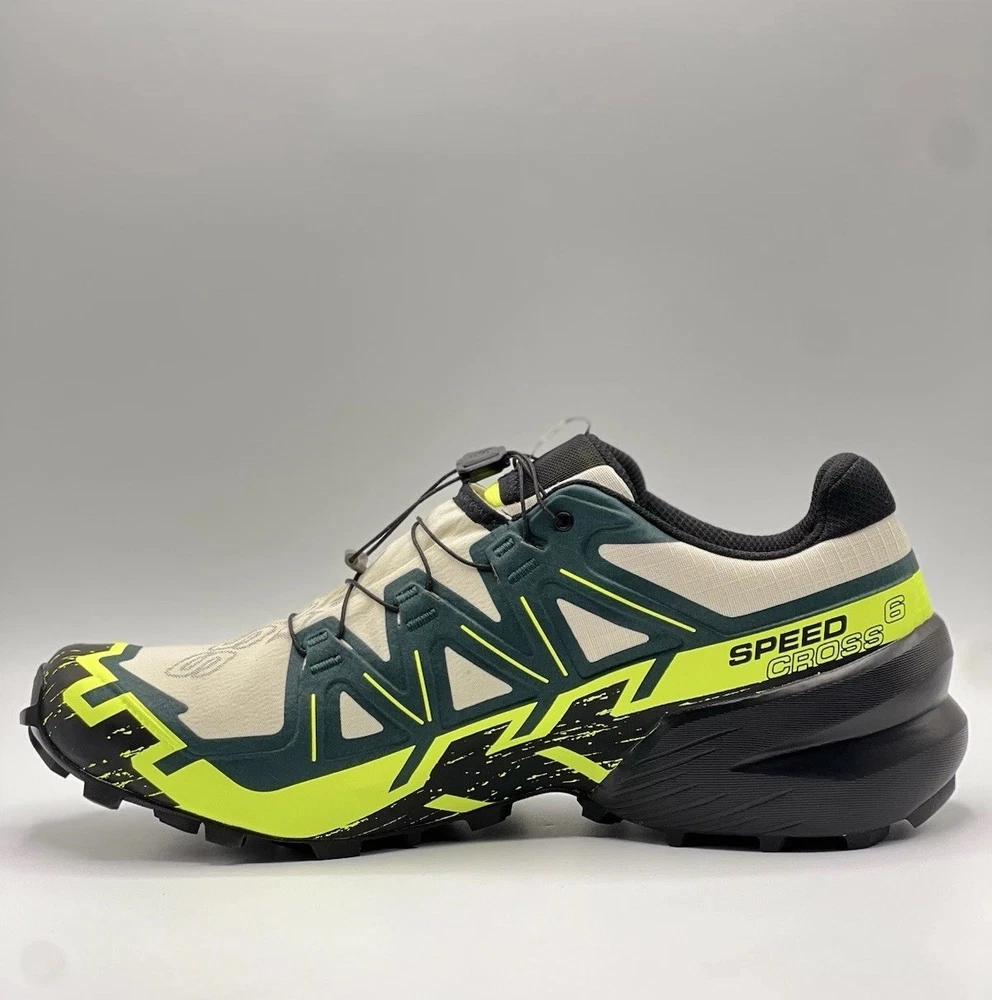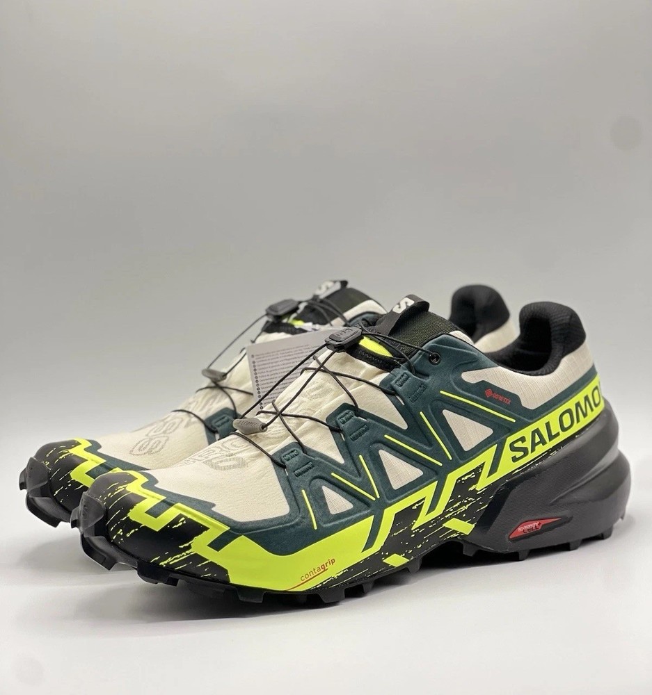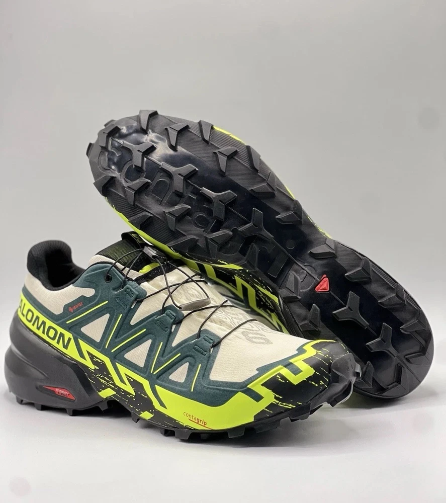 Experience the great outdoors with these Salomon Speedcross 6 sneakers. Designed for men, these athletic shoes come in a vibrant green color with a colorblock pattern. The Goretex upper material is waterproof and lightweight, making them perfect for hiking, trail running, and cross-training activities. These sneakers feature a low-top shoe shaft style and standard shoe width, with a cushioned and adjustable fit that provides comfort and performance. The rubber outsole material is suitable for gym and training, walking, school, and running and jogging. These Salomon Speedcross 6 sneakers are perfect for those who love nature and sports.