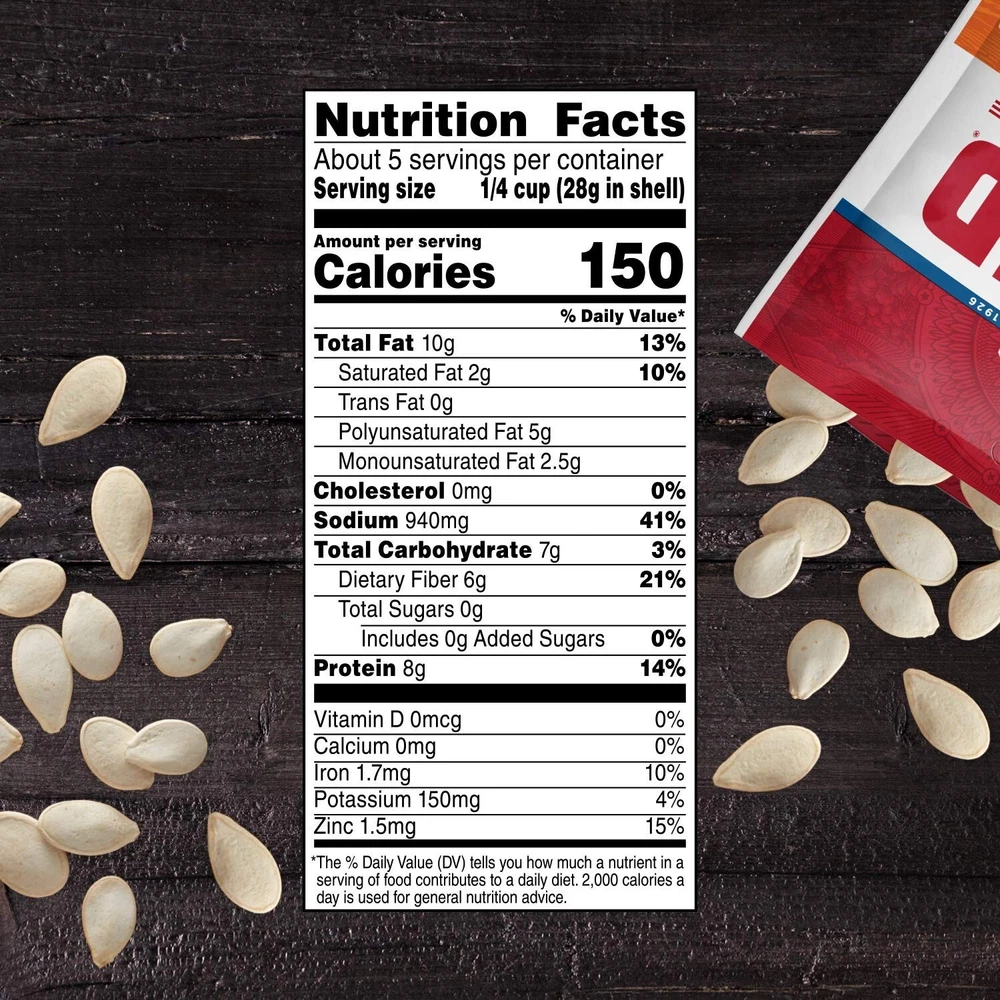 Salted and Roasted Pumpkin Seeds, Keto Friendly Snack, 5 OZ Bags, 12 Pack Twelve 5 oz bags of Salted and Roasted Pumpkin Seeds Delicious salted and roasted pumpkin seeds make for a tasty and salty snack Pumpkin seeds are roasted and salted to perfection for an authentic homestyle flavor Whole roasted pumpkin seeds are ready to eat right out of the bag Gluten free snacks that are made with no artificial flavors or colors, and are a good source of protein, iron and zinc Grab a bag of Salted and Roasted Pumpkin Seeds for a deliciously salty and crunchy snack anytime. These roasted and salted pumpkin seeds are ready to enjoy for a quick, delicious snack. DAVID pumpkin seeds are a gluten free, keto friendly snack (8g of protein, 1g net carbs [7g total carbs minus 6g dietary fiber], and 0g added sugar per serving) and fit a low carb lifestyle (1g net carbs [7g total carbs minus 6g dietary fiber]). Made with quality ingredients for an authentic homestyle flavor, these gluten free snacks contain no artificial flavors or colors, and they're a good source of protein, iron and zinc. Grab pumpkin seeds for a crunchy and tasty treat anytime. They're a great on-the-go snack to enjoy at the office or while traveling. These salty snacks come sealed in a bag to keep them fresh and make them portable. Since 1926, have provided a quality difference that you can taste with select top-quality seeds, roasted and seasoned to perfection.