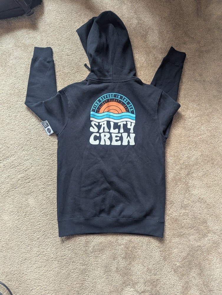 Elevate your activewear collection with the Salty Crew Zip Up Hoodie. Designed for both style and comfort, this black hoodie features a sleek solid pattern and is crafted from durable polyester material. It's a versatile piece that can be worn for a variety of outdoor activities, especially during the cooler months of summer, spring, and fall. The full zip closure allows for easy layering, while the hooded design provides extra protection against the elements. Long sleeves ensure ample coverage, making it an ideal choice for beach outings or any casual adventure. The hoodie is machine washable for effortless care and sports the brand's signature logo accent for a touch of brand prestige.