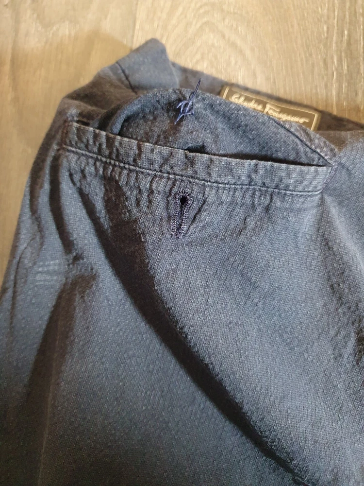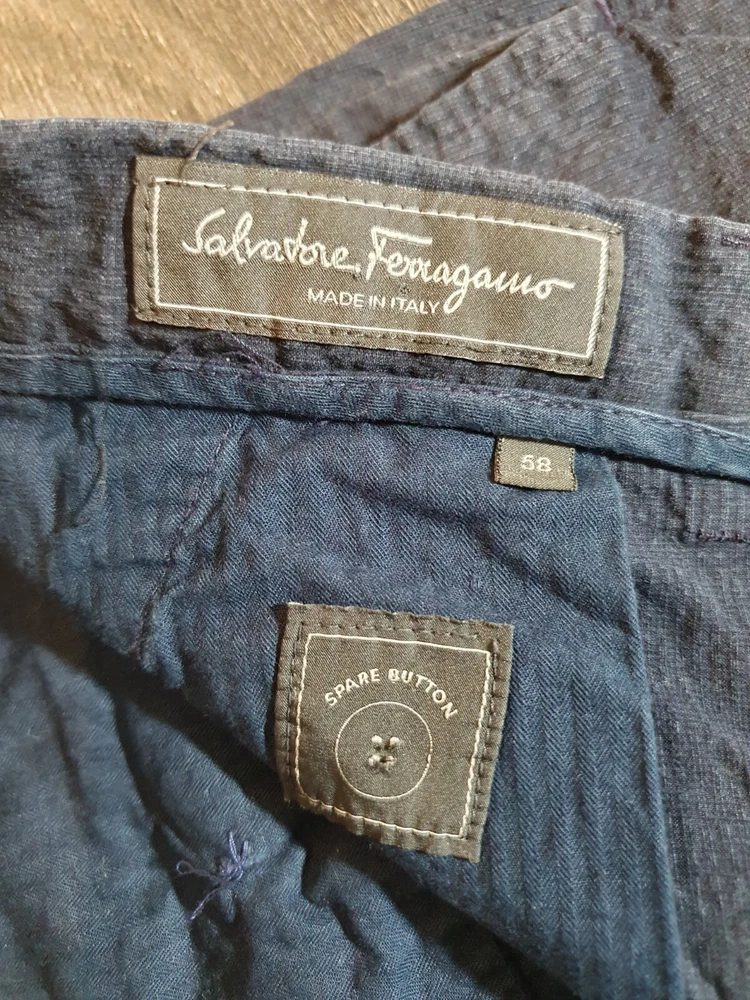 These Salvatore Feragamo linen trousers in a relaxed fit, size regular, are a stylish addition to any wardrobe. With a zip closure and waist size of 39 inches, they provide comfort and flexibility. The trousers have a stylish chino design and are made of high-quality linen material in a beautiful blue shade.