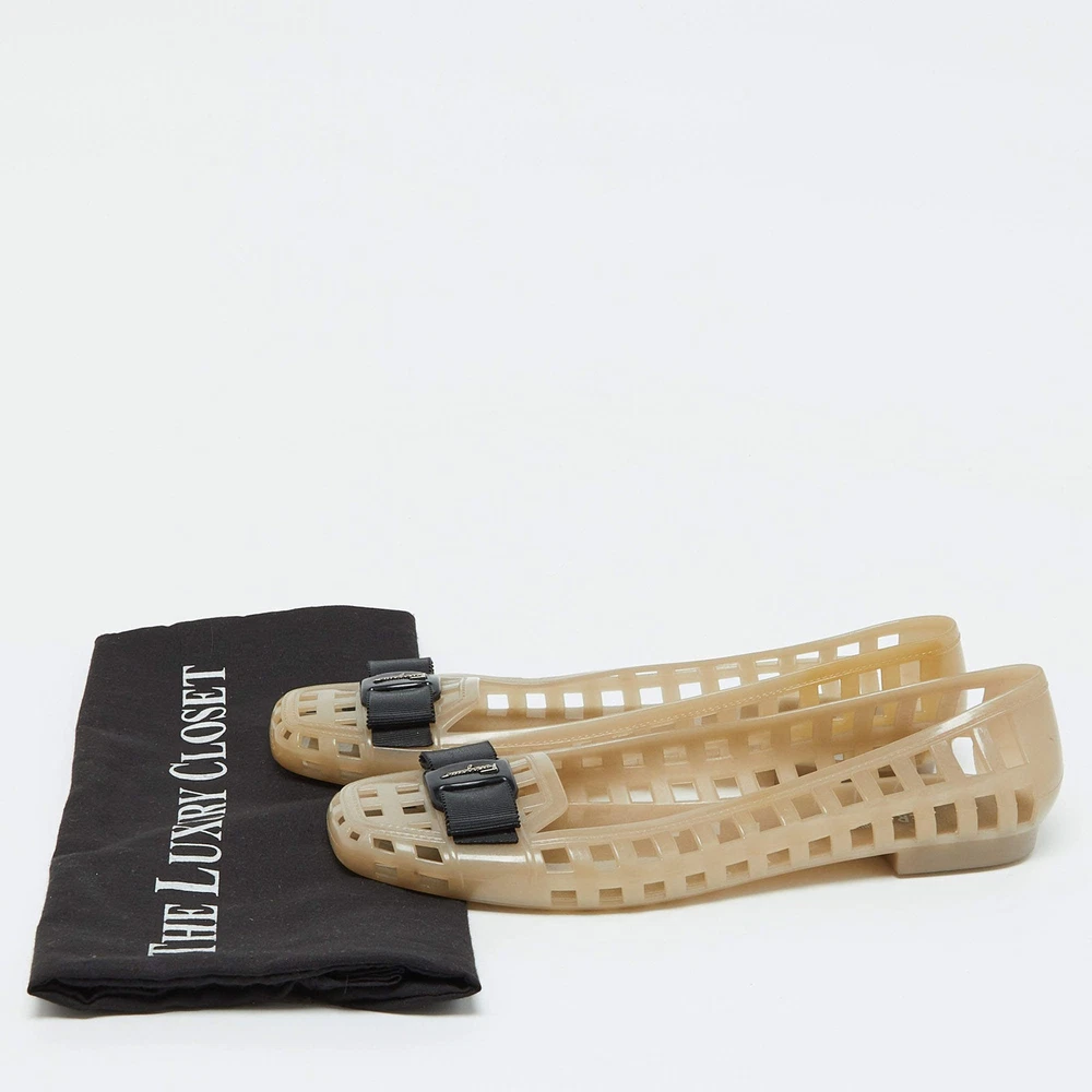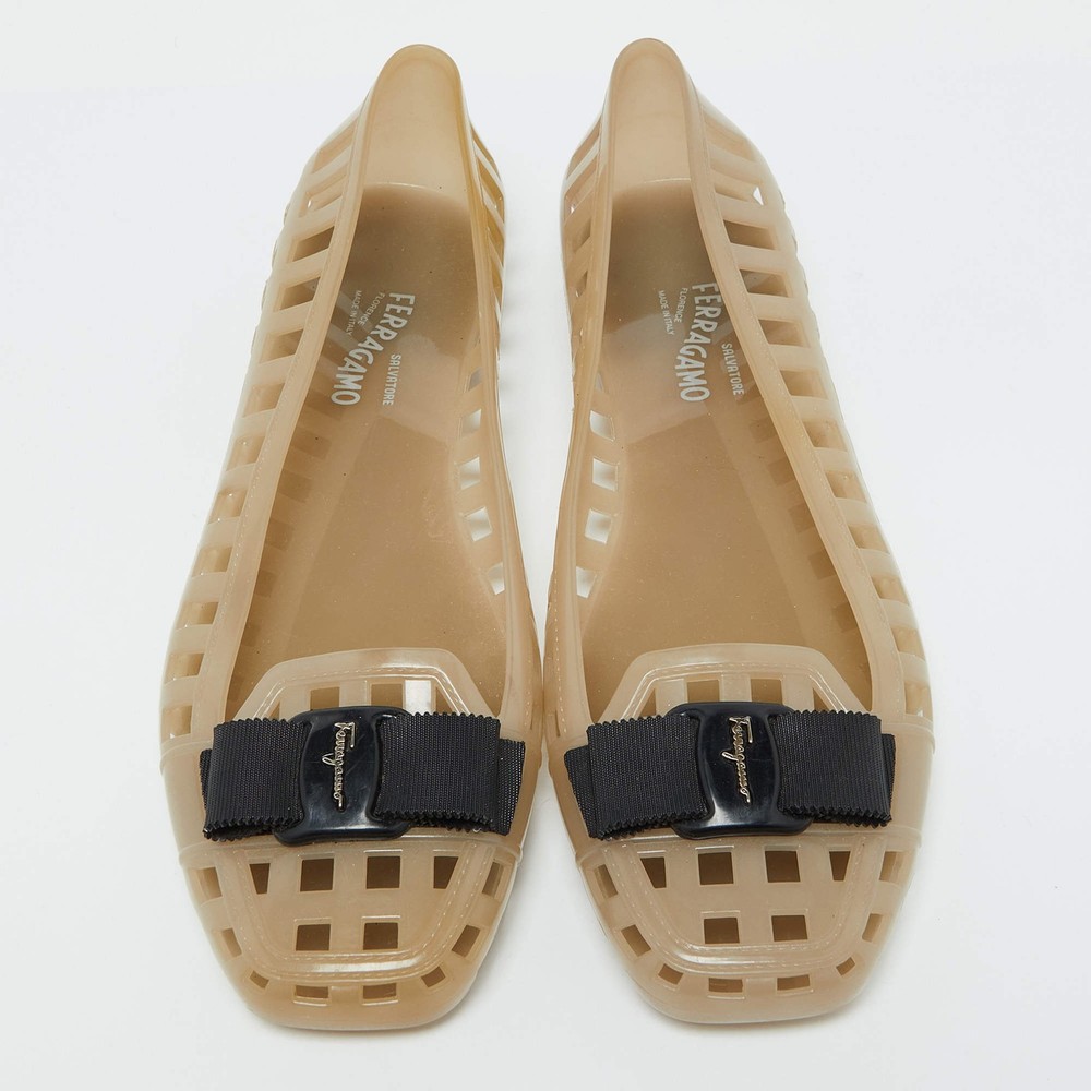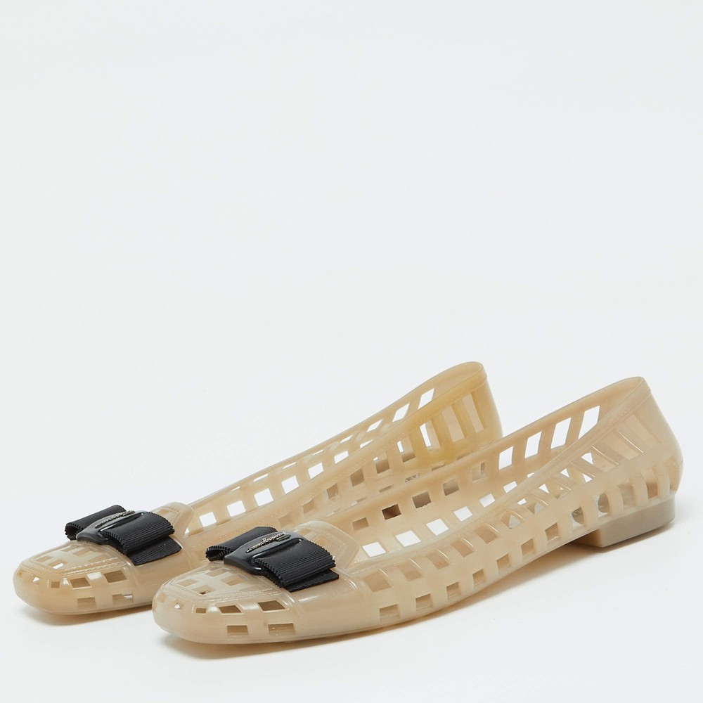 Our eBay Store About Us Contact Us Add to Favorite Sellers Salvatore Ferragamo Beige Jelly Laser CutOut Bow Ballet Flats Size 405 Defined by comfort and effortless style, no wardrobe is ever complete without a pair of chic ballet flats. This pair is lovely to look at and is equipped with elements like a comfortable insole and a durable sole. Product Details Brand Salvatore Ferragamo Color Beige Includes The Luxury Closet Packaging Outsole Length 26 cm Outsole Width 8 cm Size US 10 (EU 40.5/UK 7.5) Certified by The Luxury Closet This item has gone through a detailed authentication process overseen by our experts. We offer a lifetime guarantee of authenticity on all our items. How We Check The in-house team of experts at The Luxury Closet is highly trained to verify the authenticity and the condition of the luxury products. They ensure that only 100% authentic items are put on sale.The evaluation process is unique with its own mix of assessment criteria and differs according to the category. Each item is evaluated based on the following combination of hallmarks, hardware, stitching, symmetry, material, craftsmanship, stamping, codes, hologram stickers, and packaging. Our authenticators also check if the items have been modified or amended (e.g., aftermarket diamonds, replaced batteries, repaired bags, etc.) International Buyers Import duties, taxes and charges are not included in the item price. These charges are the buyers responsibility. Please check with your country’s customs office to determine what these additional cost will be prior to buying.