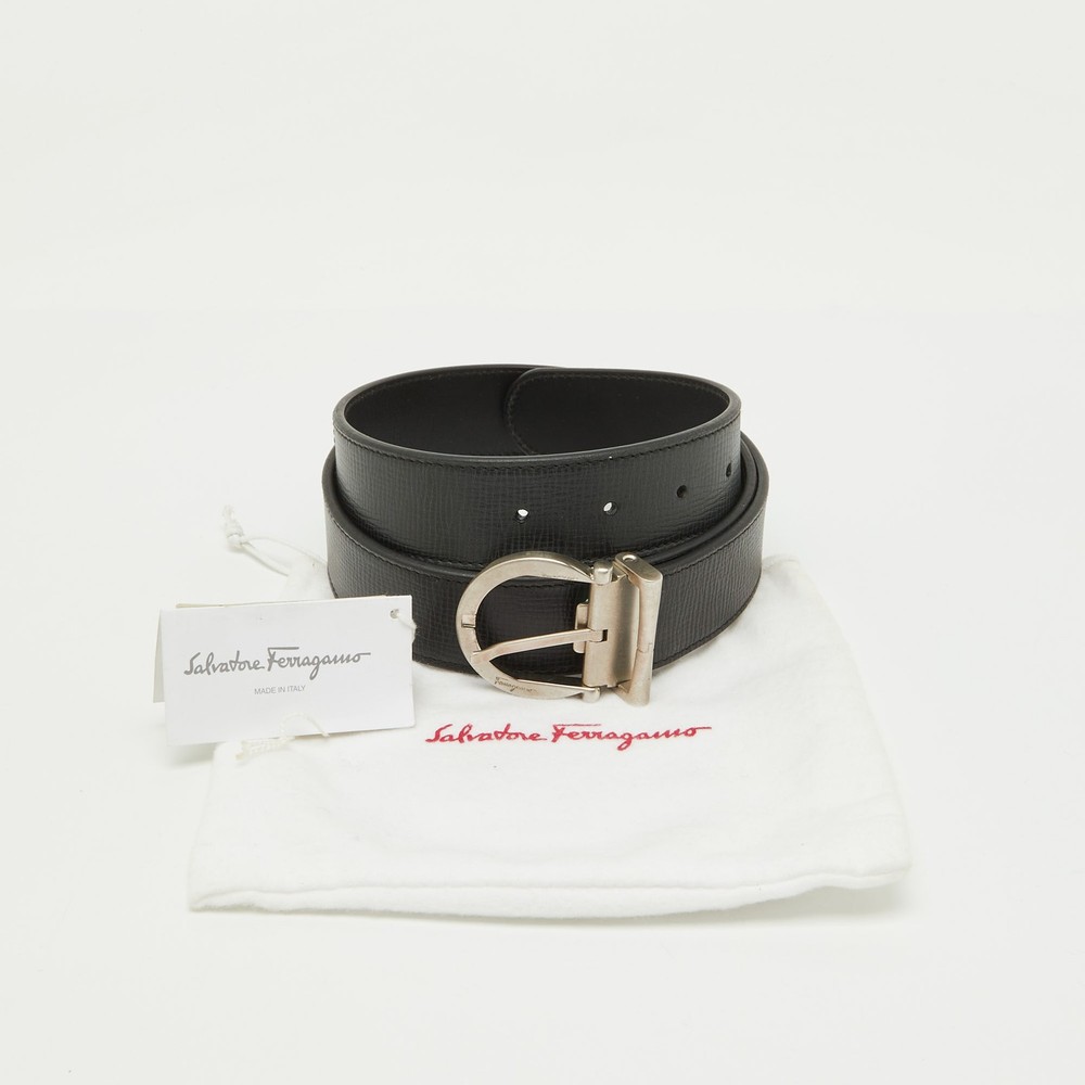 Indulge in Italian sophistication with this versatile black leather belt, masterfully crafted by Salvatore Ferragamo. Designed to elevate any ensemble, this mens accessory boasts a sleek reversible buckle, allowing effortless transitions between styles. Crafted from luxurious leather inside and out, it offers unparalleled durability and elegance. Perfect for the discerning gentleman who values timeless style and impeccable Italian craftsmanship, it is the ultimate statement of refined taste. Ideal for complementing both formal and casual attire.Certified by The Luxury Closet - This item has gone through a detailed authentication process overseen by our experts. We offer a lifetime guarantee of authenticity on all our items. Import duties, taxes and charges are not included in the item price. These charges are the buyers responsibility. Please check with your country’s customs office to determine what these additional cost will be prior to buying. Our eBay Store About Us Contact Us Add to Favorite Sellers Salvatore Ferragamo Black Leather Cut to Size Reversible Buckle Belt $196.9 Indulge in Italian sophistication with this versatile black leather belt, masterfully crafted by Salvatore Ferragamo. Designed to elevate any ensemble, this mens accessory boasts a sleek reversible buckle, allowing effortless transitions between styles. Crafted from luxurious leather inside and out, it offers unparalleled durability and elegance. Perfect for the discerning gentleman who values timeless style and impeccable Italian craftsmanship, it is the ultimate statement of refined taste. Ideal for complementing both formal and casual attire. Product Details Brand Color Black Dimensions Height: 3.5 cm, Length: 90 cm Material Leather Size Outsole Width Outsole Length Heel Height Includes Original Dustbag, Brand Tag Certified by The Luxury Closet This item has gone through a detailed authentication process overseen by our experts. We offer a lifetime guarantee of authenticity on all our items. How We Check The in-house team of experts at The Luxury Closet is highly trained to verify the authenticity and the condition of the luxury products. They ensure that only 100% authentic items are put on sale.The evaluation process is unique with its own mix of assessment criteria and differs according to the category. Each item is evaluated based on the following combination of hallmarks, hardware, stitching, symmetry, material, craftsmanship, stamping, codes, hologram stickers, and packaging. Our authenticators also check if the items have been modified or amended (e.g., aftermarket diamonds, replaced batteries, repaired bags, etc.) International Buyers Import duties, taxes and charges are not included in the item price. These charges are the buyers responsibility. Please check with your country’s customs office to determine what these additional cost will be prior to buying.