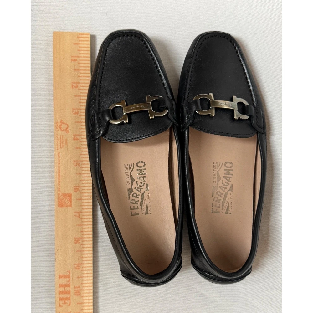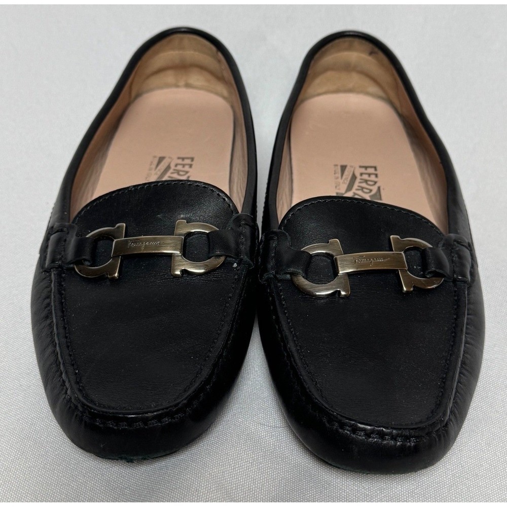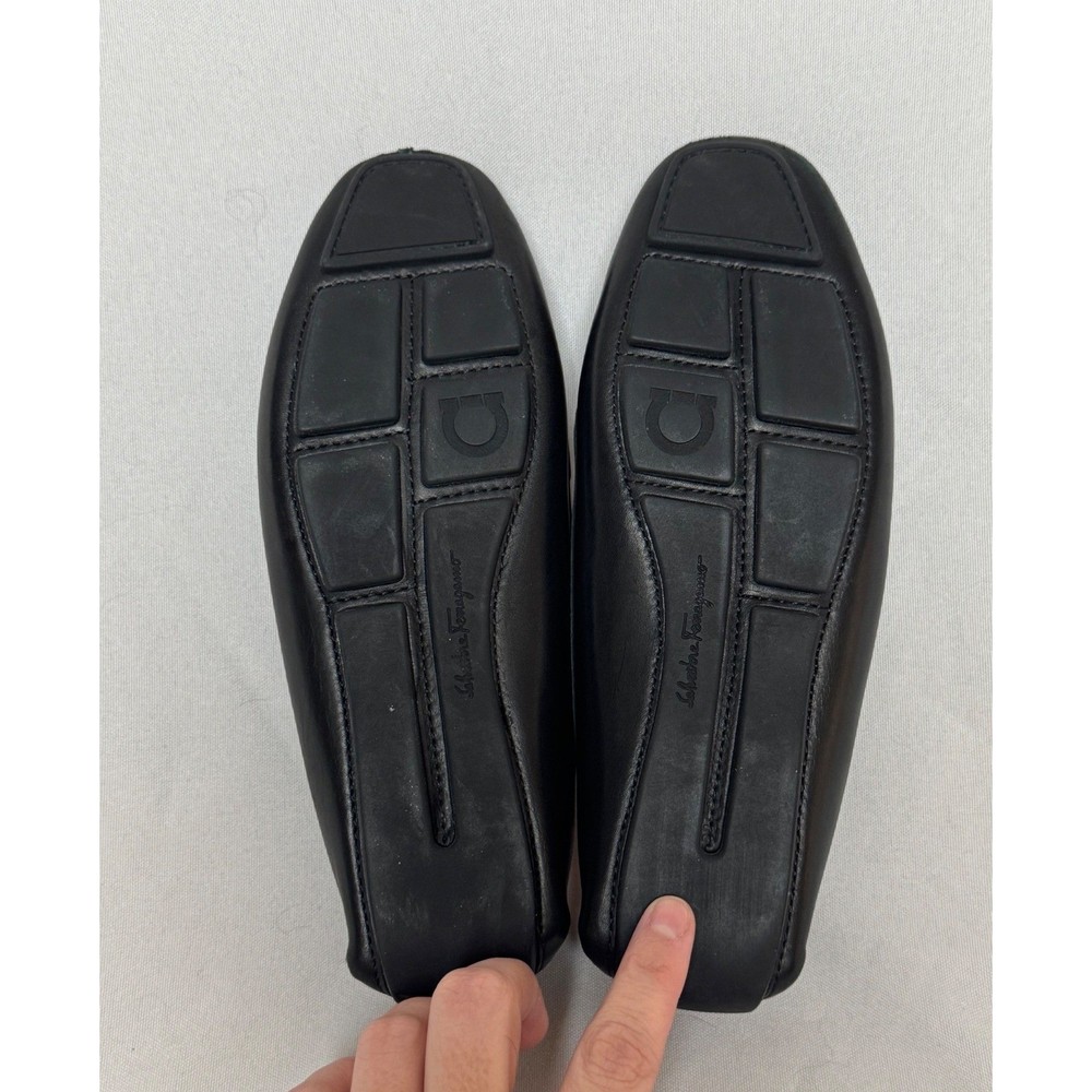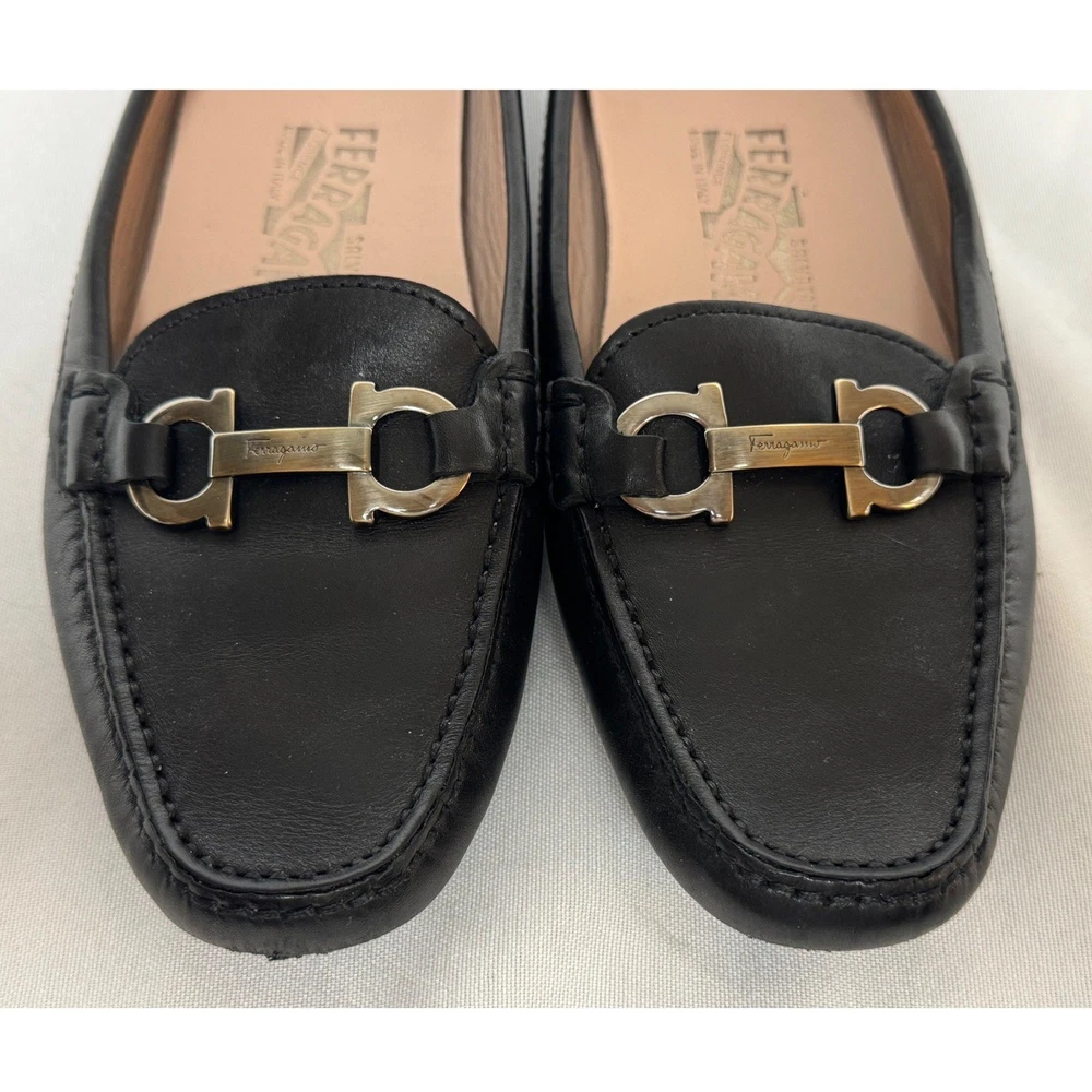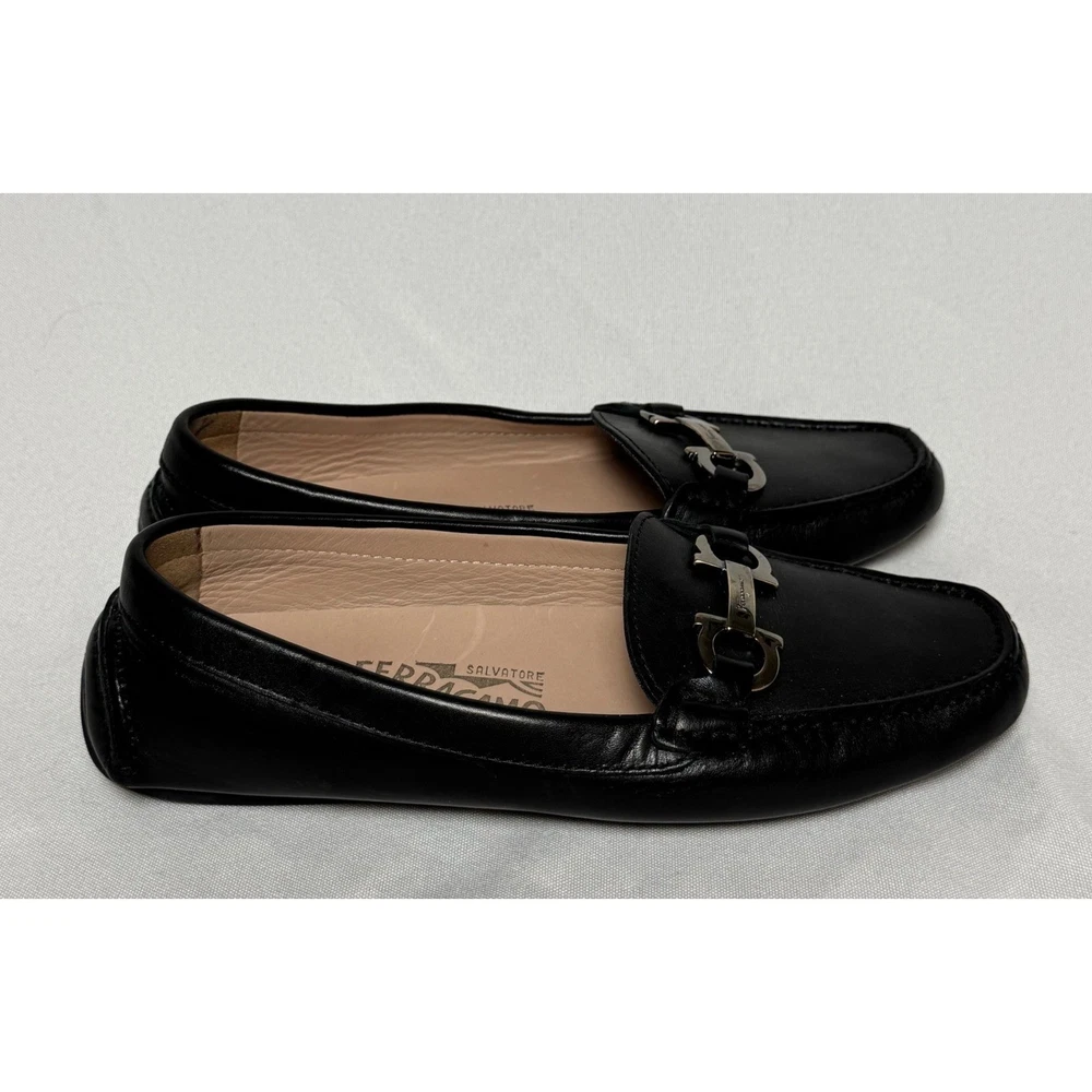 Salvatore Ferragamo Gancini loafers in smooth black leather offer a timeless silhouette with sophisticated silver-tone hardware. These Italian-crafted driving shoes feature the iconic double Gancini bit detail across the vamp and a pebbled rubber sole for comfort and durability. The interior is lined with supple tan leather, showcasing the brand's commitment to luxury craftsmanship. Measurements: • Insole Length: 9.25" Brand: Salvatore Ferragamo Material: Leather Color: Black Style: Loafers Hardware: Silver-tone Gancini Sole: Rubber Driving Sole Origin: Made in Italy Model Number: SN 34468 Keywords: Designer, Luxury, Italian, Quiet Luxury, Old Money, Professional, Business Casual, Classic, Minimalist, Preppy, Office Wear, Travel, Comfortable, Sophisticated