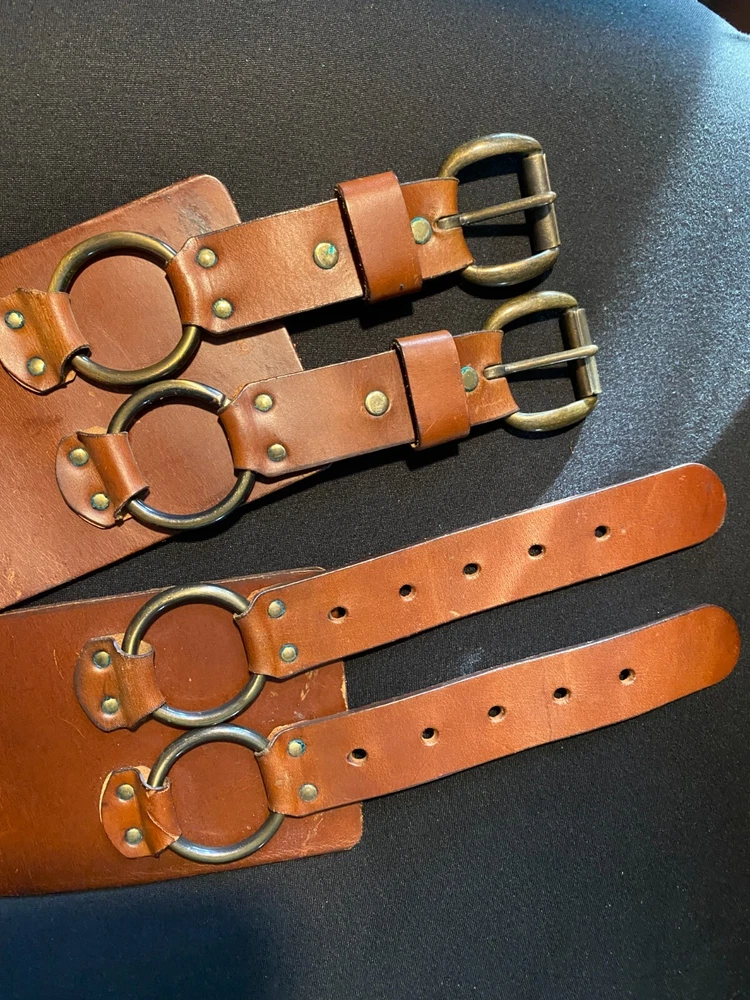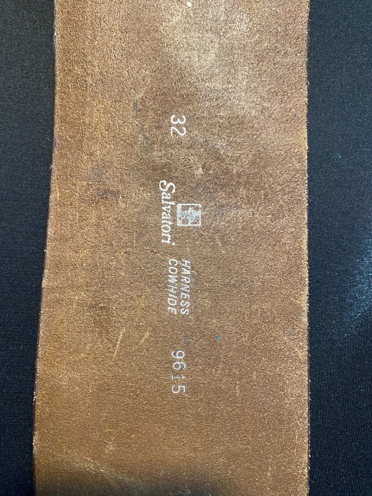 The Salvatori Belt Girdle Corset is a vintage-style belt made of solid brown cowhide leather with brass buckle accents. It is a unisex size 32 belt suitable for both men and women. The belt is designed with a classic theme and can be adjusted for a comfortable fit. This authentic Salvatori belt exudes a timeless and stylish appeal perfect for adding a touch of sophistication to any outfit.